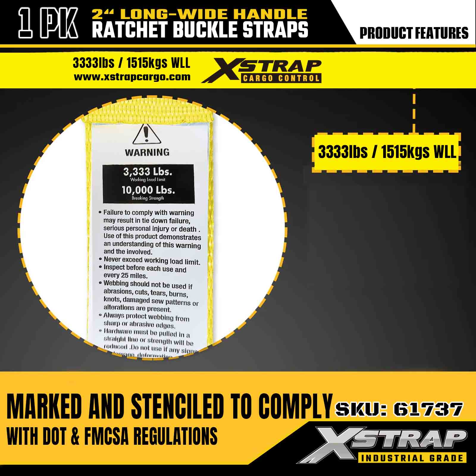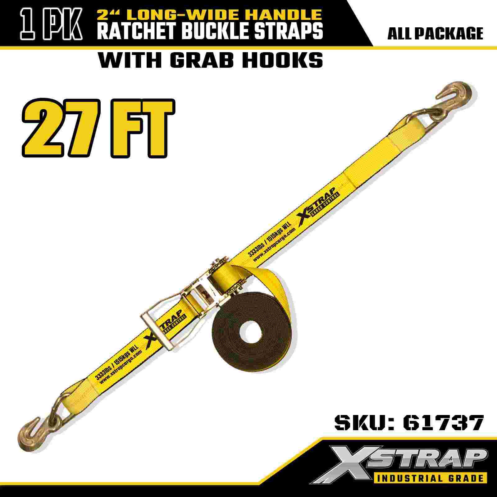 Xstrap 61737 Heavy Duty 2" x 27' 1PK Dây đeo bánh cóc có móc nắm Màu vàng, WLL 3.333 lbs, Dây đeo bánh cóc có tay cầm rộng dài Dây đeo cho Máy móc & Thiết bị