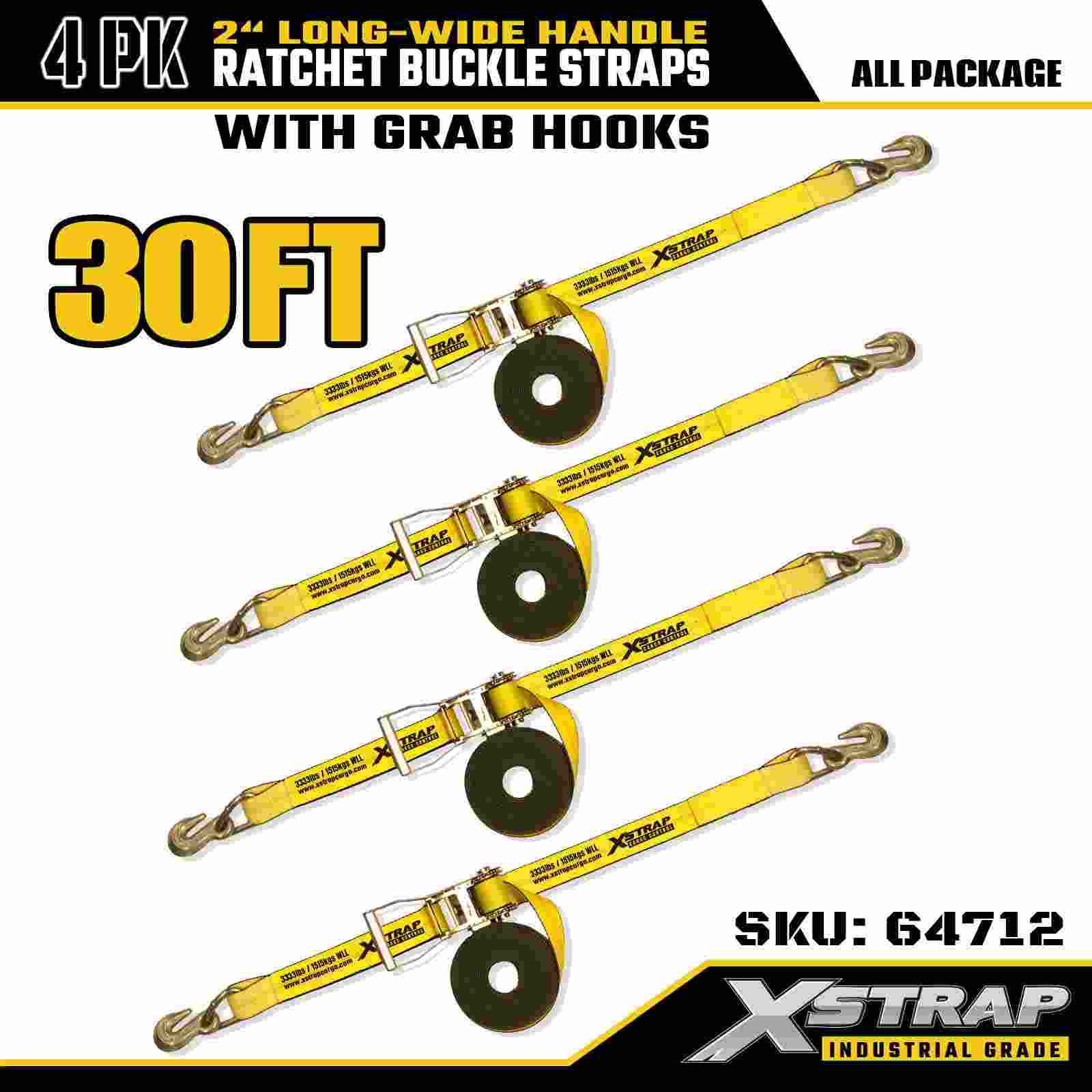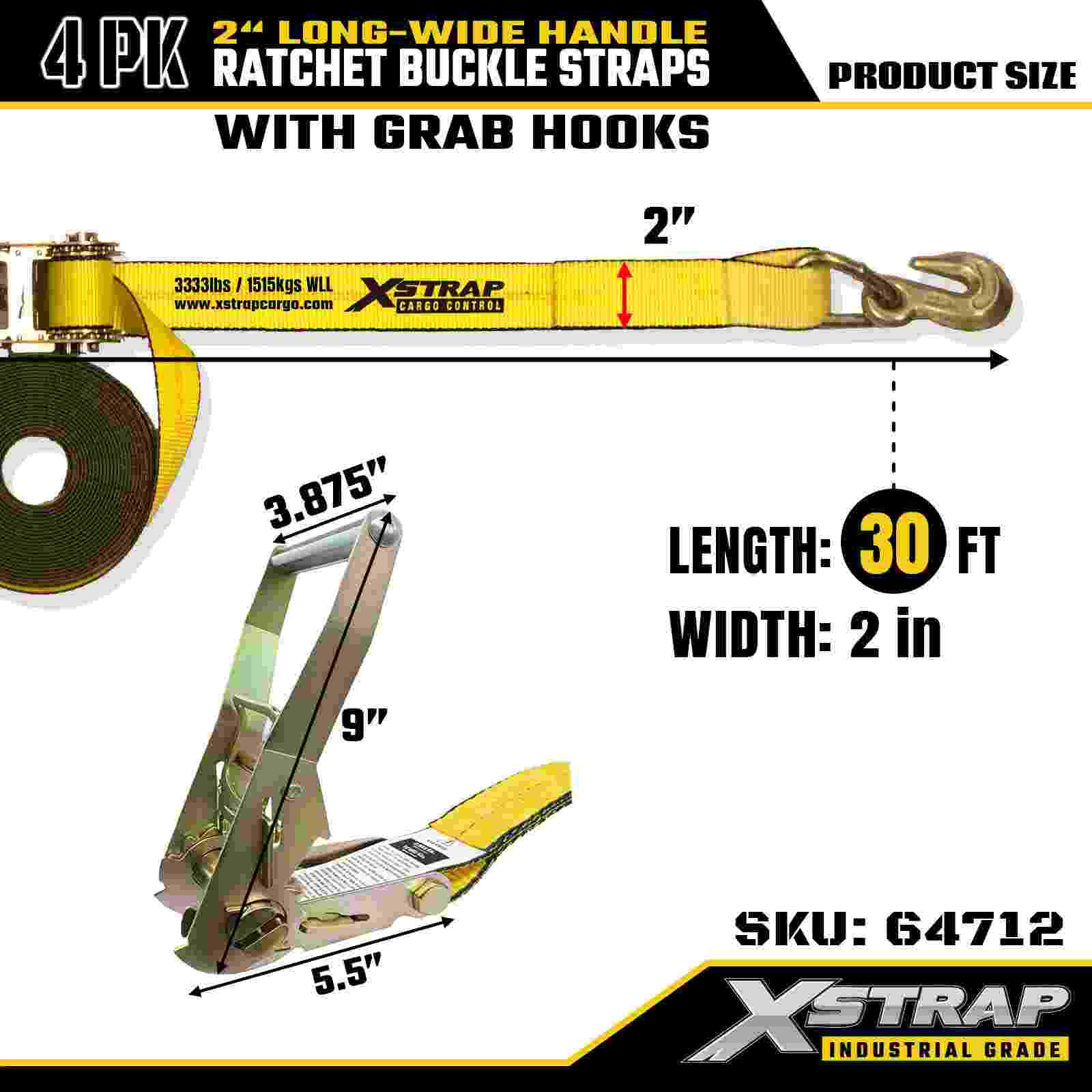 Xstrap 64712 2" x 30ft Dây đai khóa bánh cóc có tay cầm rộng (4 gói) - Móc nắm, công suất 10.000 lbs, dây buộc hạng nặng để vận chuyển thiết bị lớn