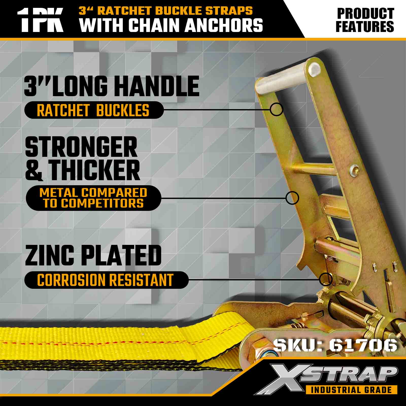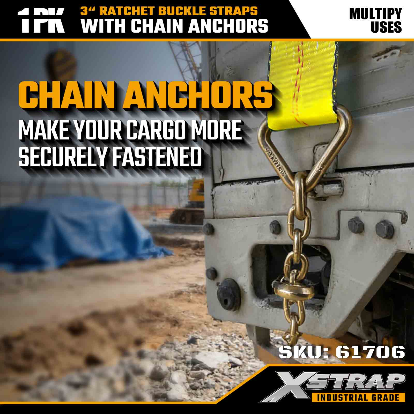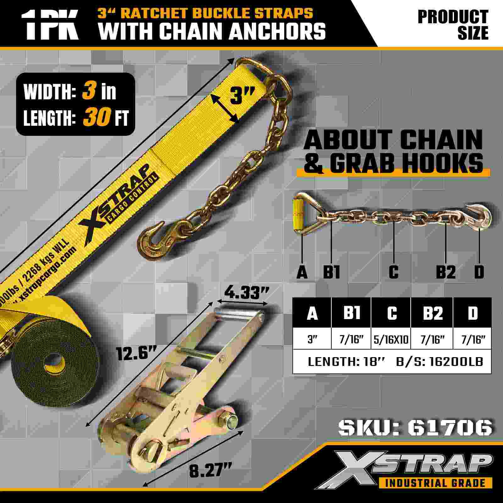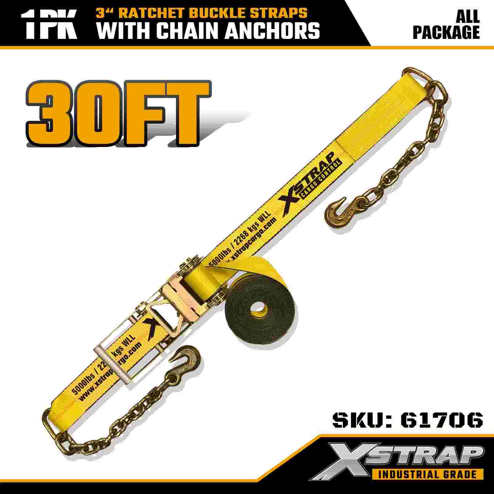 Dây đeo khóa Ratchet Xstrap 61706 3" × 30ft (1 gói) được thiết kế để cố định hàng hóa hạng nặng, có neo xích rèn và hệ thống bánh cóc có độ căng cao. Với WLL 5.000 lbs và độ bền đứt 15.000 lbs, nó mang lại hiệu suất đáng tin cậy cho giường phẳng, vận chuyển máy móc và kéo công nghiệp.