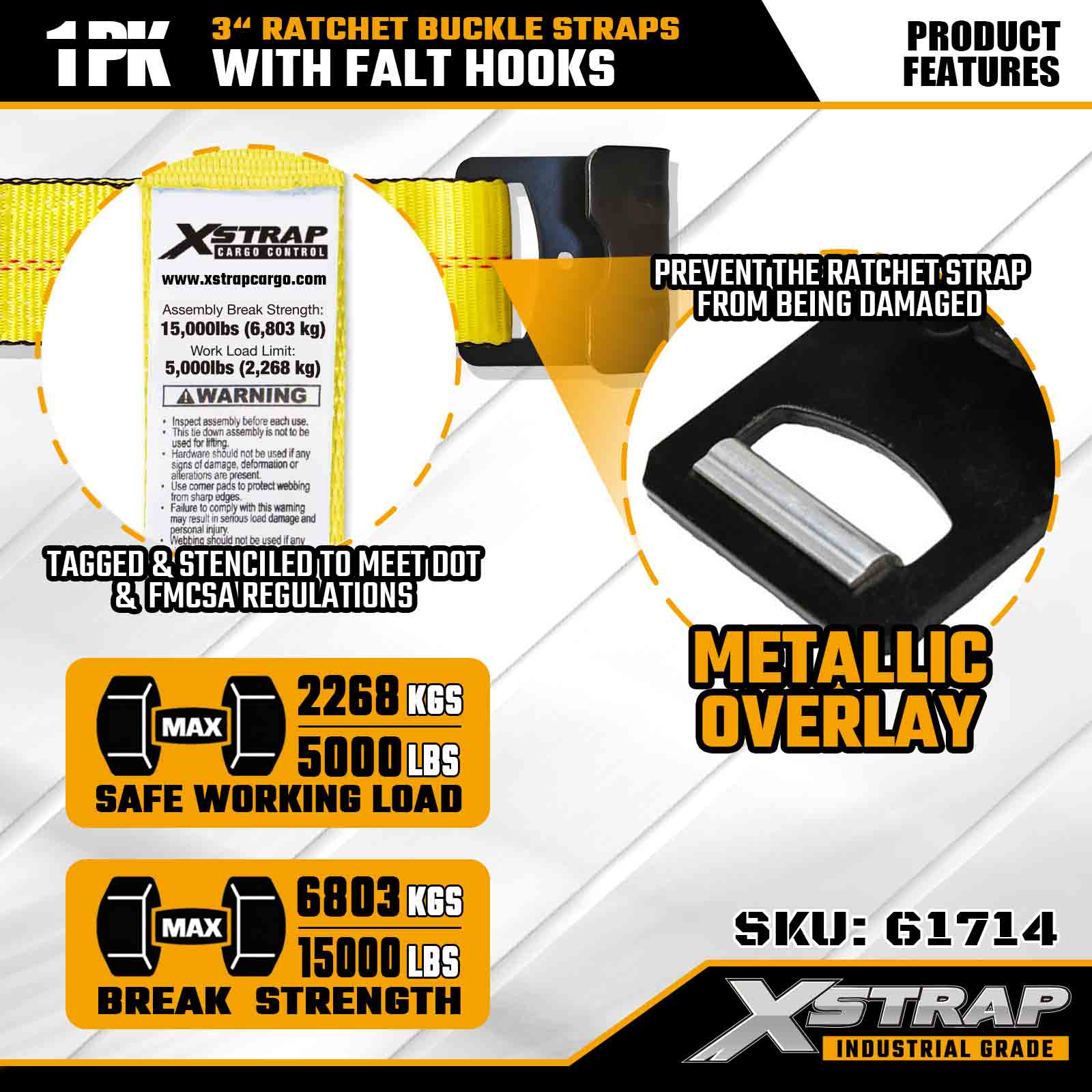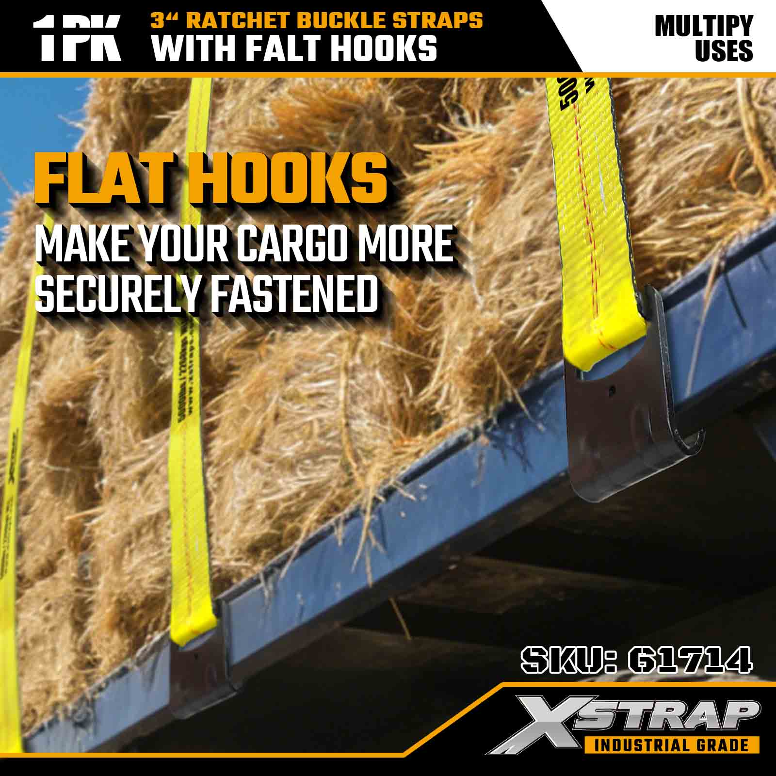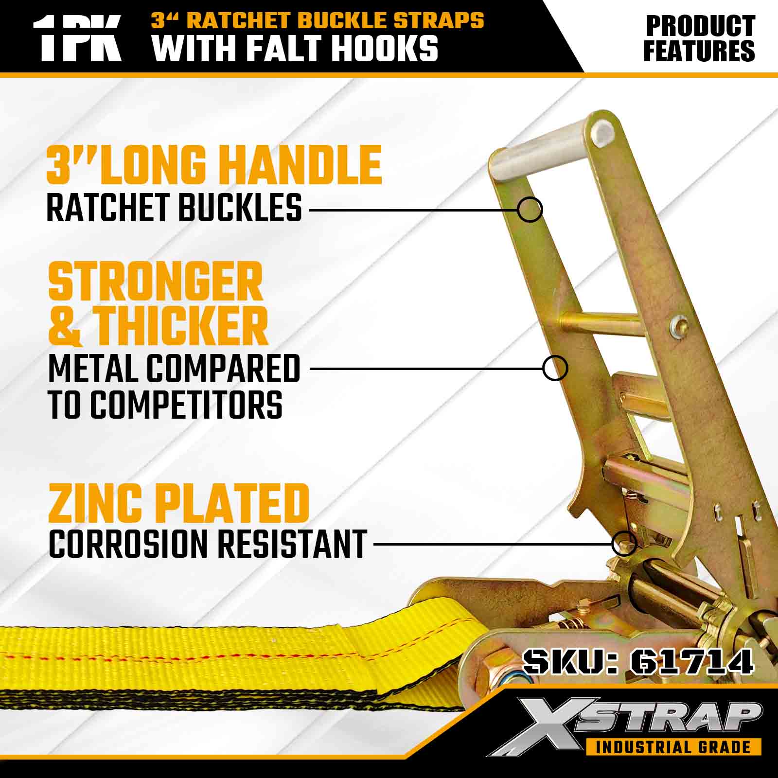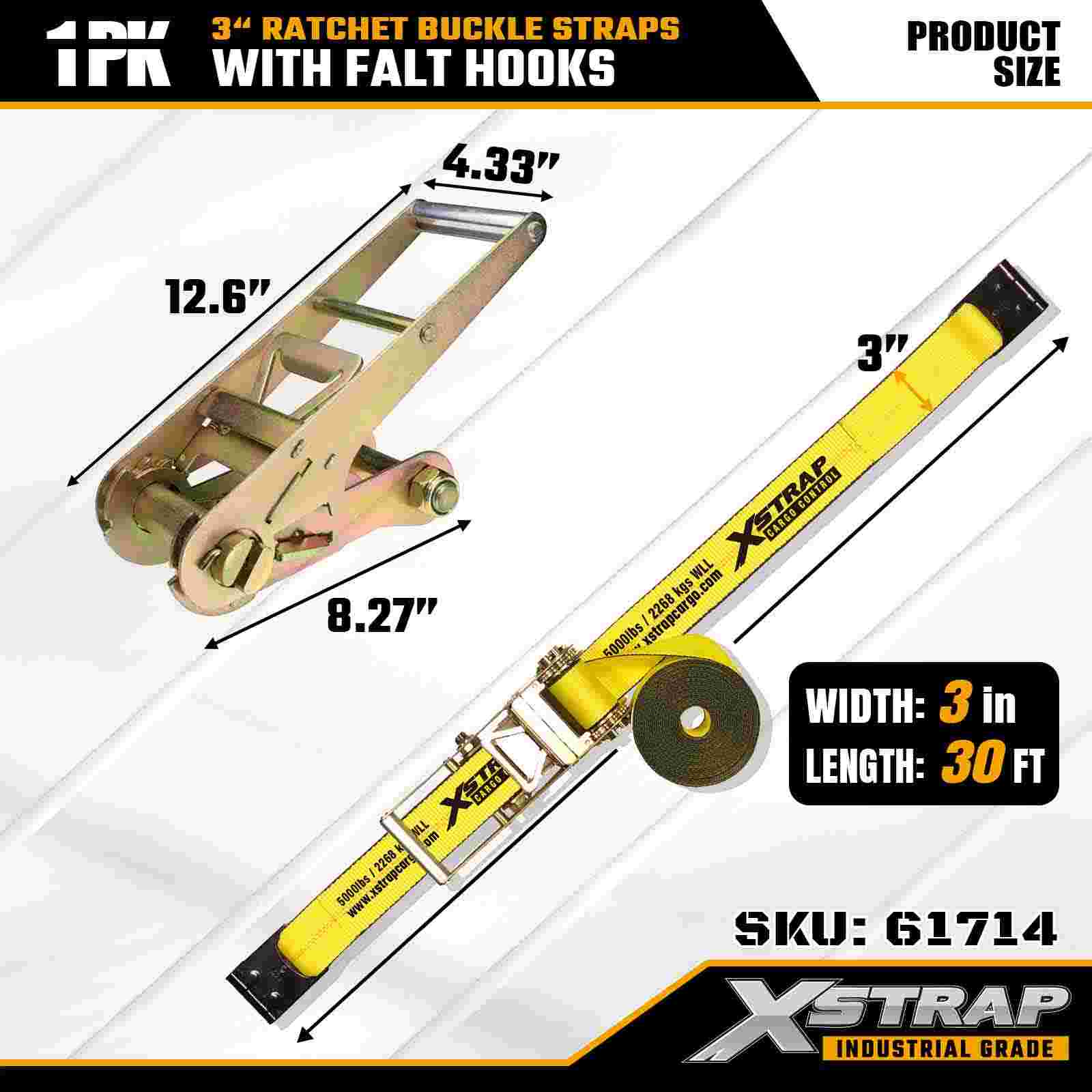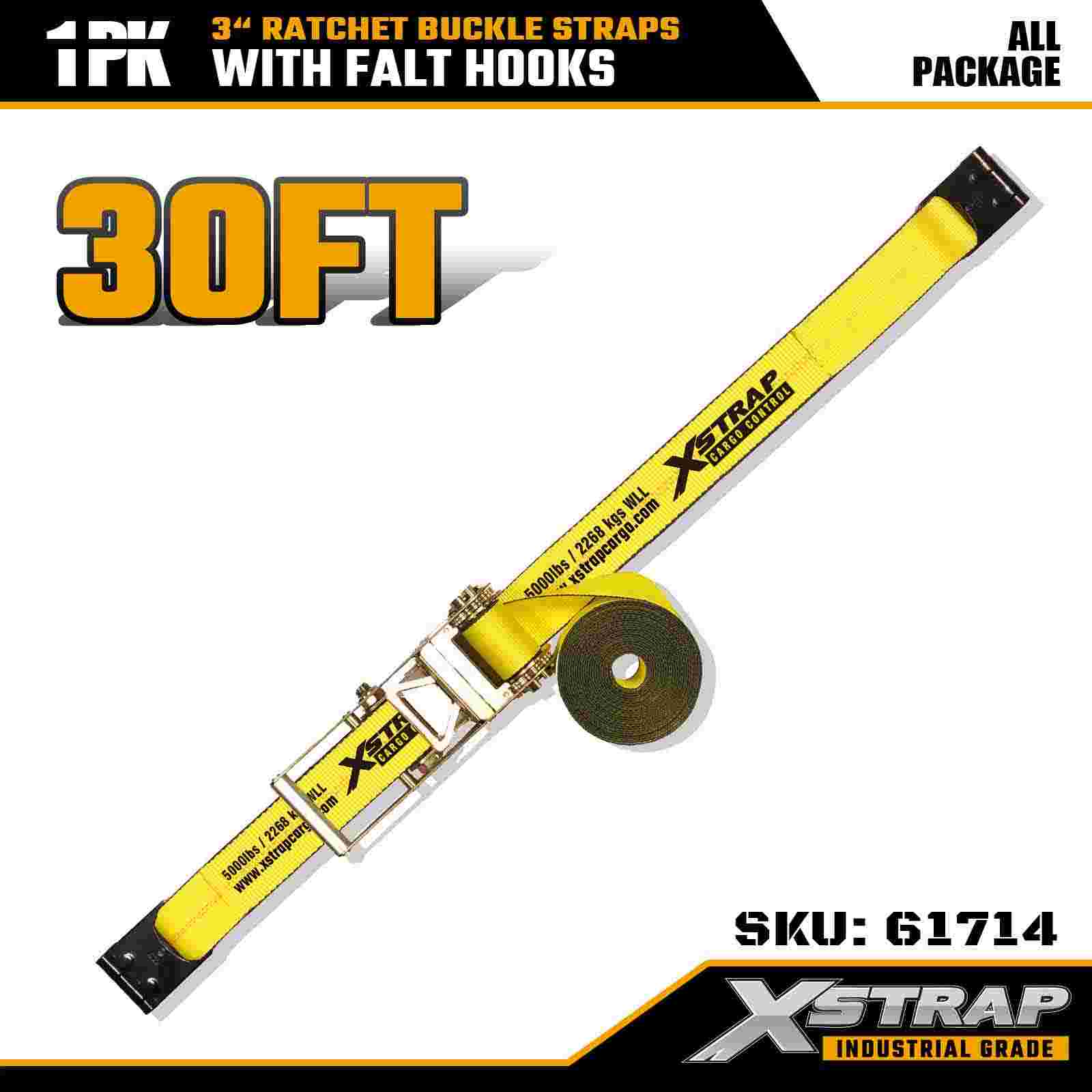 Xstrap 61714 Dây đai khóa Ratchet 3" x 30ft (1 gói) - Móc dẹt, Khả năng chịu tải 5.000 lbs, Độ bền đứt 15.000 lbs, Dây buộc hạng nặng cho Xe tải, Xe moóc và Vận tải Hàng hóa Công nghiệp.