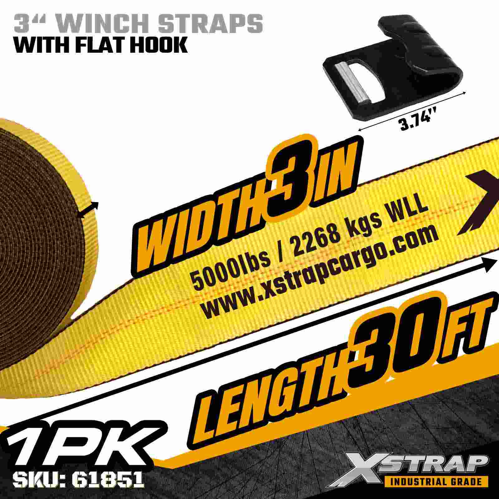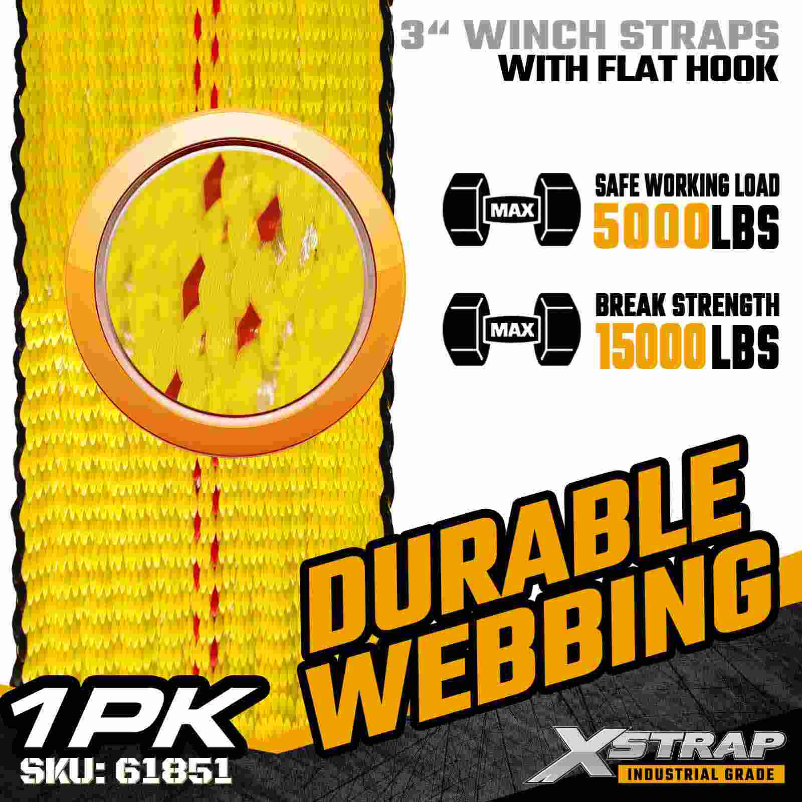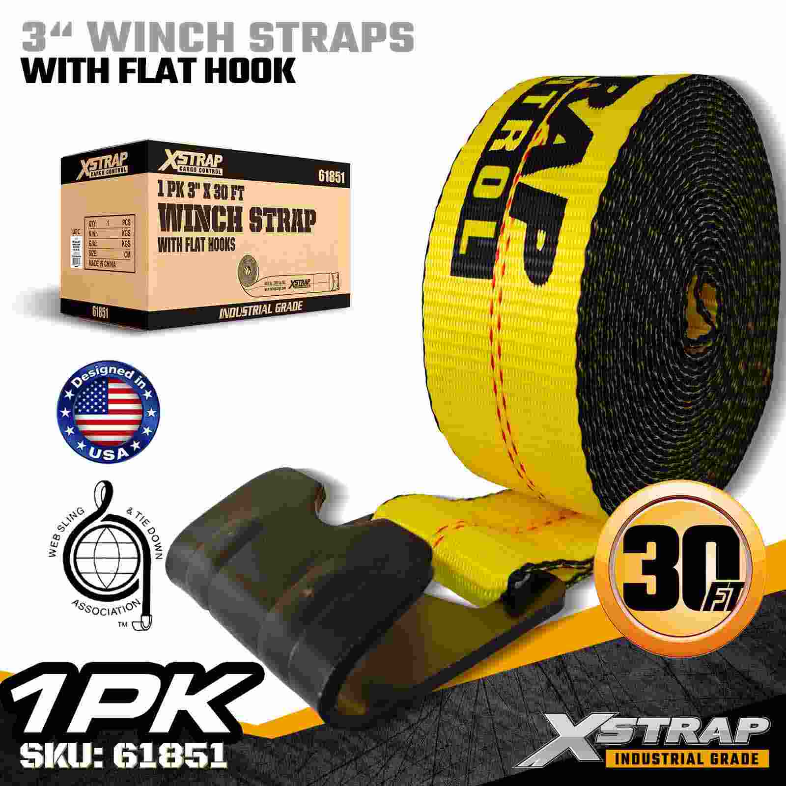 Dây đeo tời tiêu chuẩn Xstrap 61851 3" × 30ft là dây đai cố định hàng hóa hạng nặng được thiết kế cho xe moóc phẳng và vận chuyển công suất lớn. Với Móc phẳng được gia cố và vải polyester 3 inch cực rộng, dây tời 3 inch này mang lại Giới hạn tải trọng làm việc 5.000 lbs và Độ bền đứt 15.000 lbs. Nó lý tưởng để đảm bảo vận chuyển hàng hóa gỗ, thép, máy móc và công nghiệp trong các hoạt động vận chuyển đòi hỏi khắt khe.