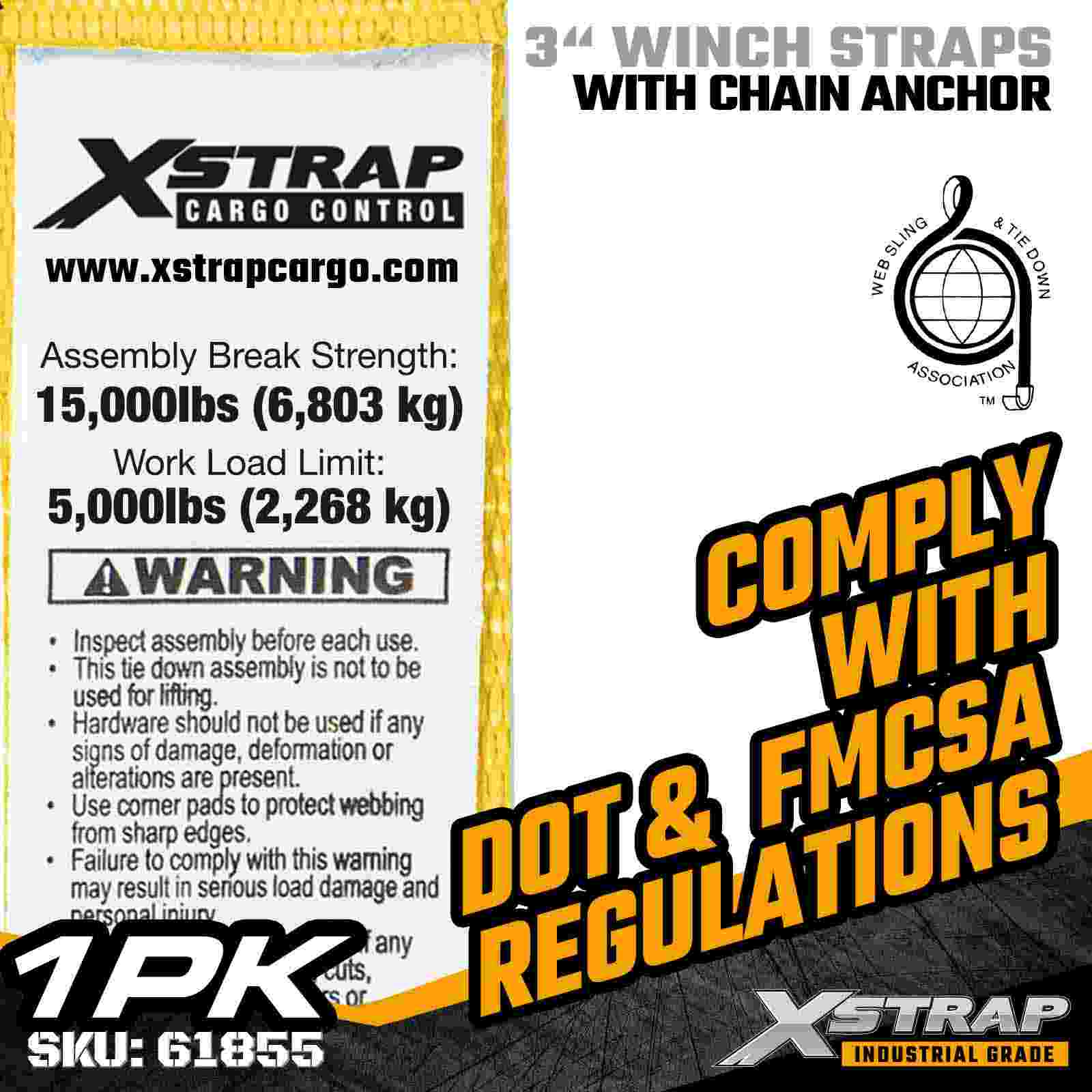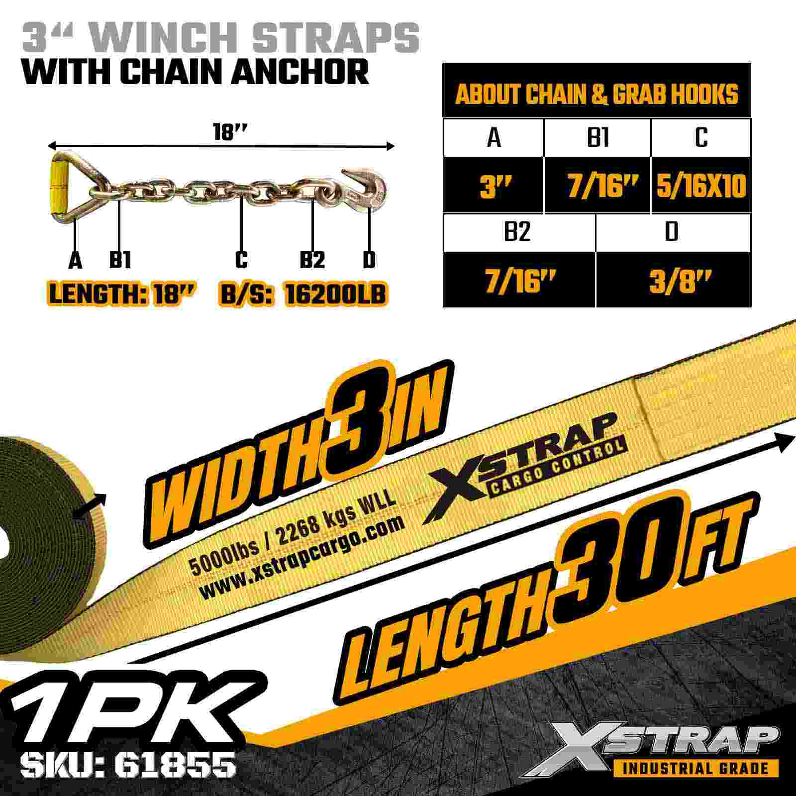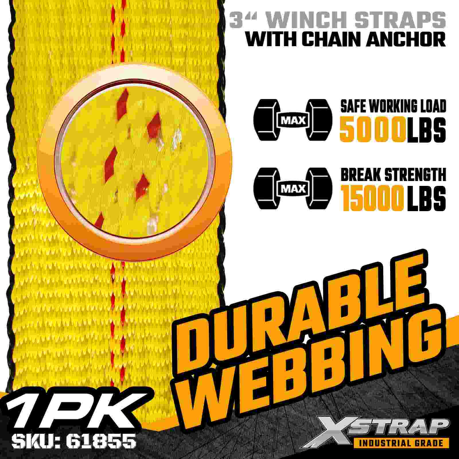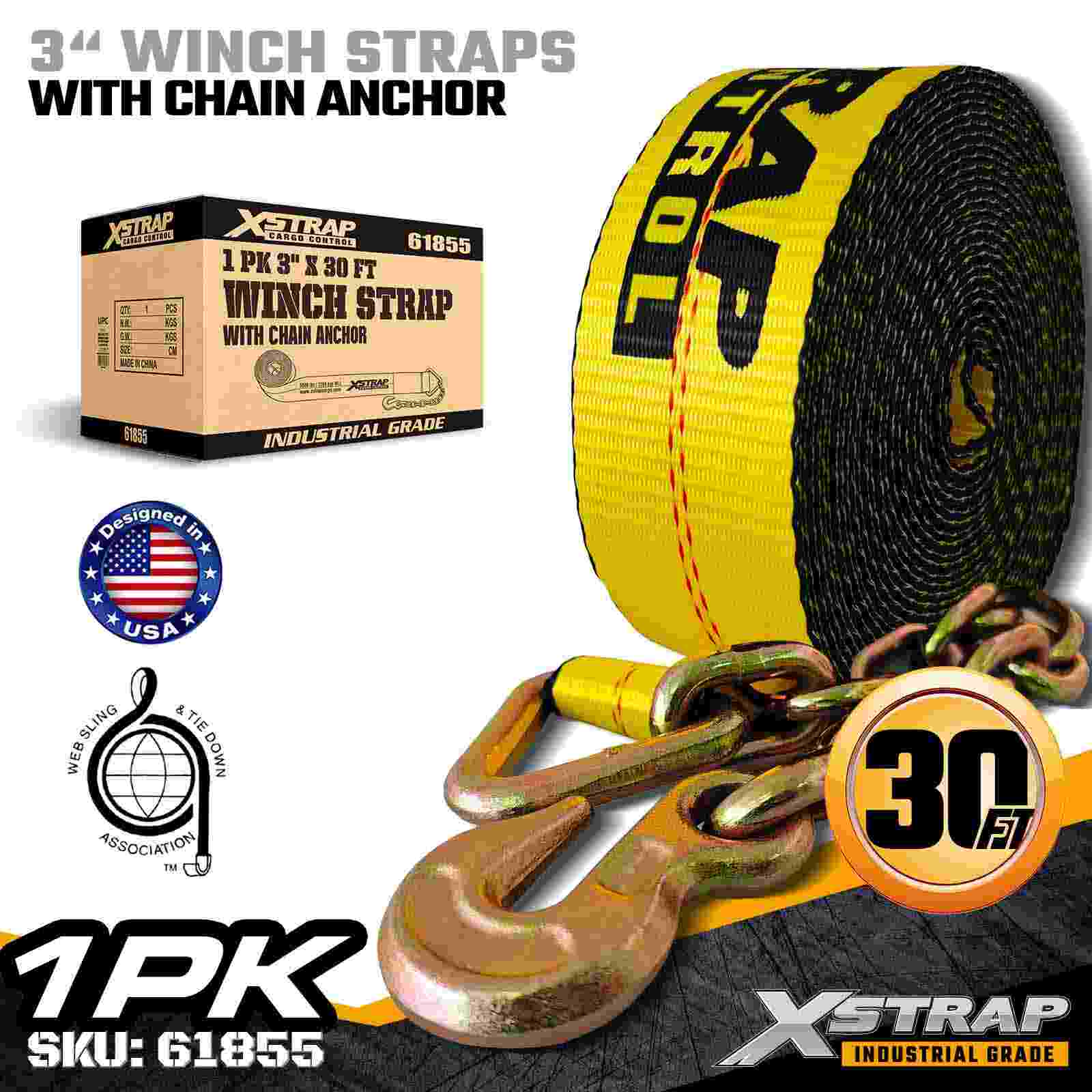 Dây đeo tời tiêu chuẩn Xstrap 61855 3" × 30ft là dây đai cố định hàng hóa công nghiệp hạng nặng được thiết kế cho xe moóc phẳng và hàng hóa quá khổ. Được trang bị Neo xích rèn và dây đai polyester 3 inch cực rộng, dây tời 3 inch này mang lại Giới hạn tải trọng làm việc 5.000 lbs và Độ bền đứt 15.000 lbs. Chiều dài 30ft mở rộng khiến nó trở nên lý tưởng để đảm bảo các tải trọng rộng hơn, cao hơn hoặc có hình dạng không đều yêu cầu phạm vi tiếp cận bổ sung và sự ổn định.
