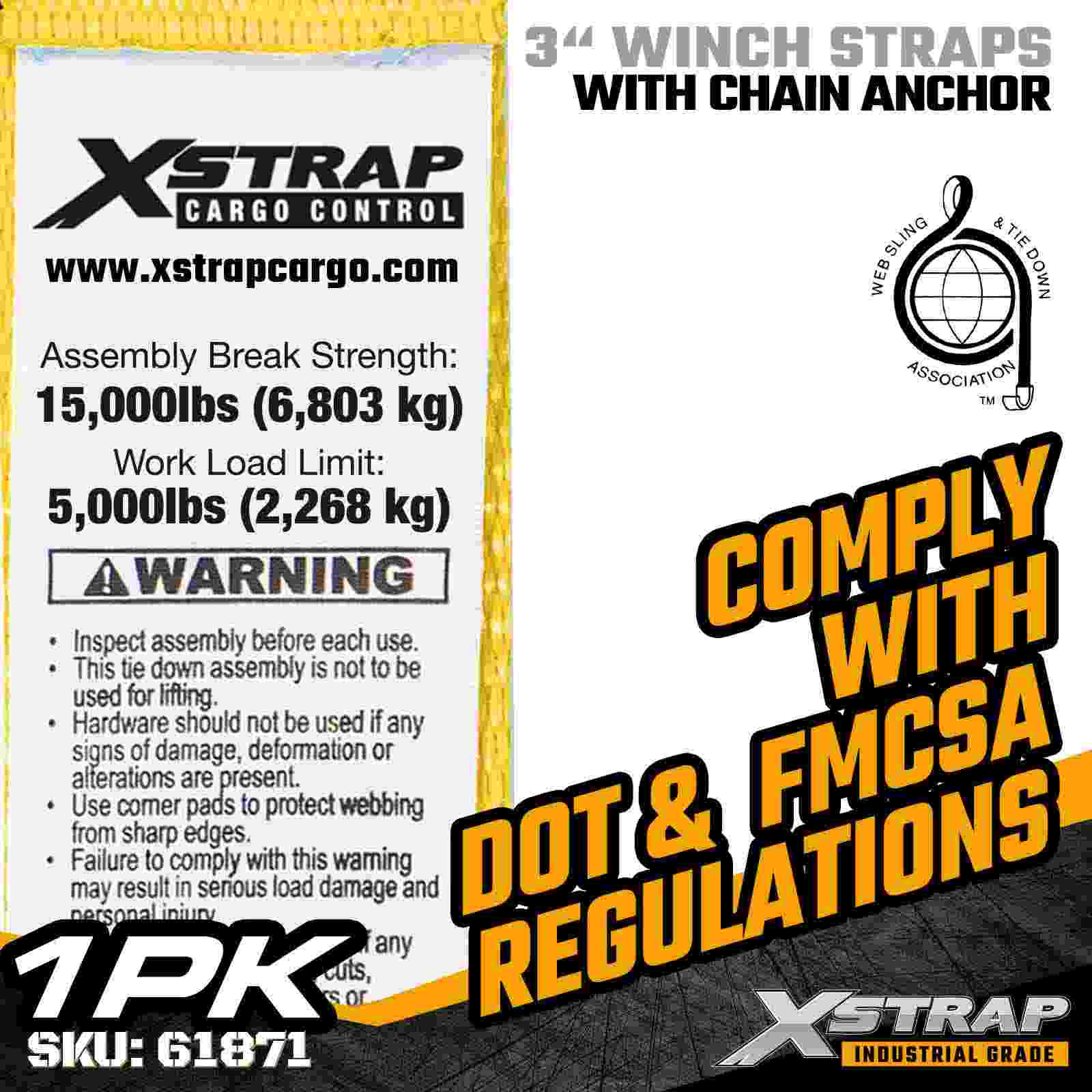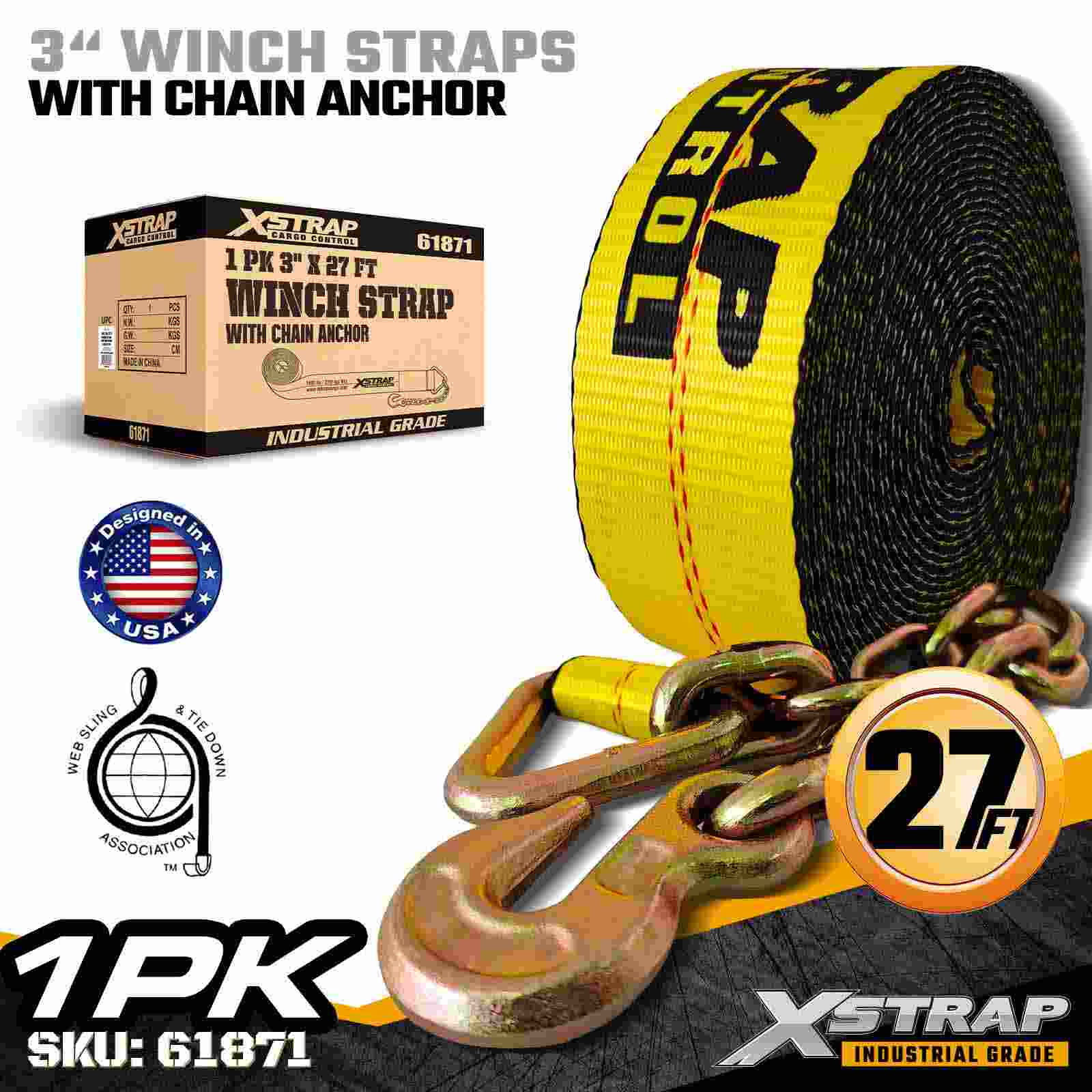 Dây đeo tời tiêu chuẩn Xstrap 61871 3" × 27ft được thiết kế để cố định hàng hóa hạng nặng trên xe moóc phẳng. Với Neo xích được rèn và vải polyester 3 inch cực rộng, dây tời 3 inch này mang lại Giới hạn tải trọng làm việc 5.000 lbs và Độ bền đứt 15.000 lbs. Nó được thiết kế cho các ứng dụng công nghiệp đòi hỏi khắt khe, yêu cầu độ bền và độ ổn định giữ tối đa.