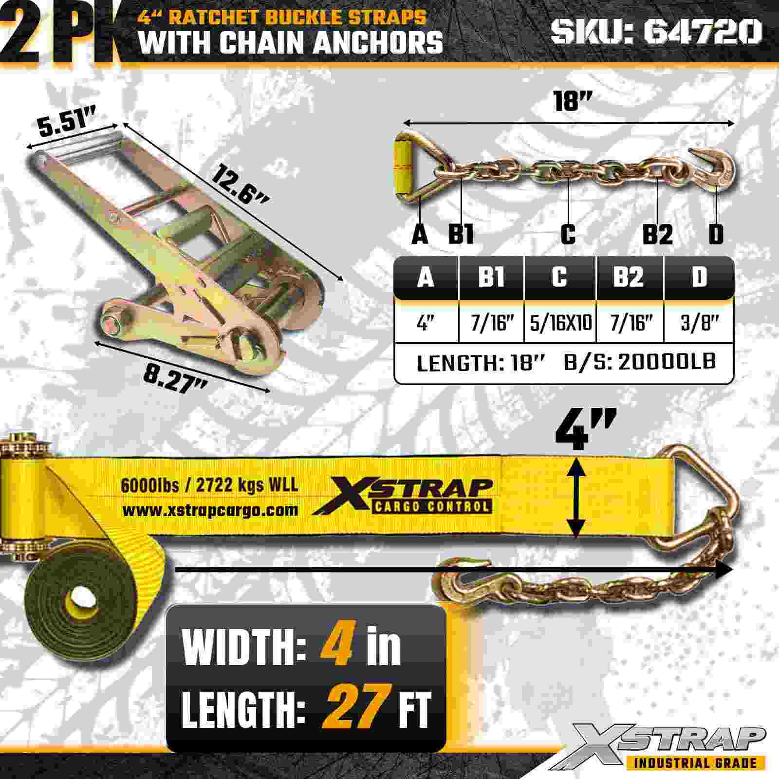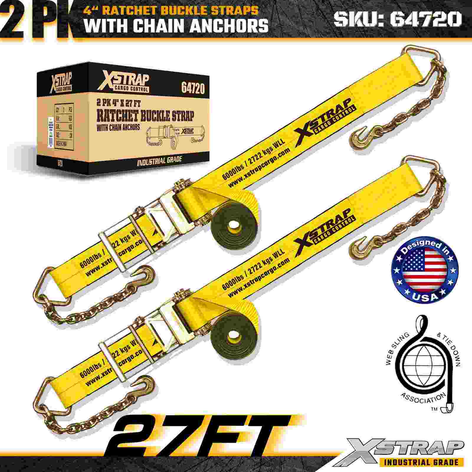 Dây đai khóa Ratchet Xstrap 64720 4" × 27ft (2 gói) được thiết kế để cố định hàng hóa hạng nặng, có các Neo xích chắc chắn và cơ cấu bánh cóc được gia cố. Với Giới hạn tải trọng làm việc 6.000 lbs và Độ bền đứt 18.000 lbs, những dây đai này lý tưởng cho việc kéo phẳng, vận chuyển máy móc, tải trọng bằng thép và các ứng dụng chở hàng công nghiệp đòi hỏi độ bền và độ tin cậy tối đa.