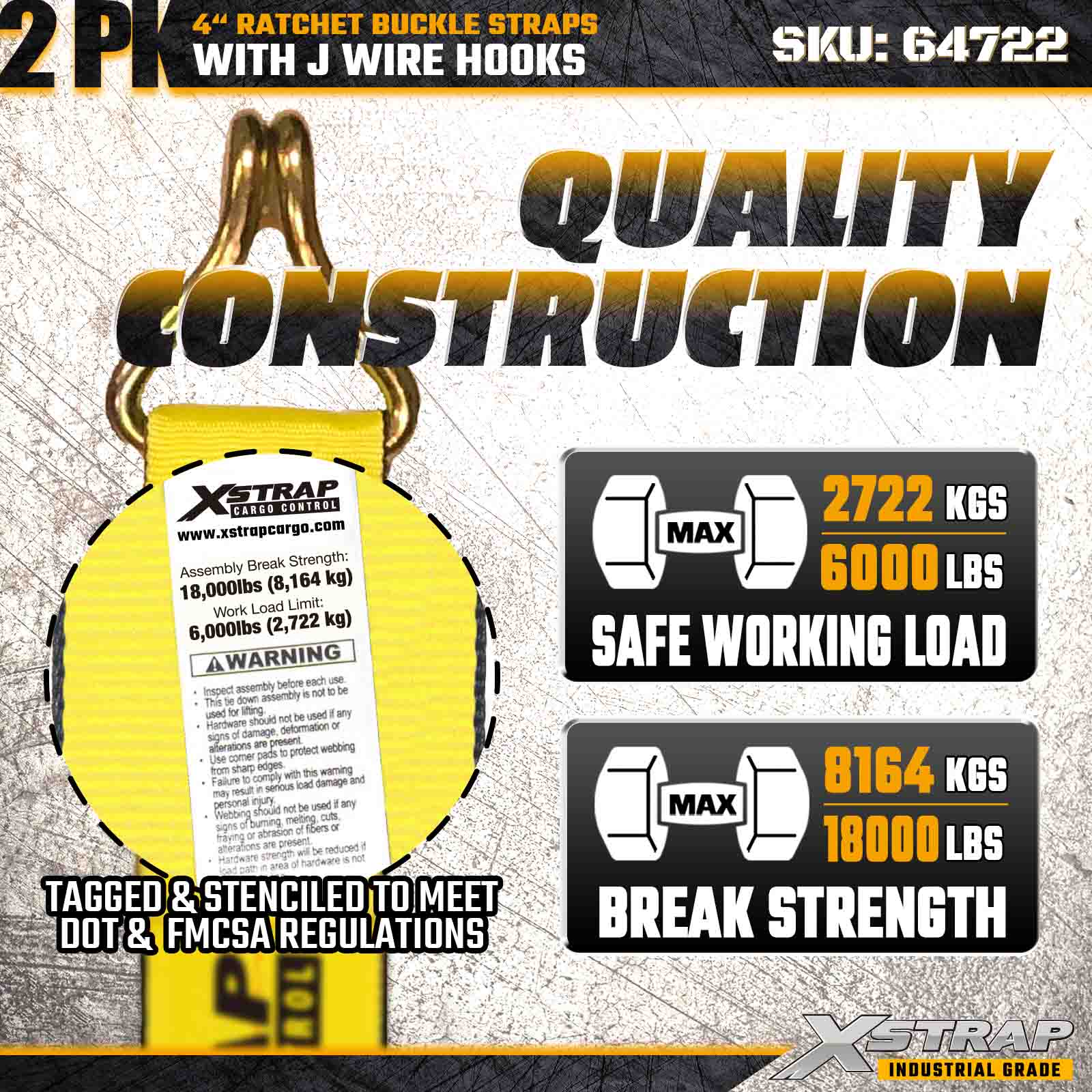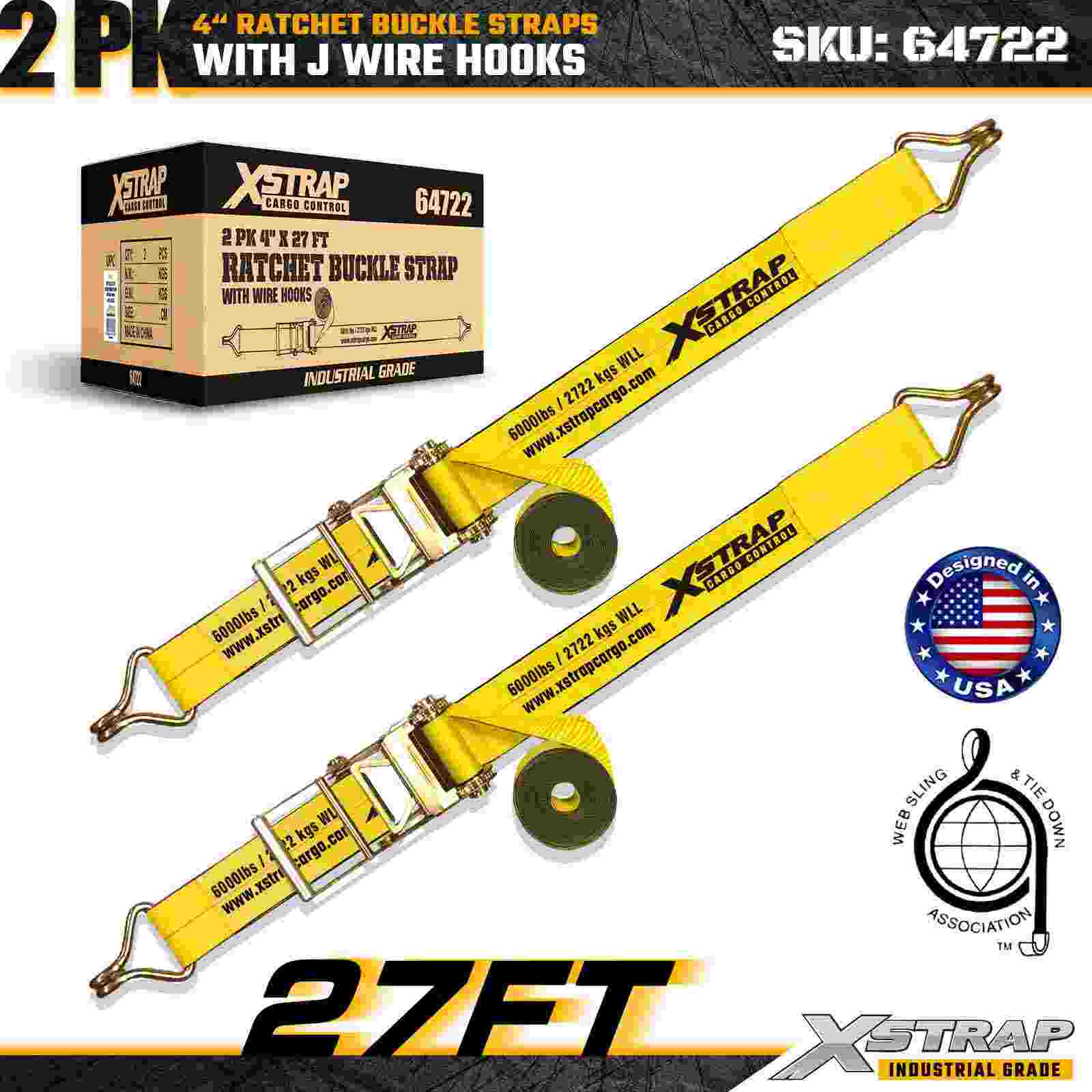 Dây đai khóa Ratchet Xstrap 64722 4" × 27ft (2 gói) được thiết kế để cố định hàng hóa hạng nặng, có Móc dây được gia cố và cơ cấu bánh cóc bền bỉ. Với Giới hạn tải trọng làm việc 6.000 lbs và Độ bền đứt 18.000 lbs, những dây đai này lý tưởng cho việc kéo phẳng, vận chuyển máy móc, gỗ, tải thép và các ứng dụng chở hàng công nghiệp.