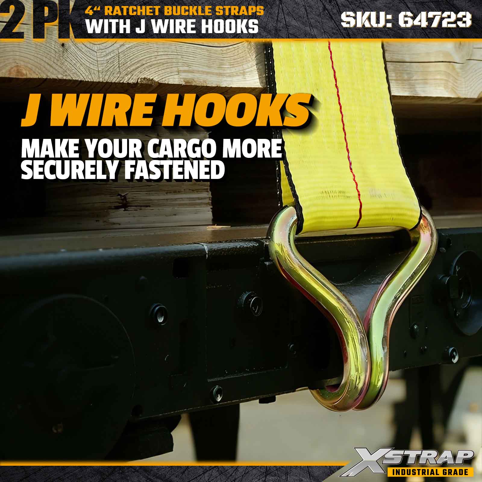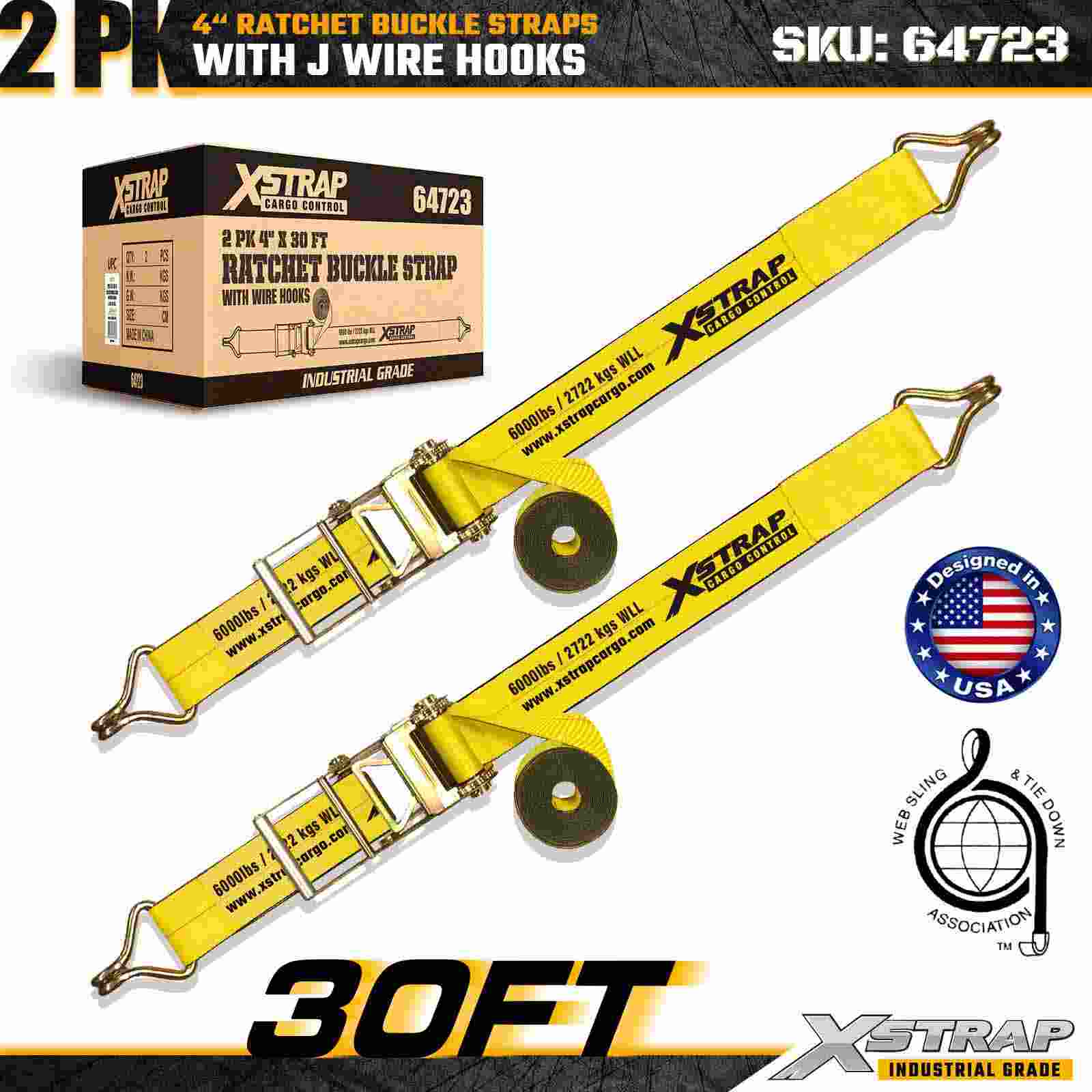 Dây đai khóa Ratchet Xstrap 64723 4" × 30ft (2 gói) được thiết kế để cố định hàng hóa hạng nặng, có Móc dây được gia cố và cơ cấu bánh cóc bền bỉ. Với Giới hạn tải trọng làm việc 6.000 lbs và Độ bền đứt 18.000 lbs, những dây đai này lý tưởng cho việc kéo phẳng, vận chuyển máy móc, gỗ, tải thép và các ứng dụng hàng hóa công nghiệp.
