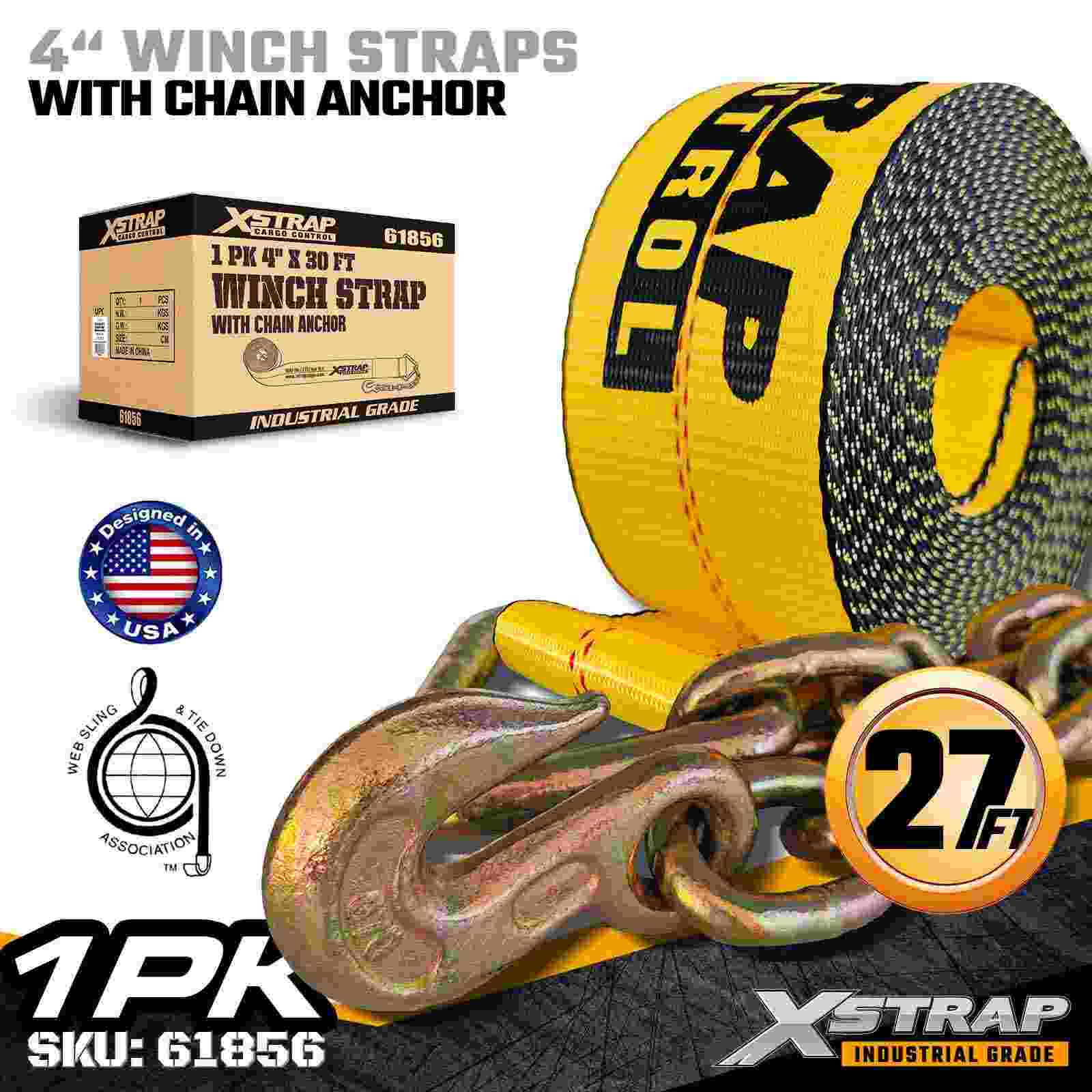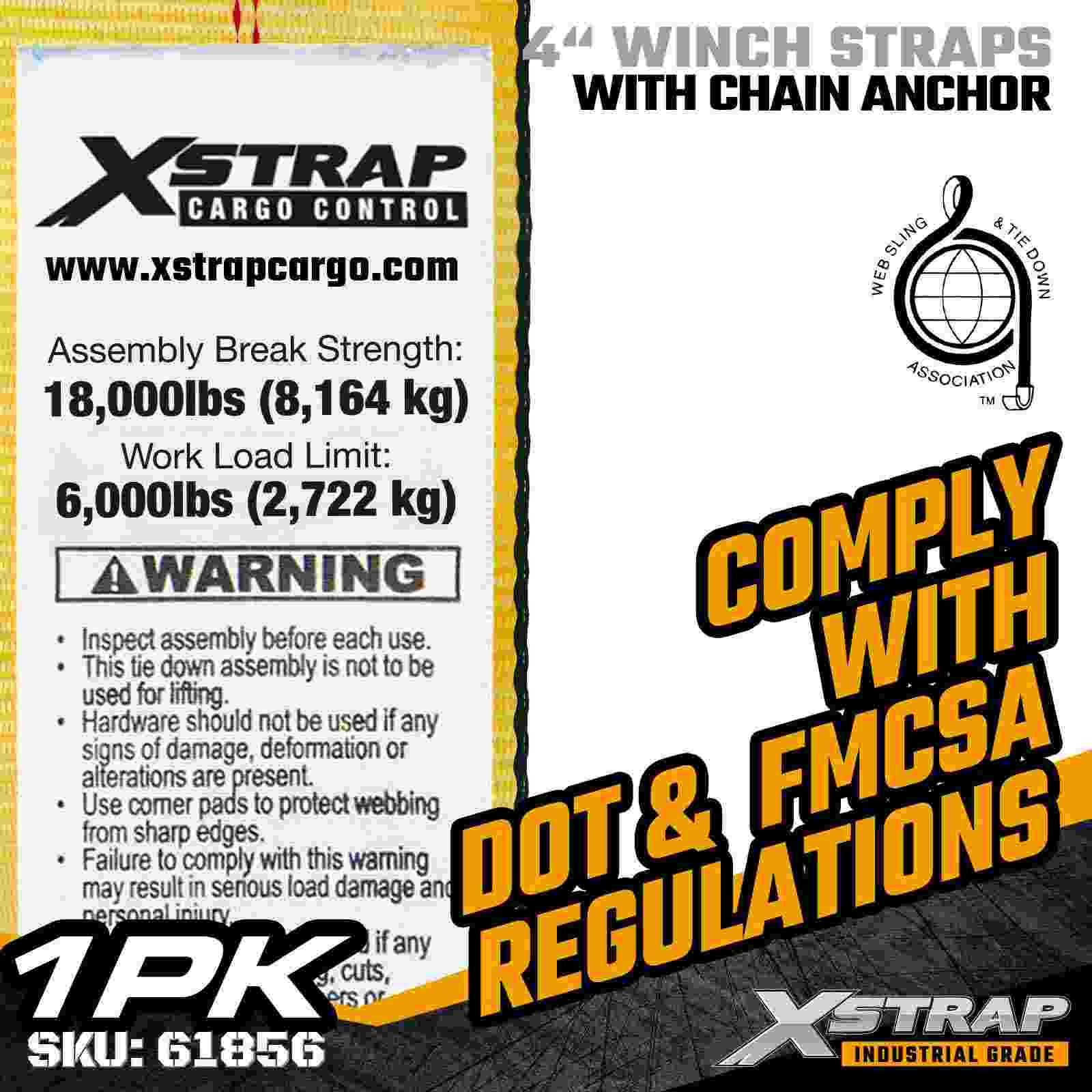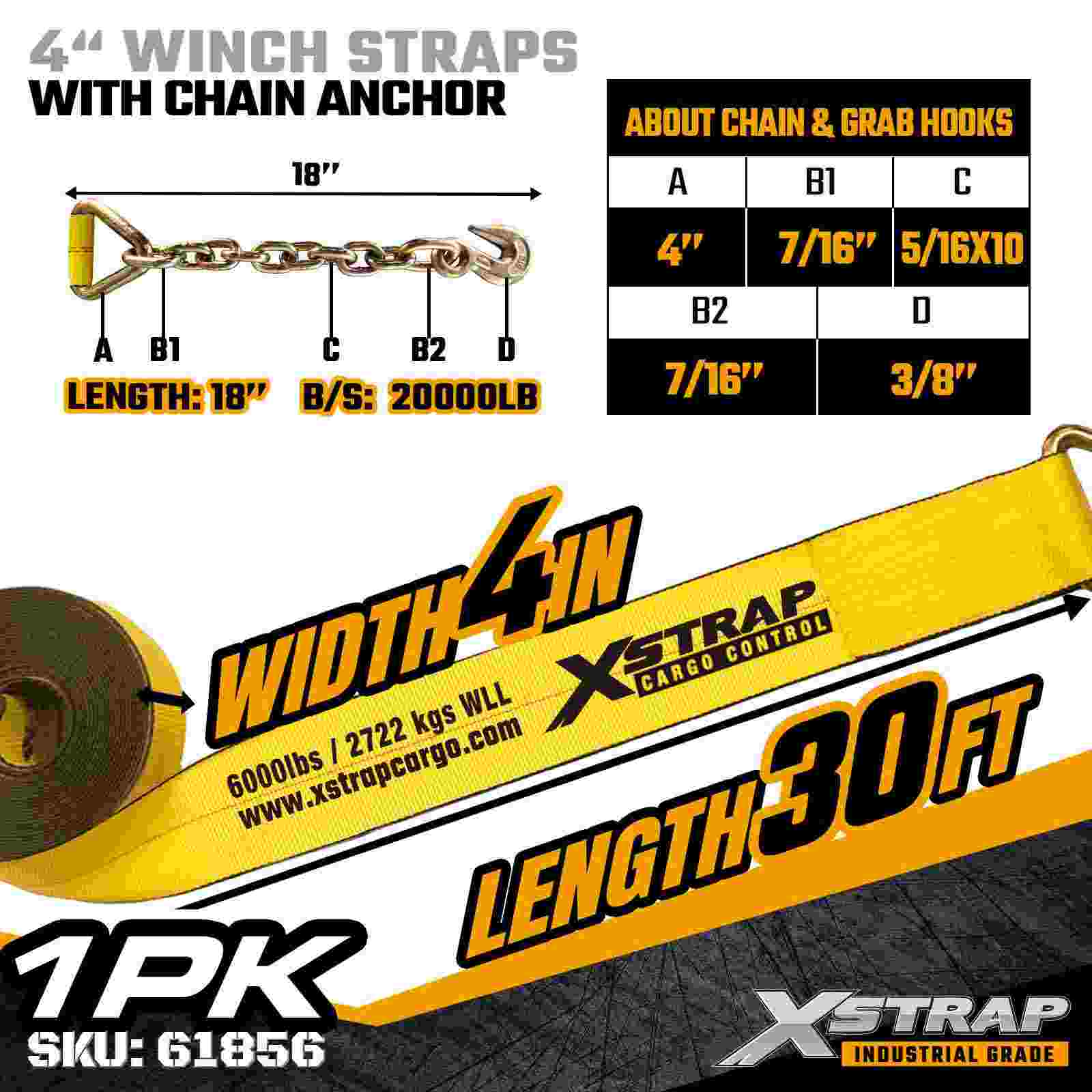 Dây đeo tời tiêu chuẩn Xstrap 61856 4" × 30ft là dây đai cố định hàng hóa có sức chứa lớn, tầm với rộng được thiết kế cho xe moóc phẳng và hàng hóa công nghiệp quá khổ. Với Neo xích được rèn và dây đai polyester 4 inch siêu rộng, dây tời 4 inch này mang lại Giới hạn tải trọng làm việc 6.000 lbs và Độ bền đứt 18.000 lbs. Chiều dài 30ft mở rộng cung cấp thêm tầm với để đảm bảo phạm vi rộng, cao hoặc tải có hình dạng không đều đòi hỏi độ bền và độ ổn định tối đa.