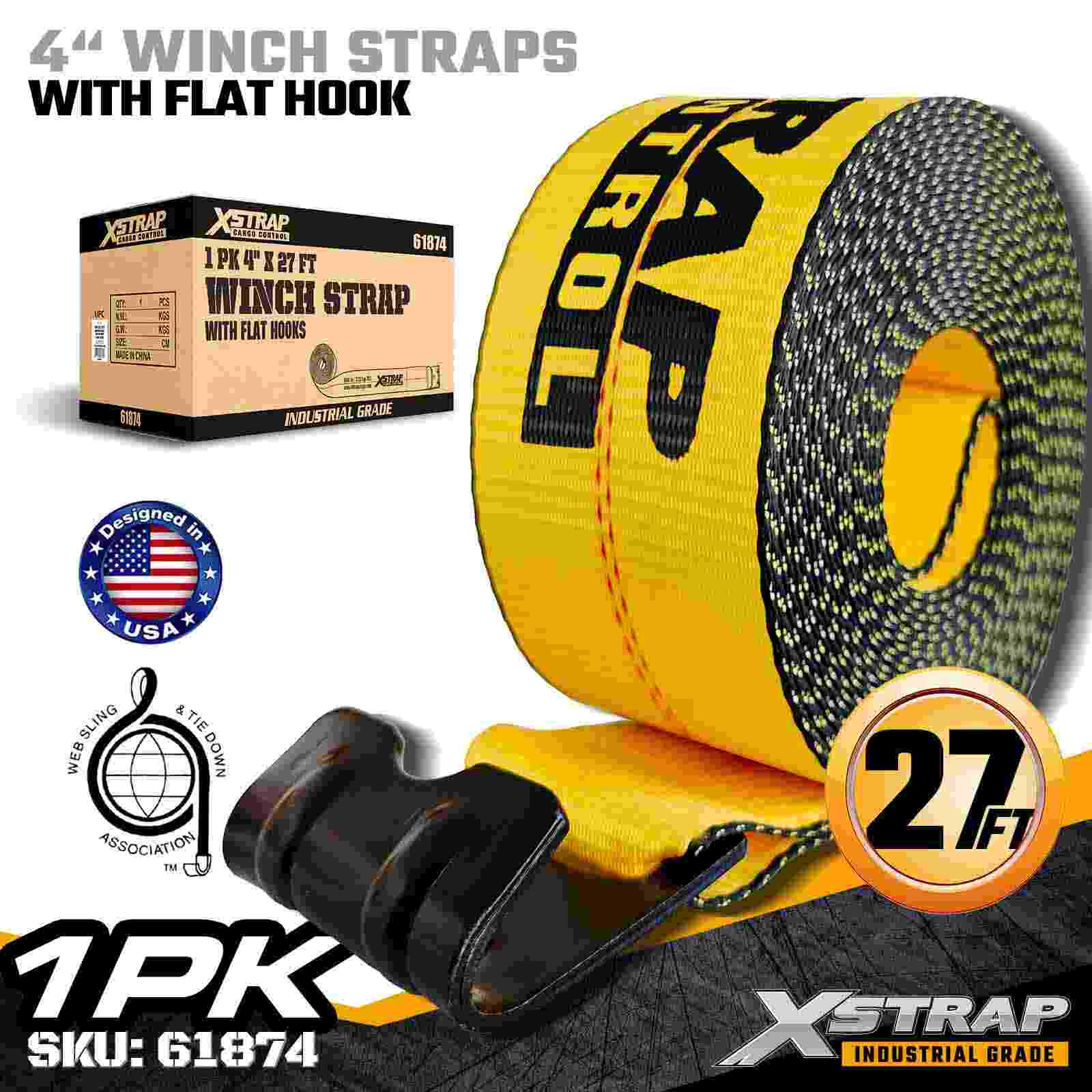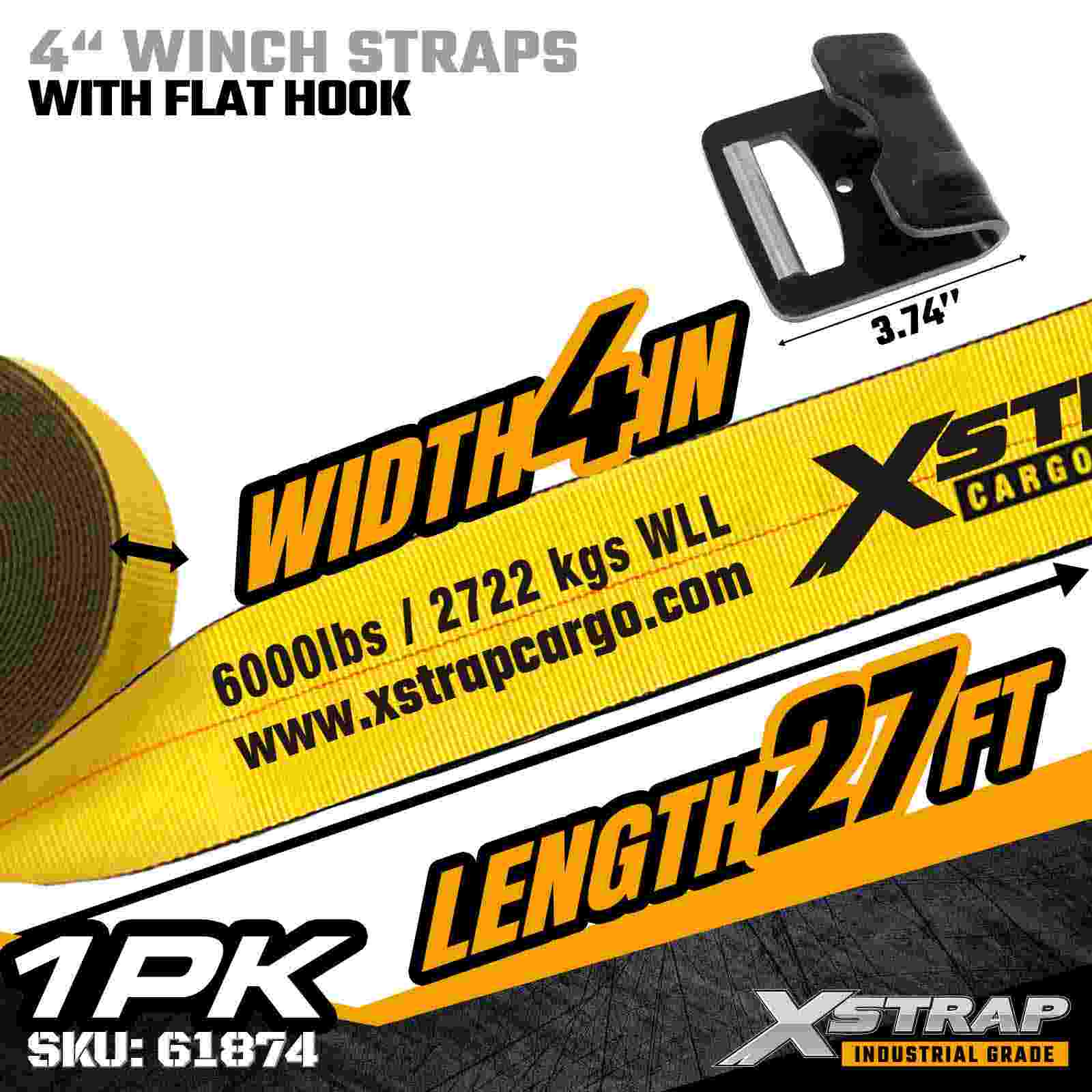 Dây đeo tời tiêu chuẩn Xstrap 61874 4" × 27ft là dây đeo cố định hàng hóa hạng nặng, công suất cao được thiết kế cho xe moóc phẳng và phương tiện vận tải công nghiệp. Với Móc phẳng được gia cố và vải polyester 4 inch cực rộng, dây đeo tời 4 inch này mang lại Giới hạn tải trọng làm việc 6.000 lbs và Độ bền đứt 18.000 lbs. Dây đai rộng hơn giúp phân bổ tải trọng vượt trội, lý tưởng để đảm bảo các vật nặng, cồng kềnh hoặc vận chuyển hàng hóa tinh tế đòi hỏi sự ổn định tối đa.