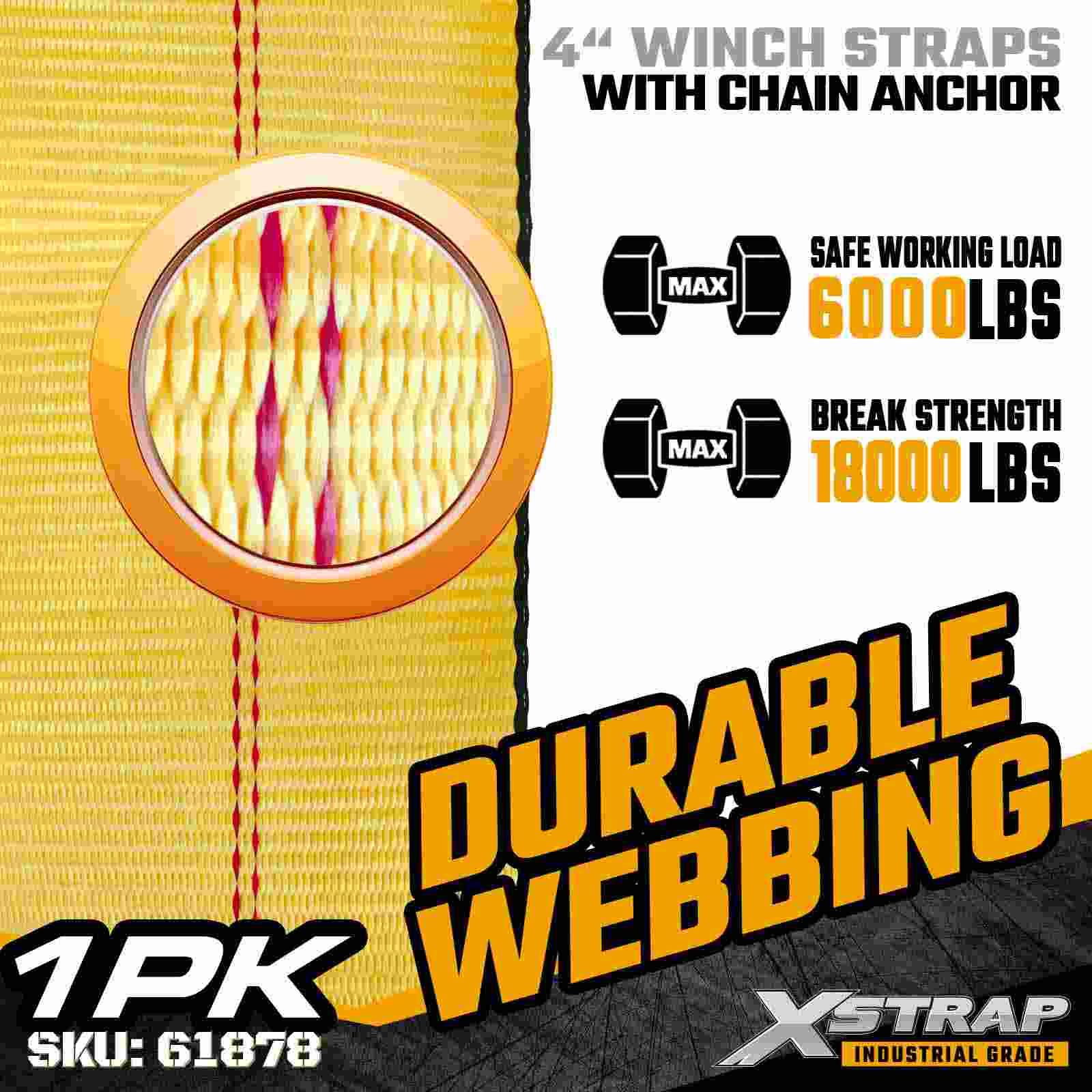 Dây đeo tời tiêu chuẩn Xstrap 61878 4" × 27ft là dây đai cố định hàng hóa công nghiệp hạng nặng được thiết kế cho xe moóc phẳng và điều kiện tải trọng khắc nghiệt. Với Neo xích được rèn và dây đai polyester 4 inch siêu rộng, dây tời 4 inch này mang lại Giới hạn tải trọng làm việc 6.000 lbs và Độ bền đứt 18.000 lbs. Thiết kế Neo chuỗi mang lại độ bám và độ bền chưa từng có, khiến nó trở nên lý tưởng để cố định thép, máy móc và các vật dụng khác vận chuyển hàng hóa có độ căng cao.