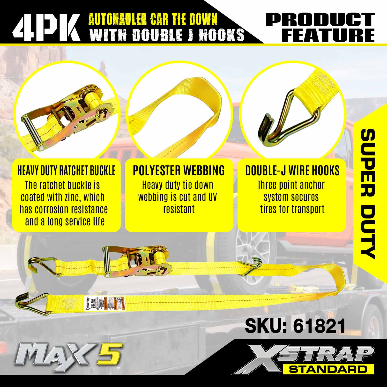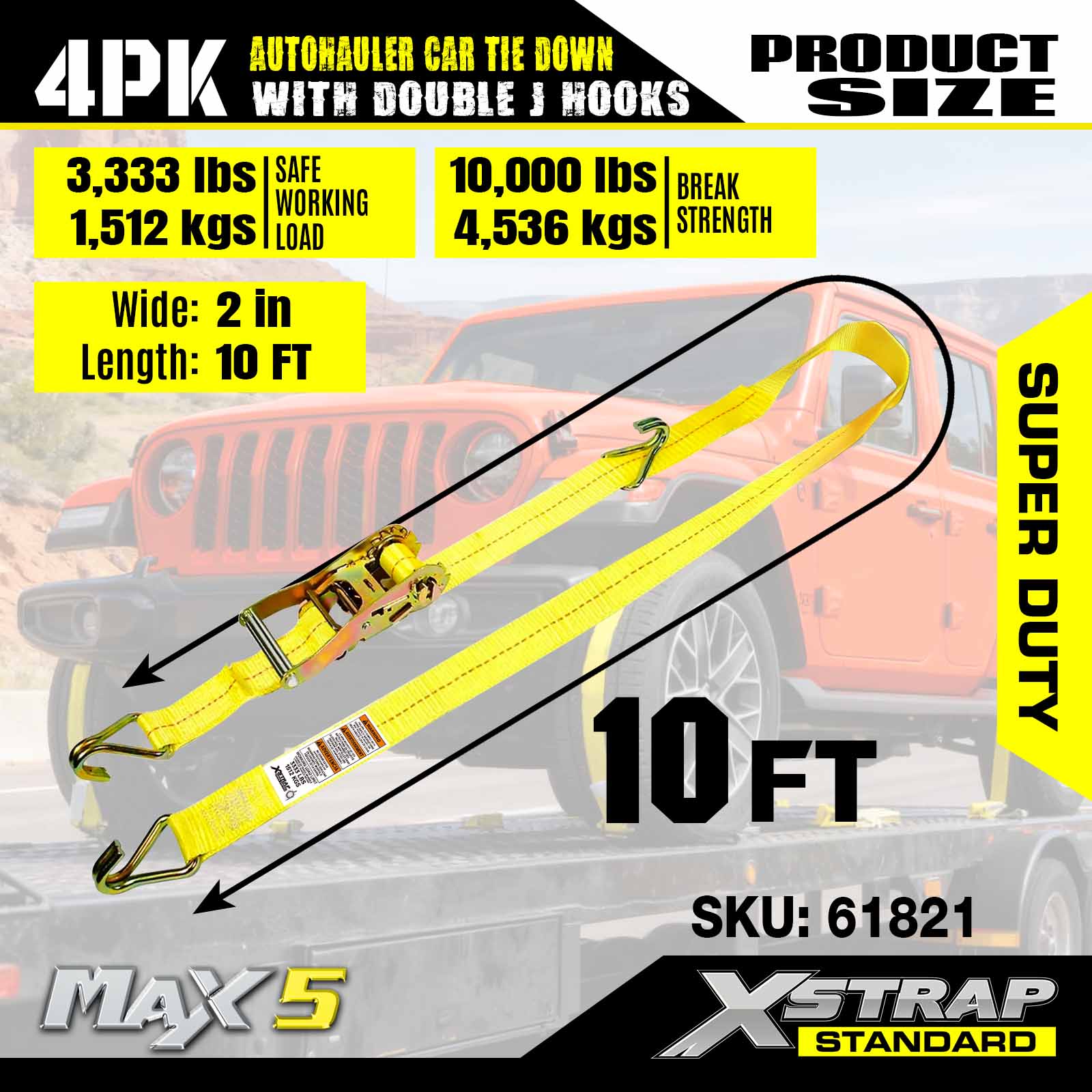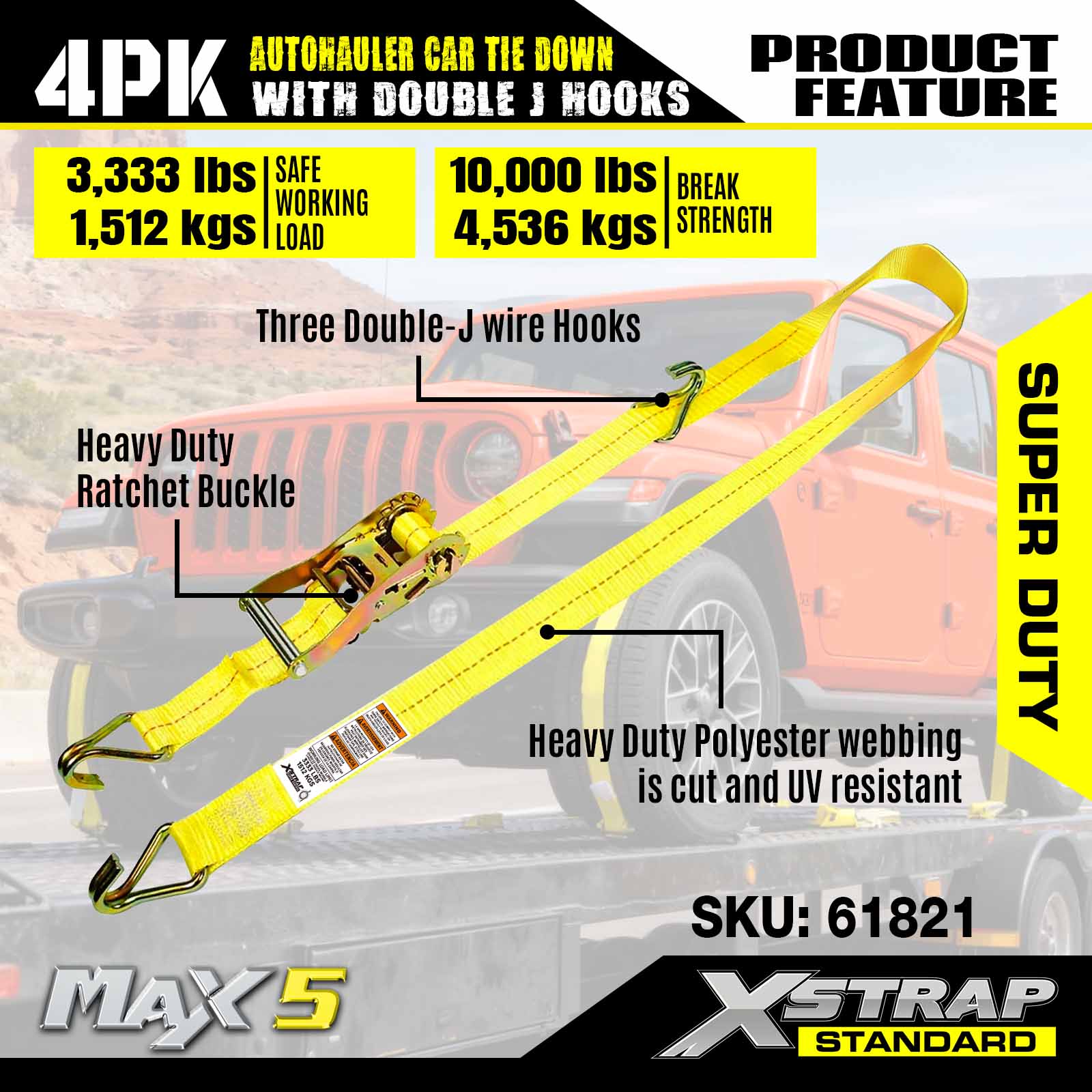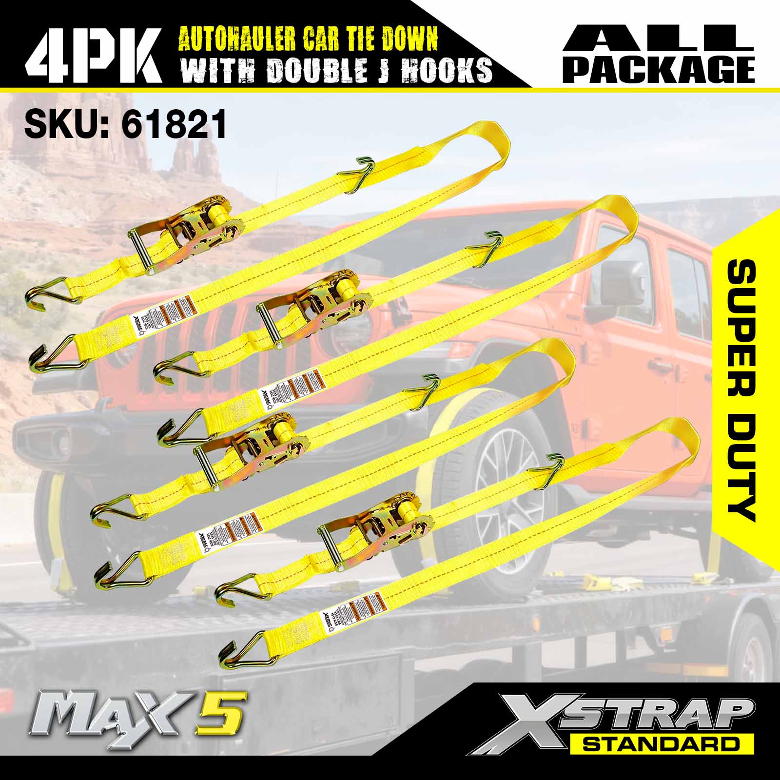 - Giá trị 4 gói: Bộ 4 món cung cấp phạm vi bảo hiểm đầy đủ để cố định một chiếc xe (ví dụ: một dây buộc cho mỗi lốp), với bao bì có tổ chức để dễ dàng cất giữ khi không sử dụng.