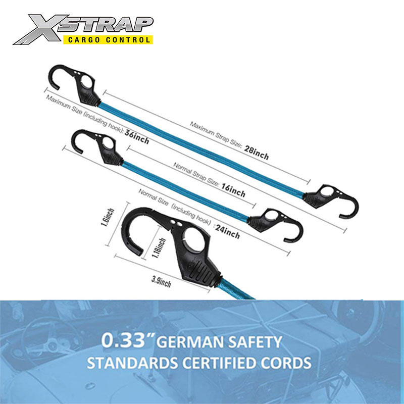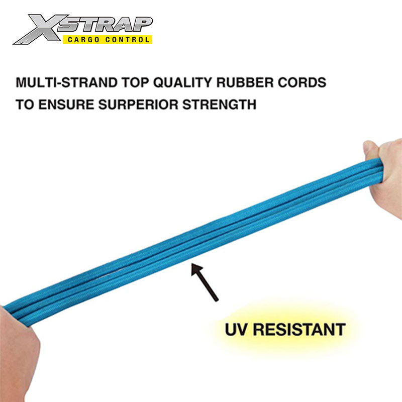 Dây bungee có móc lỗ xỏ ngón được làm bằng cao su và latex dệt chéo chống tia cực tím vượt trội, sẽ không bị mỏng hoặc đứt khi sử dụng hàng ngày hoặc ở các vùng khí hậu khác nhau.