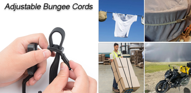 Dây bungee có thể điều chỉnh giúp tăng cường độ ổn định và giảm xu hướng đào sâu vào đồ vật. Chúng rất linh hoạt và phù hợp cho nhiều ứng dụng, bao gồm thiết bị, sắp xếp nơi lưu trữ, buộc hành lý hoặc bạt, thiết bị an toàn ngoài trời, sân vườn, nhà để xe hoặc các ứng dụng du lịch.