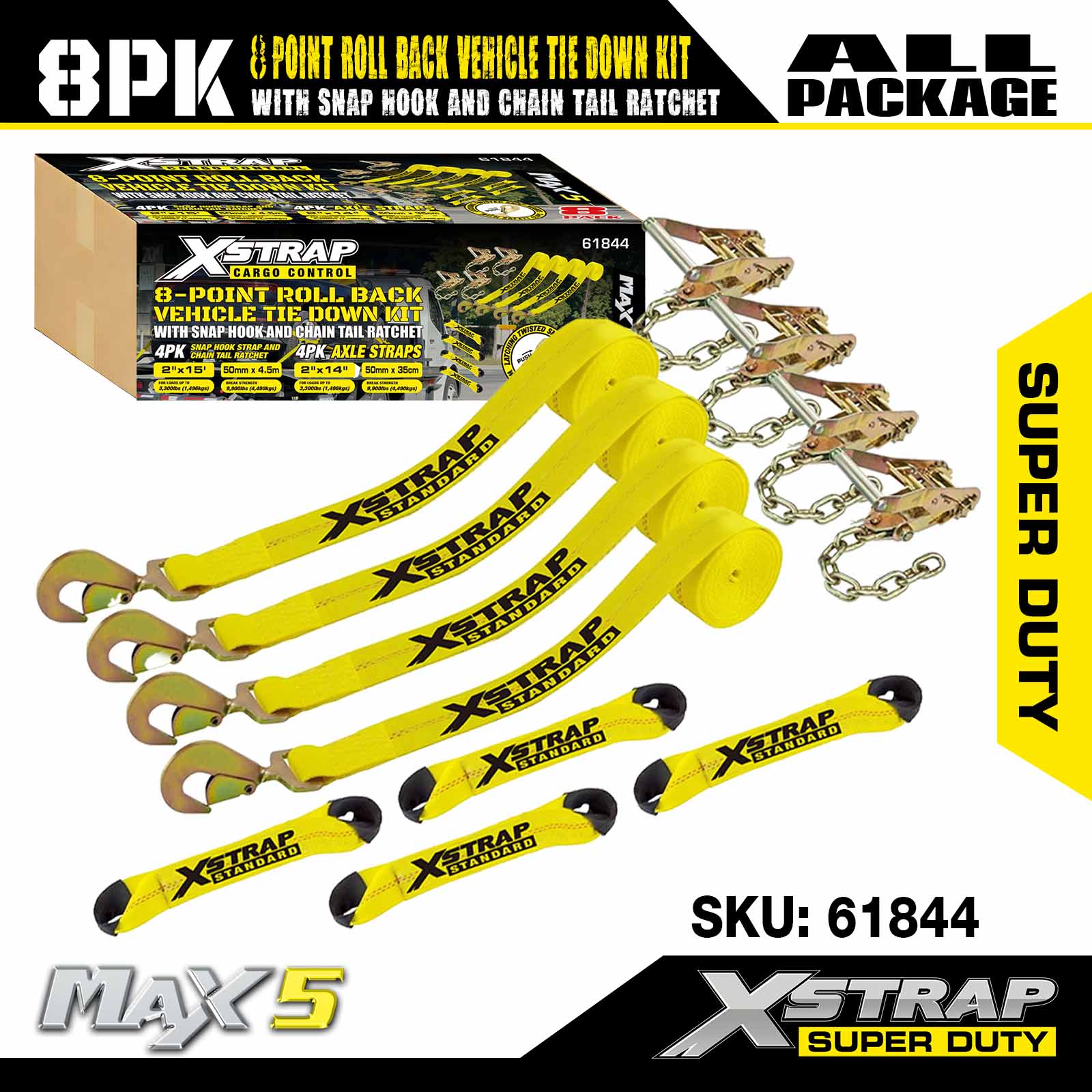Bộ dây buộc xe cuộn lại 8 điểm Xstrap có móc bấm và bánh cóc đuôi xích ở cả hai đầu - Bộ 4 - Màu vàng cổ điển