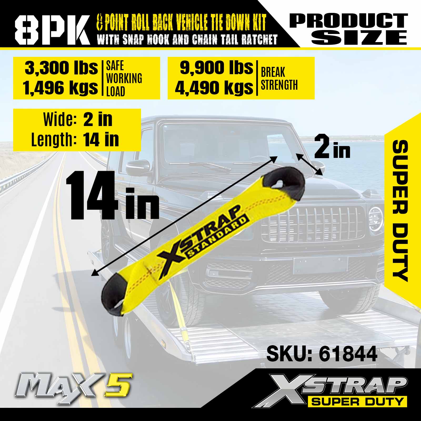 - An toàn và tuân thủ - Những dây đai lốp này được thiết kế để kéo bất kỳ phương tiện nào trên xe moóc phẳng hoặc xe phá hủy xe lăn và chúng cho phép phương tiện di chuyển trên hệ thống treo riêng, loại bỏ hiện tượng truyền sốc. Bạn có thể dễ dàng cố định xe để vận chuyển khi đứng trên mặt đất để tăng thêm sự an toàn. Mỗi cụm có tải trọng làm việc an toàn là 3.300 lbs.