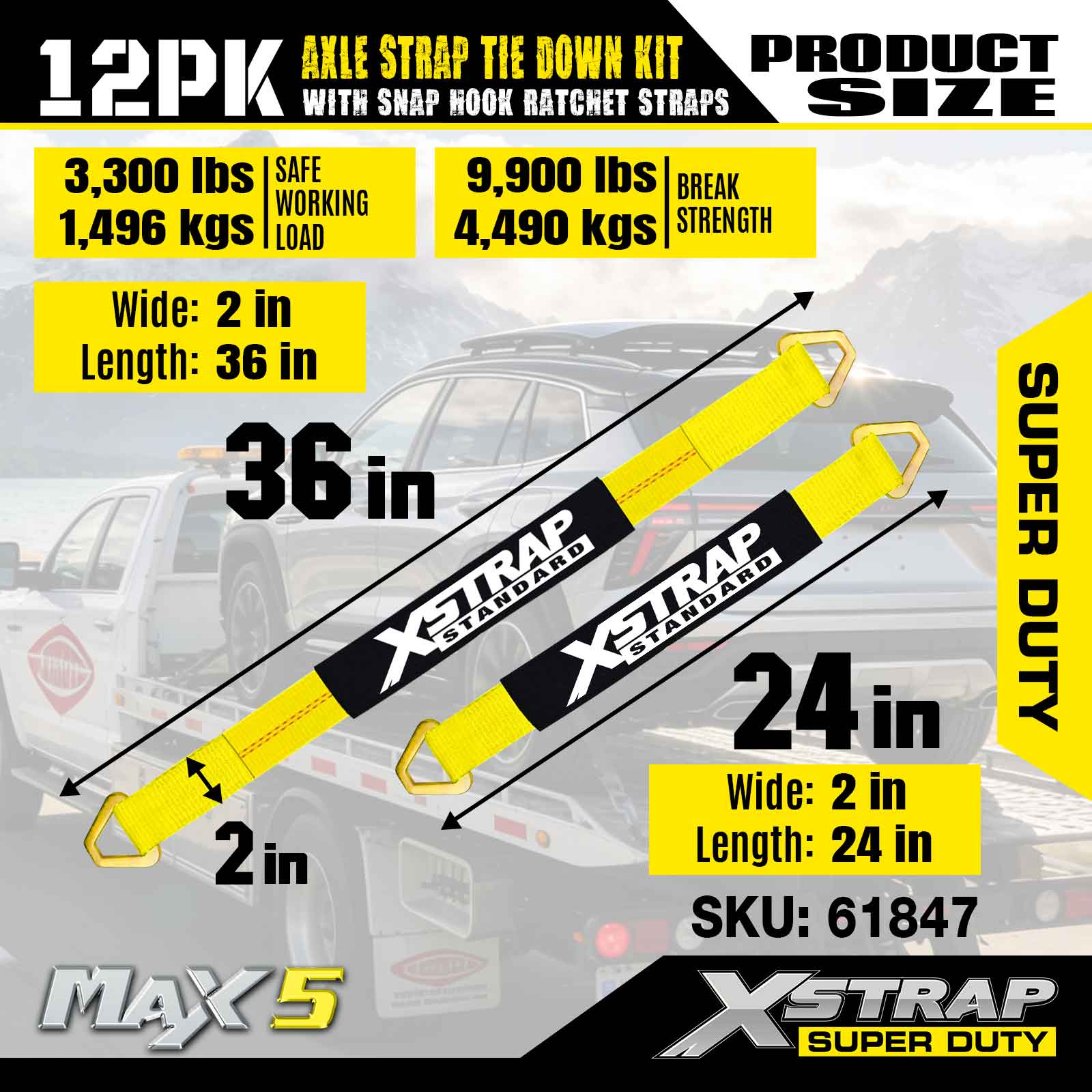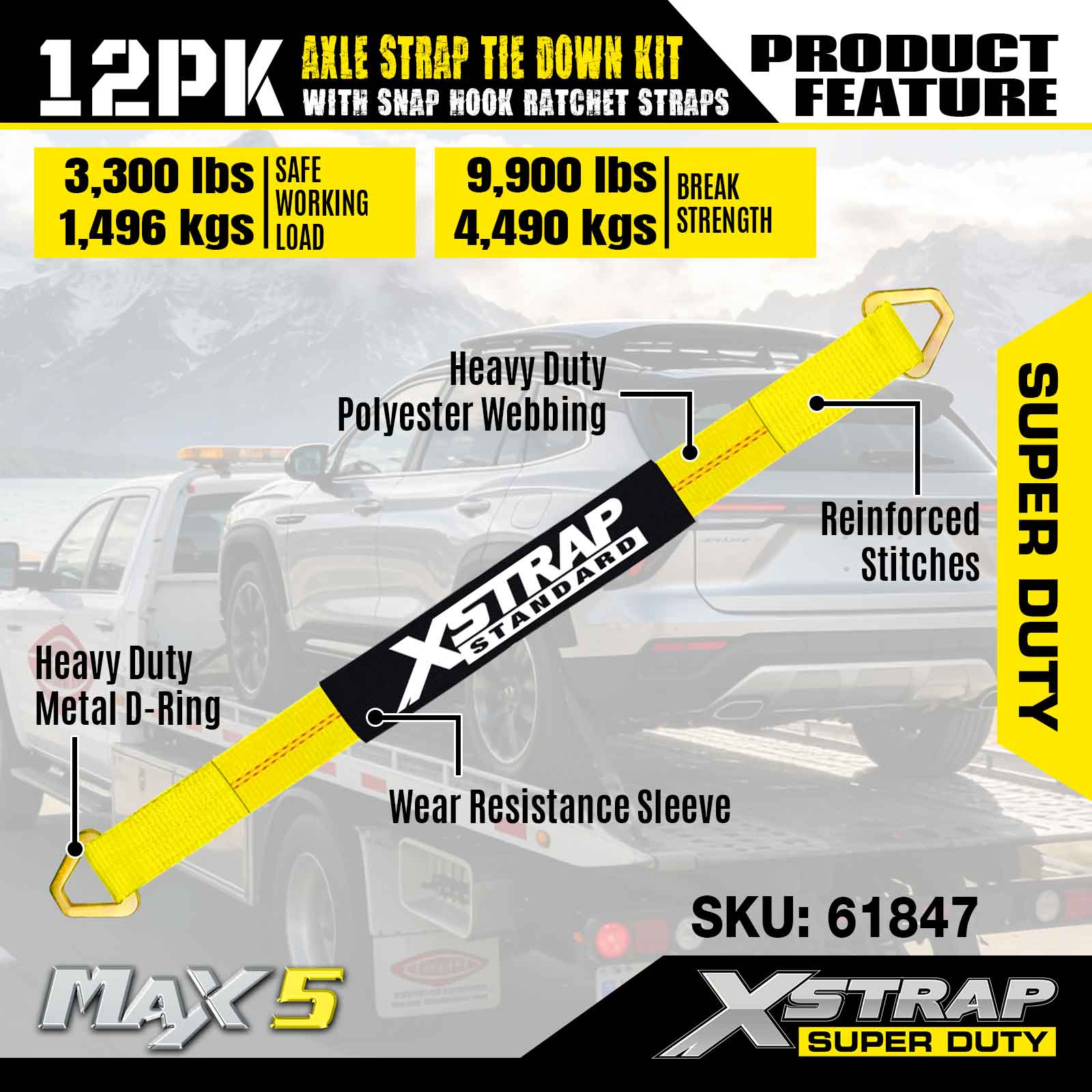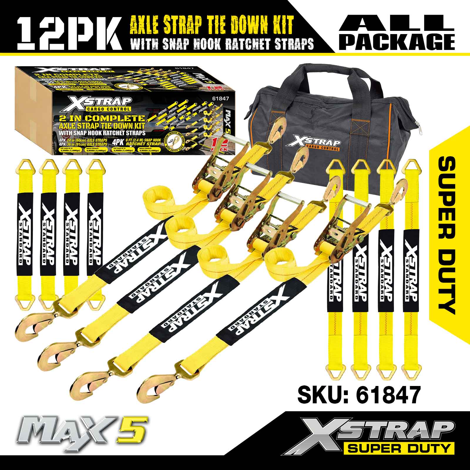 Bộ dây buộc dây đeo trục Xstrap 12PK (có dây đeo móc khóa) – Super Duty. Nó có tải trọng làm việc an toàn là 3.300LBS (1.496KG) và độ bền đứt là 10.000LBS (4.490KG).