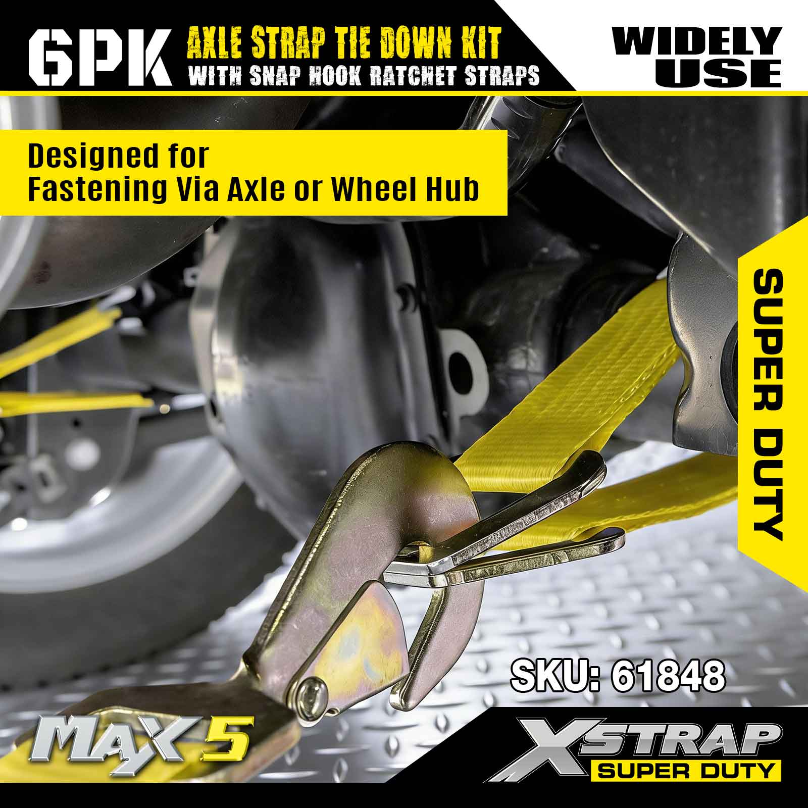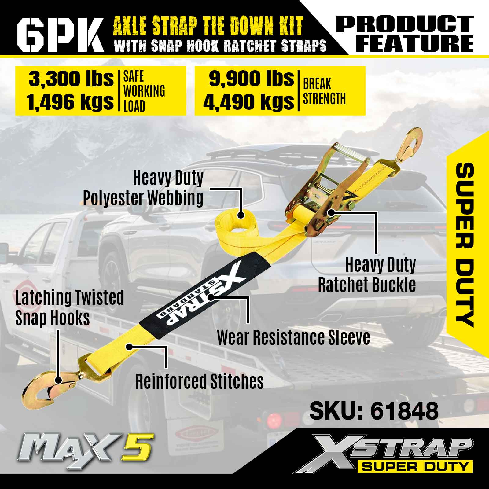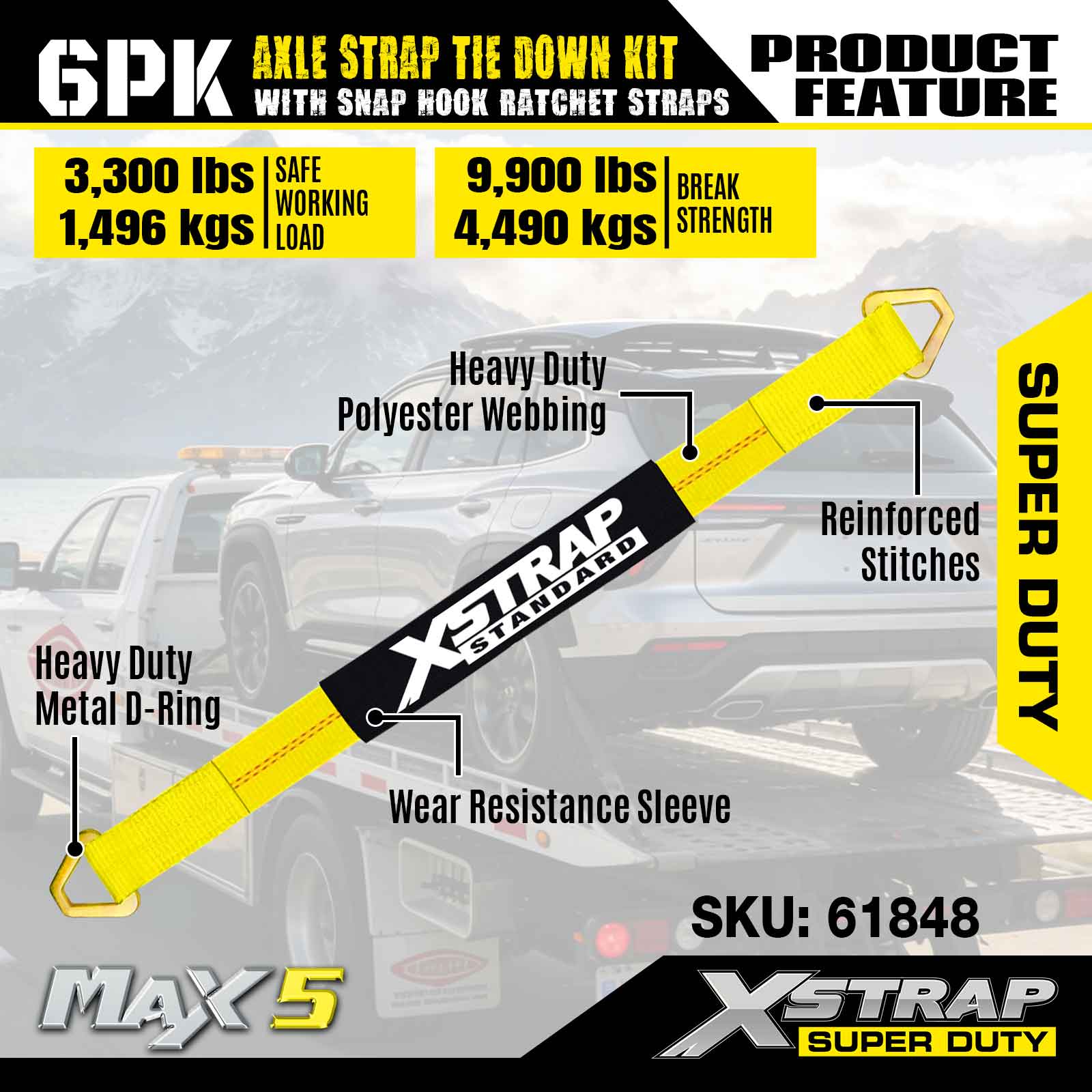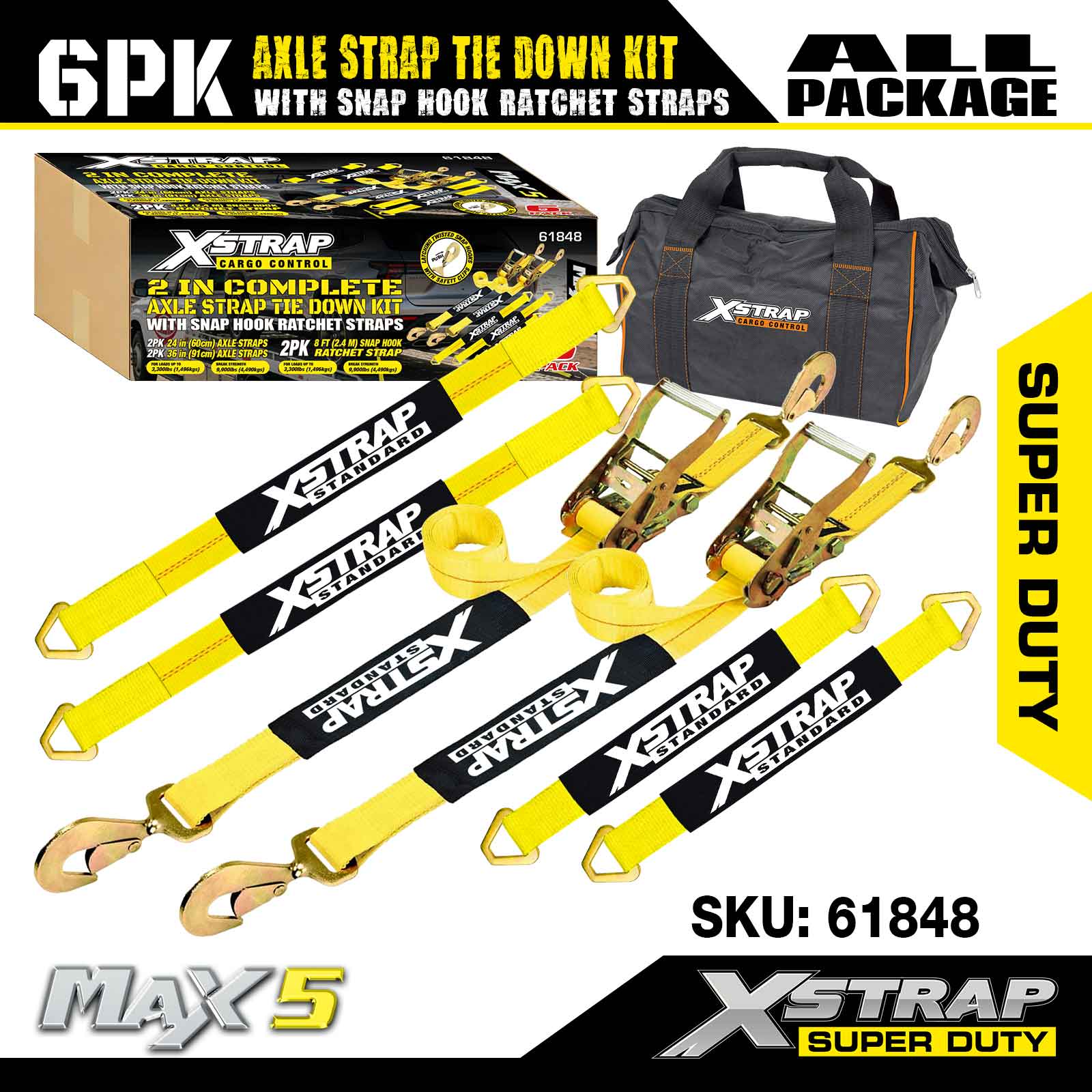 Bộ dây buộc dây đeo trục Xstrap 6PK (có dây đeo móc khóa) – Super Duty. Nó có tải trọng làm việc an toàn là 3.300LBS (1.496KG) và độ bền đứt là 9.900LBS (4.490KG).