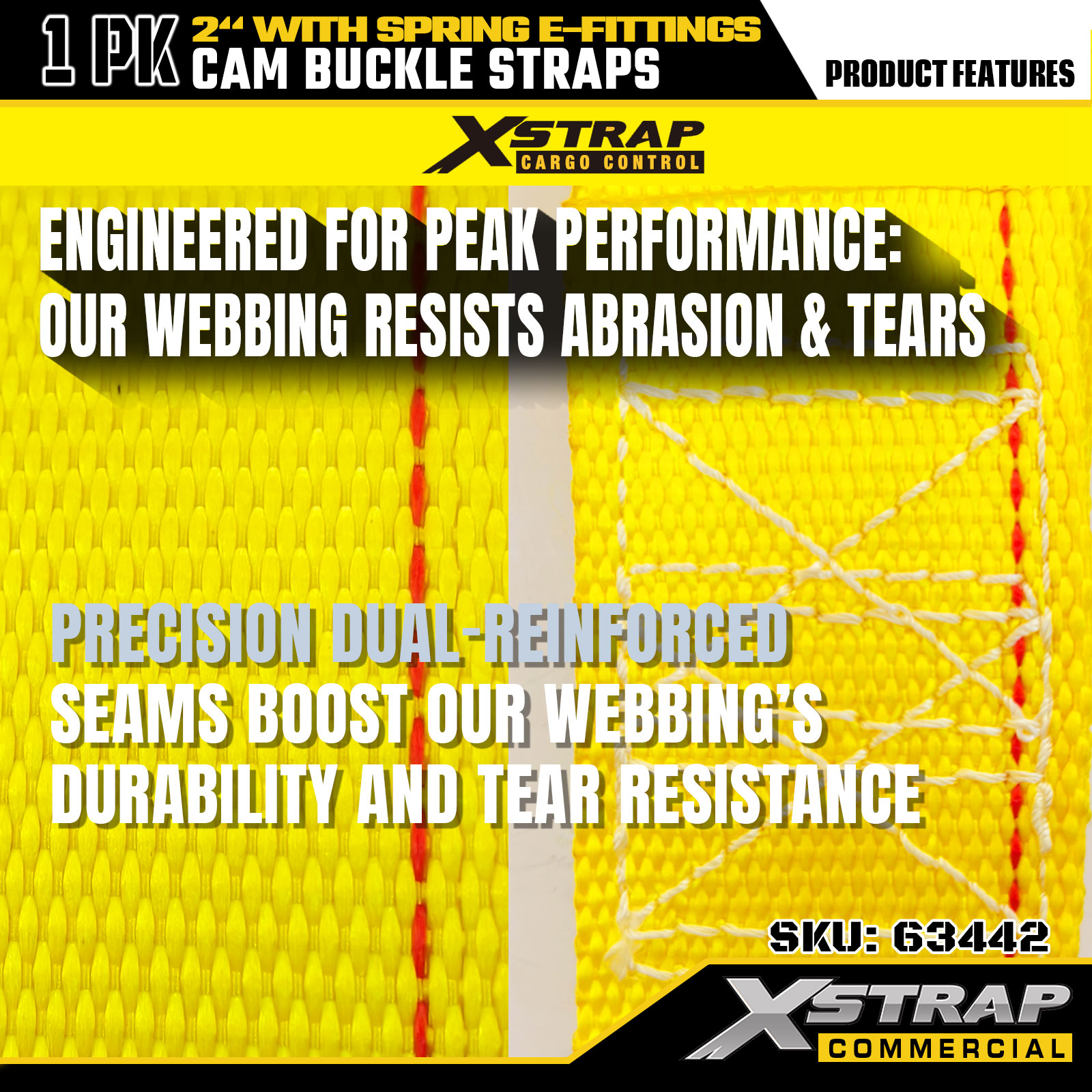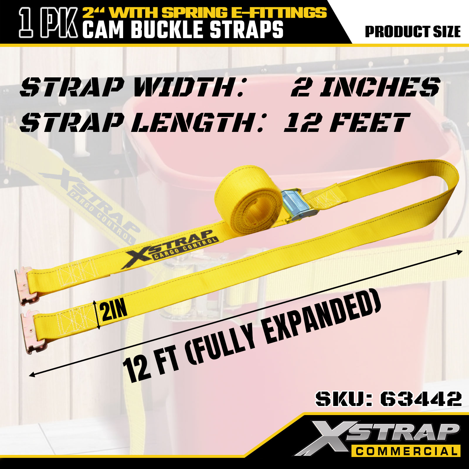 Xstrap 63442 Dây đeo khóa cam hạng nặng 2" x 12' (1PK) - Polyester màu vàng với phụ kiện điện tử lò xo, 1000 lbs SWL & 453 lbs Độ bền đứt để di chuyển, kiểm soát hàng hóa và vận chuyển