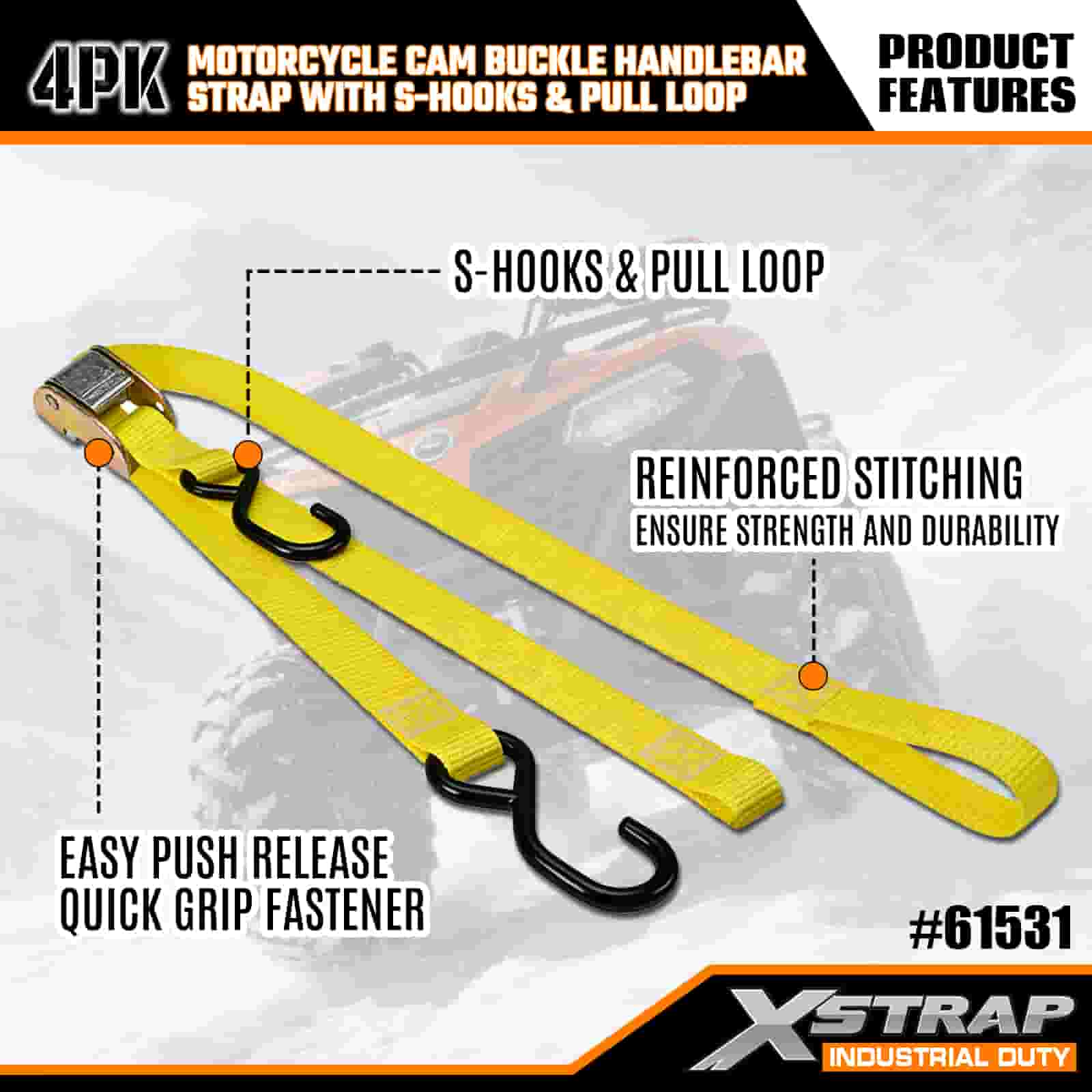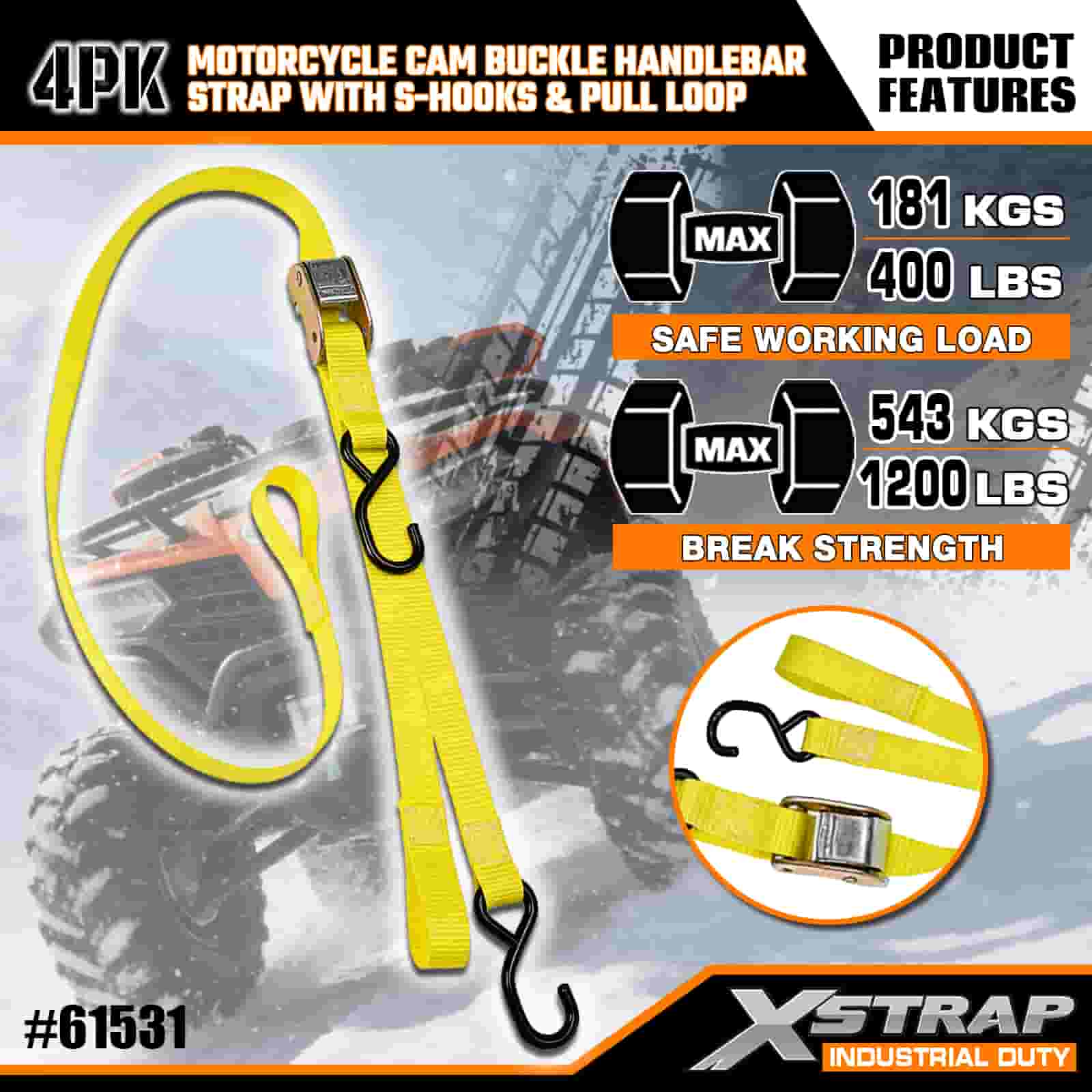 Dây đeo tay cầm khóa cam xe máy Xstrap 4PK có móc S & vòng kéo, Dây đeo buộc xuống bằng vải polyester 1” x 6’ Dây đeo khóa cam kéo, Dây buộc chắc chắn hàng hóa có sức chứa 400lbs với móc S dành cho chuyên gia nghiêm túc để đảm bảo an toàn cho xe moóc chở hàng, xe moóc giường phẳng, thuyền trượt tuyết, ô tô nhỏ.