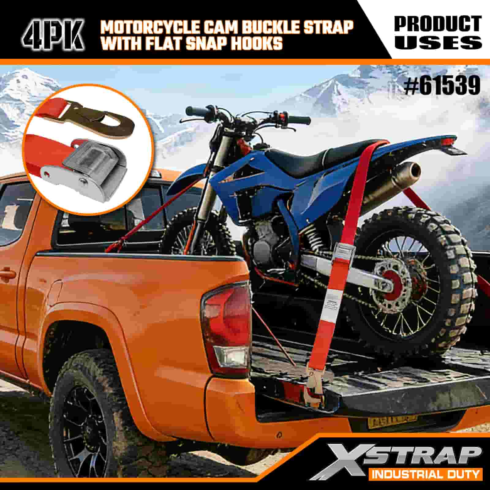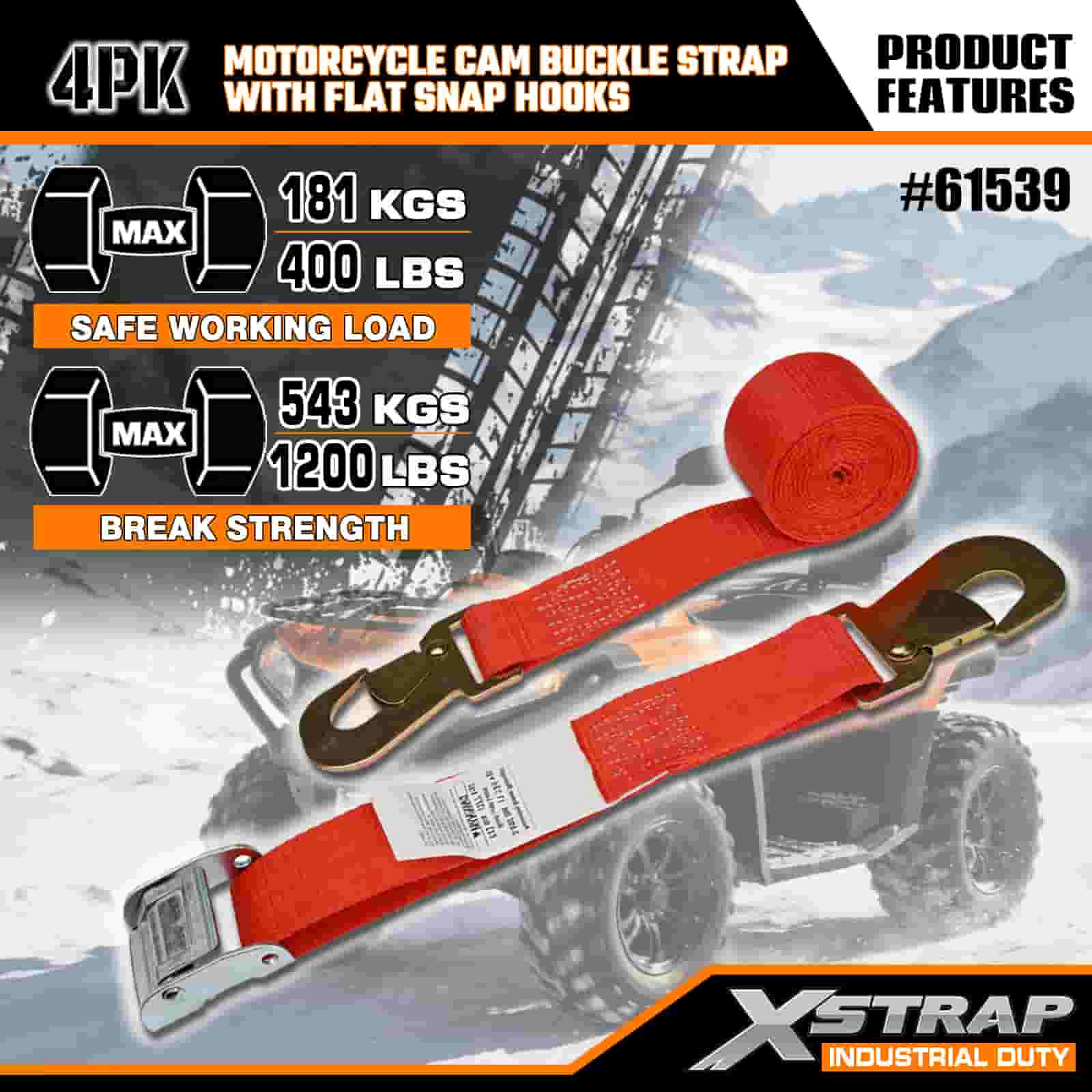 - Xếp hạng tải trọng được chứng nhận (Không cần phỏng đoán): Mỗi dây đeo hiển thị rõ ràng tải trọng làm việc an toàn 181 KGS/400 LBS và độ bền đứt 543 KGS/1200 LBS (đáp ứng các tiêu chuẩn an toàn vận chuyển). Bạn sẽ không bao giờ thắc mắc liệu xe máy của bạn có an toàn hay không.