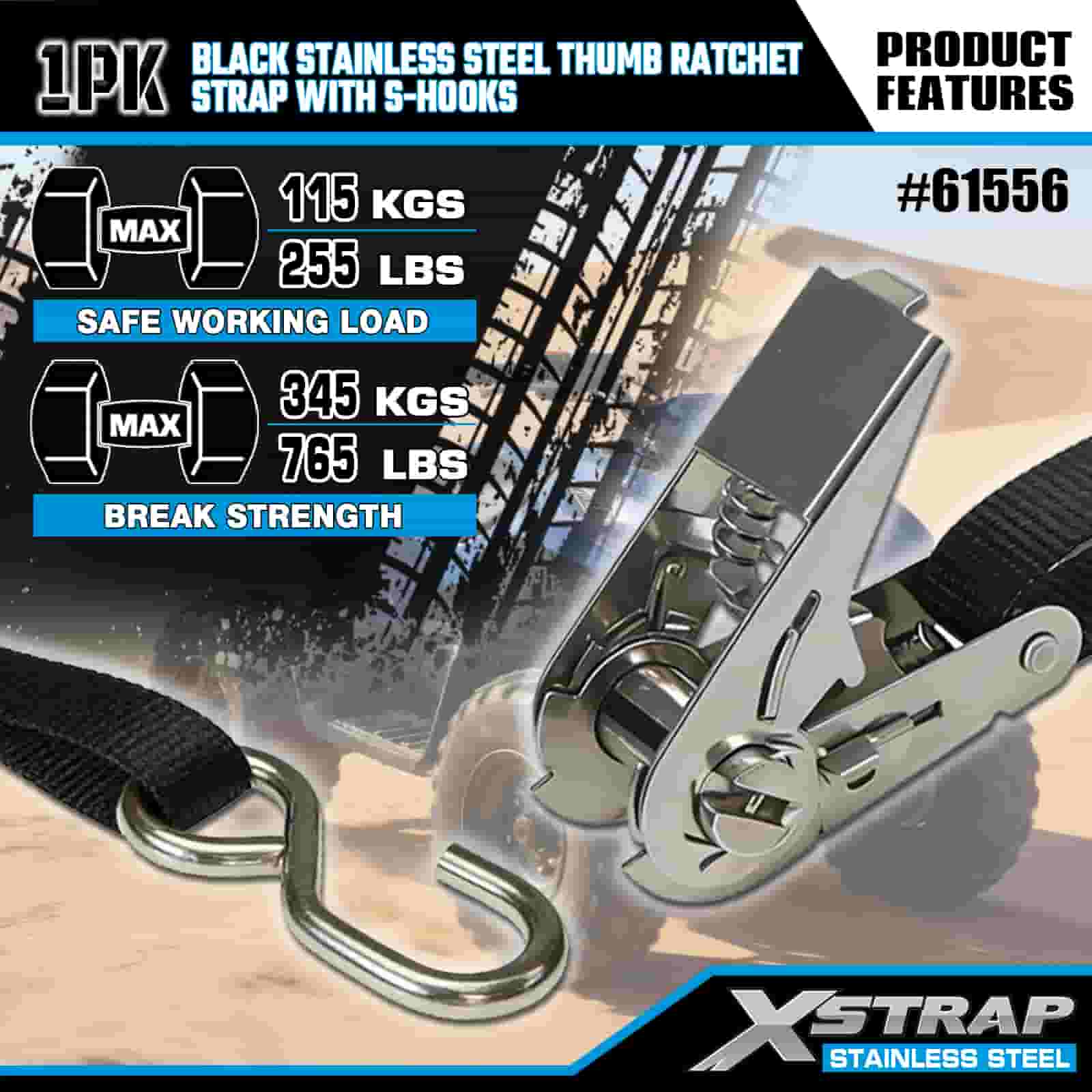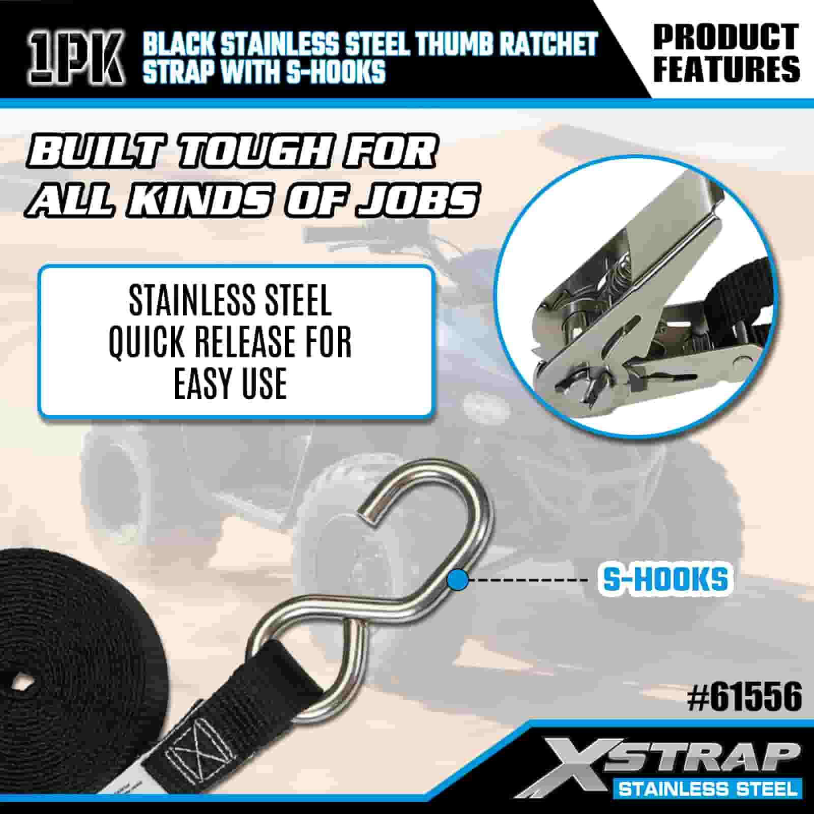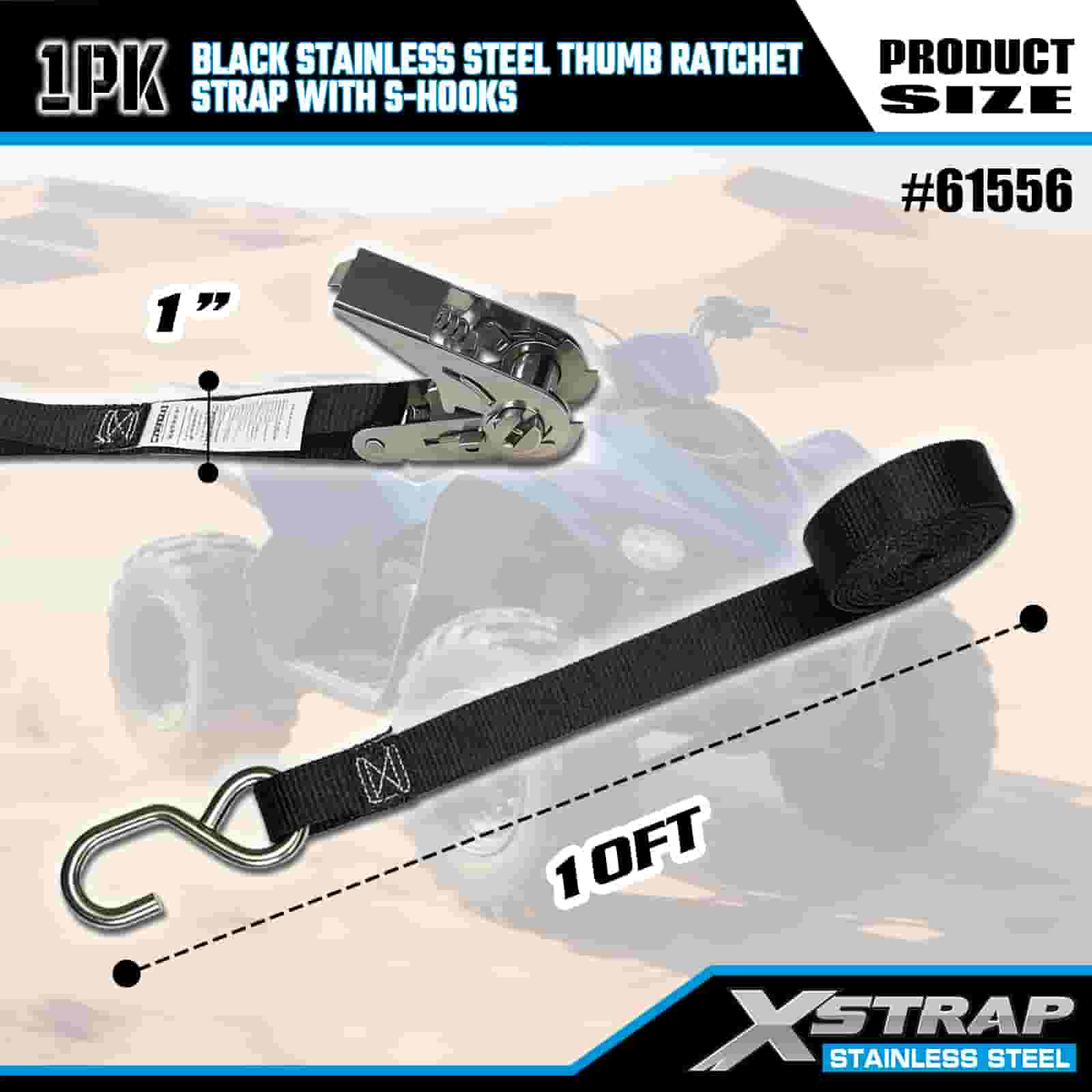 Xstrap Bánh cóc ngón tay cái bằng thép không gỉ màu đen có móc chữ S, Dây đeo buộc xuống bằng polyester 1” x 10' Dây đeo bánh cóc, Dây buộc chắc chắn hàng hóa có sức chứa 255 lbs có móc chữ S cho Rơ moóc, Thuyền trượt tuyết rơ moóc giường phẳng, Ô tô nhỏ, Thiết bị nặng.