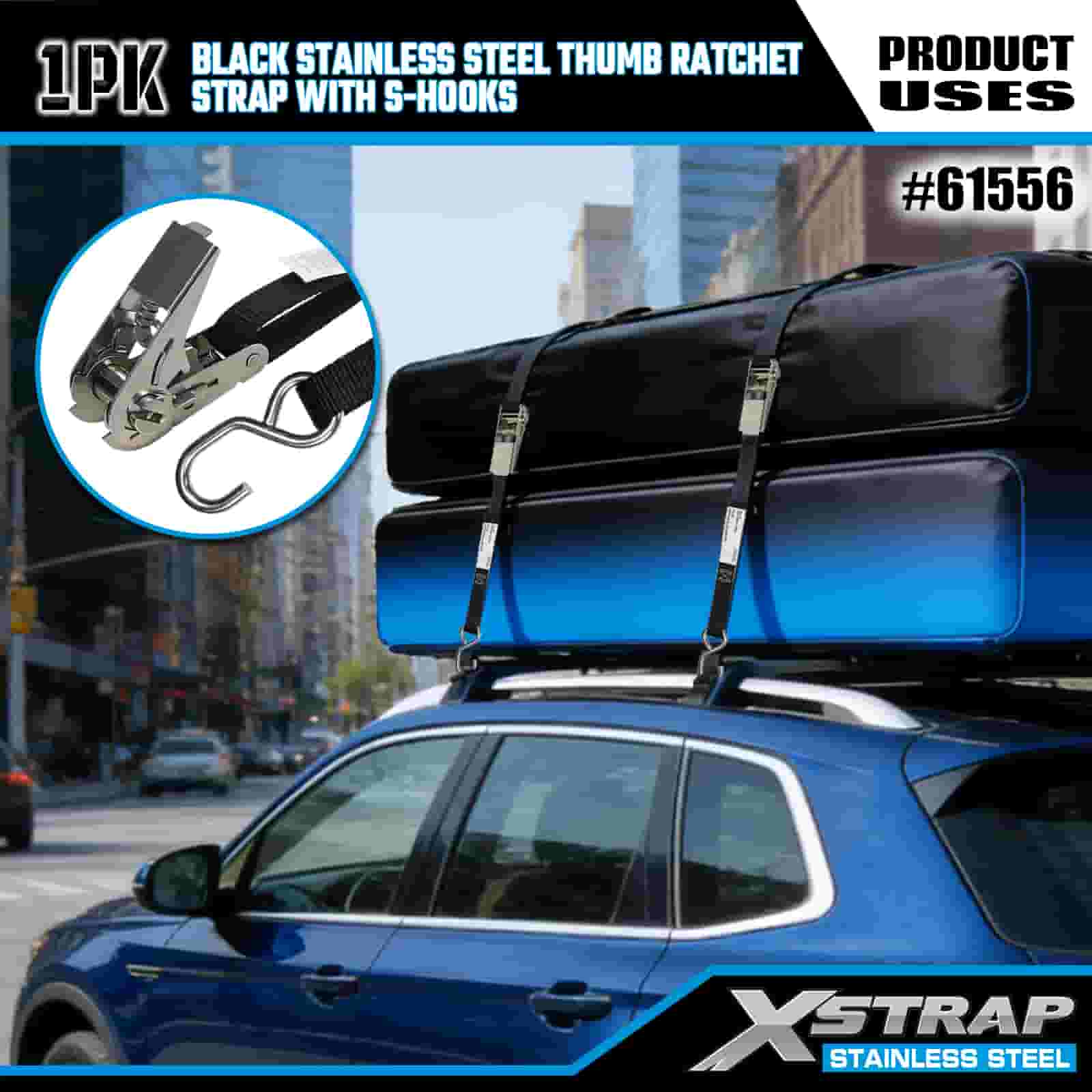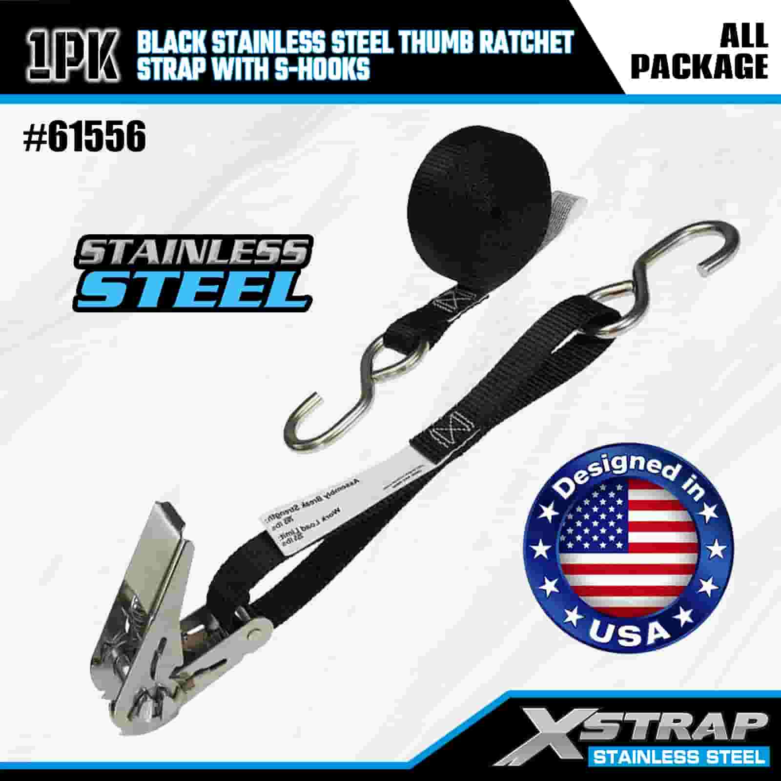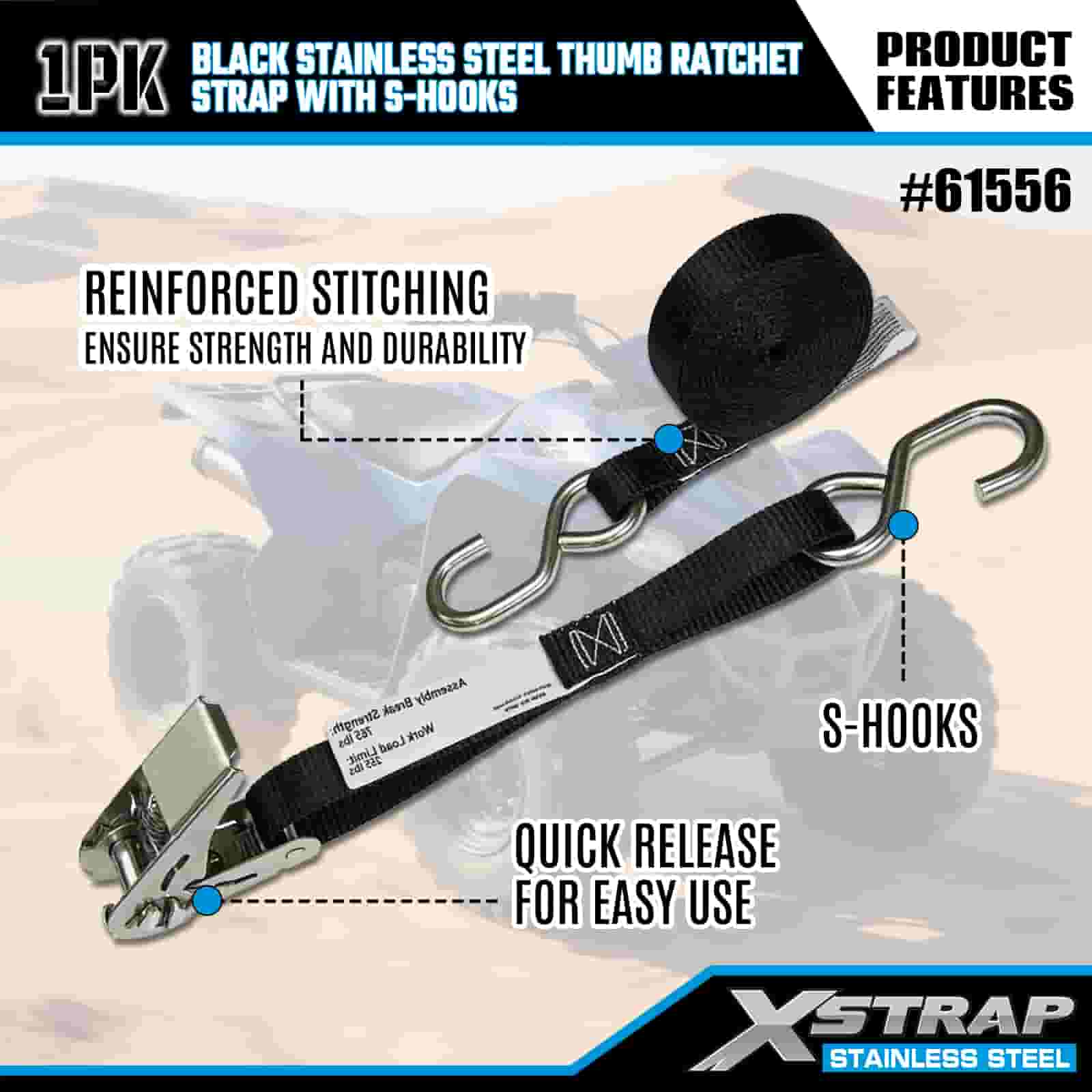 Xstrap Bánh cóc ngón tay cái bằng thép không gỉ màu đen có móc chữ S, Dây đeo buộc xuống bằng polyester 1” x 10' Dây đeo bánh cóc, Dây buộc chắc chắn hàng hóa có sức chứa 255 lbs có móc chữ S cho Rơ moóc, Thuyền trượt tuyết rơ moóc giường phẳng, Ô tô nhỏ, Thiết bị nặng.