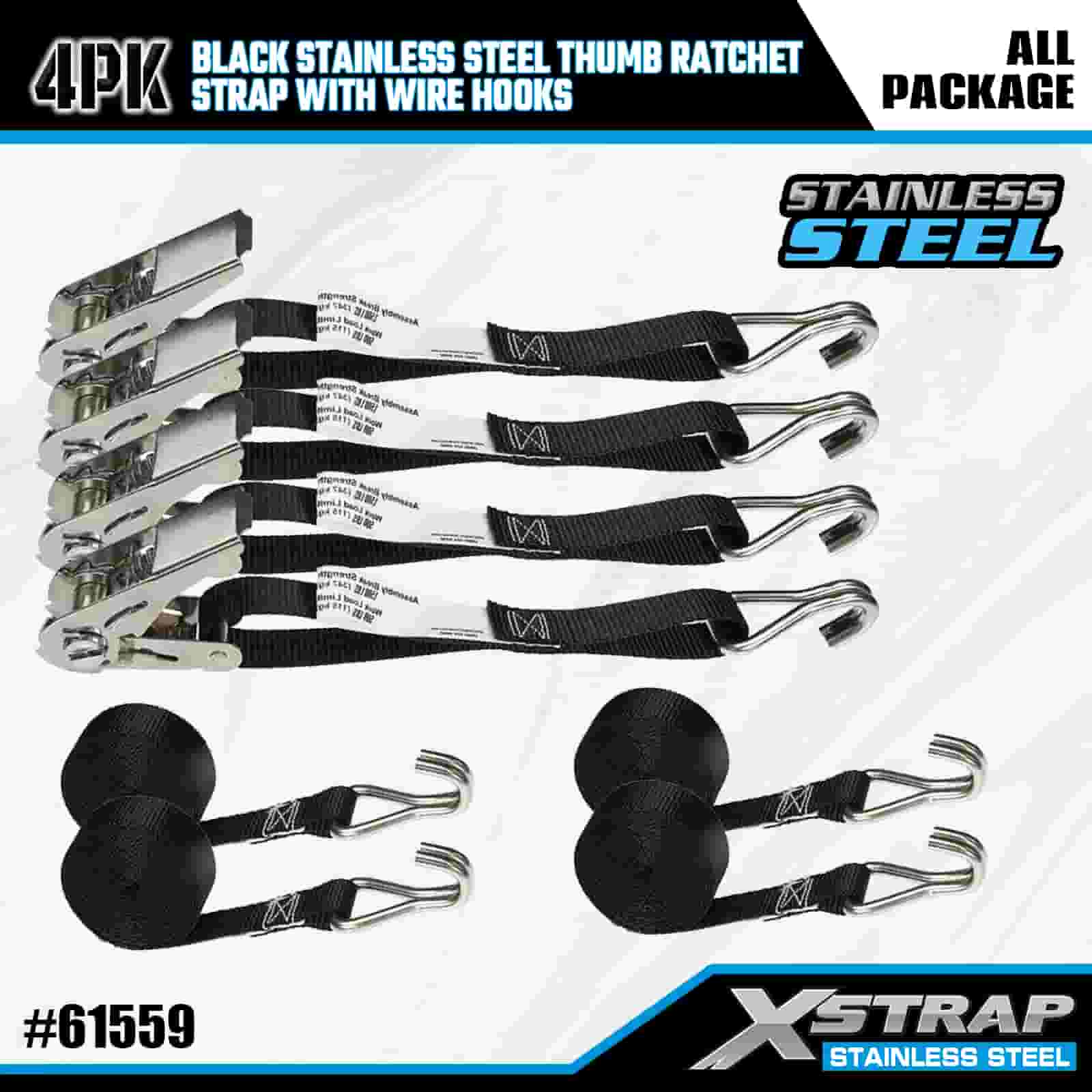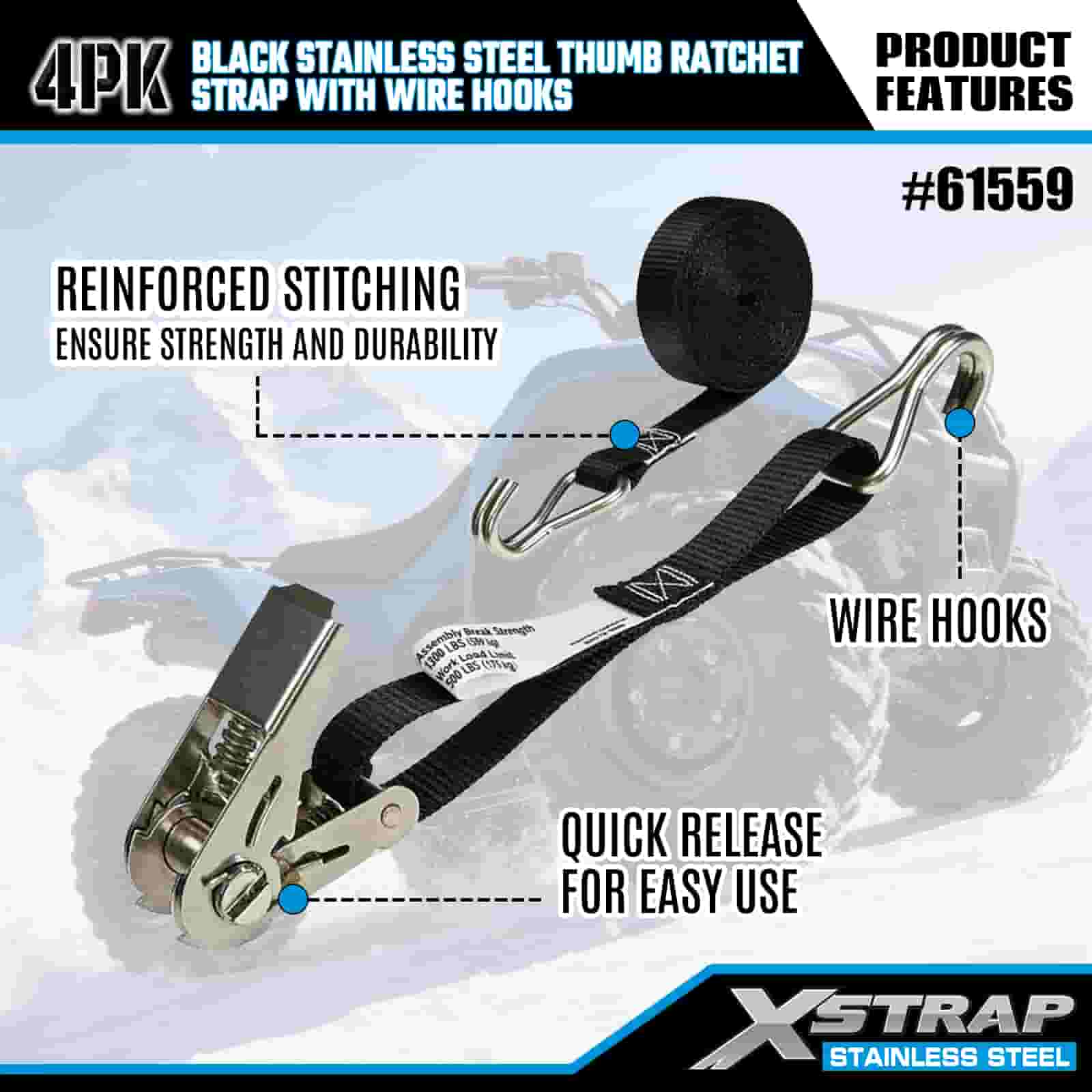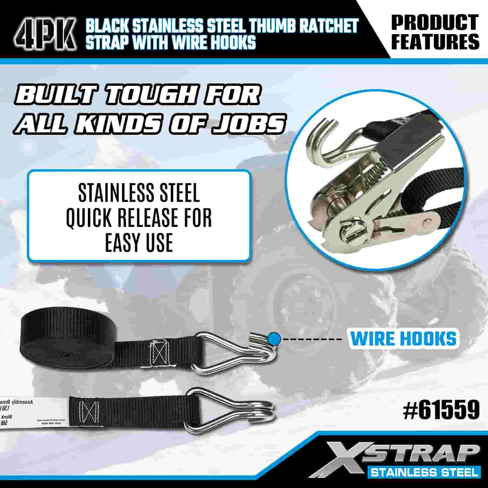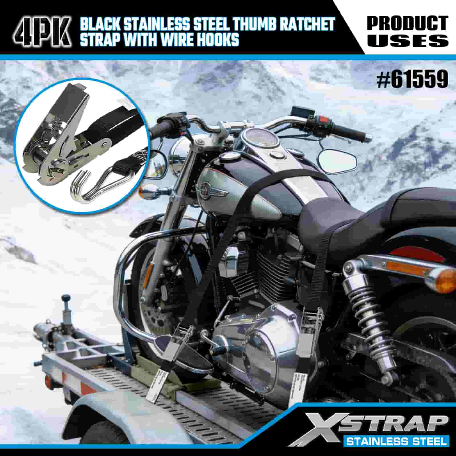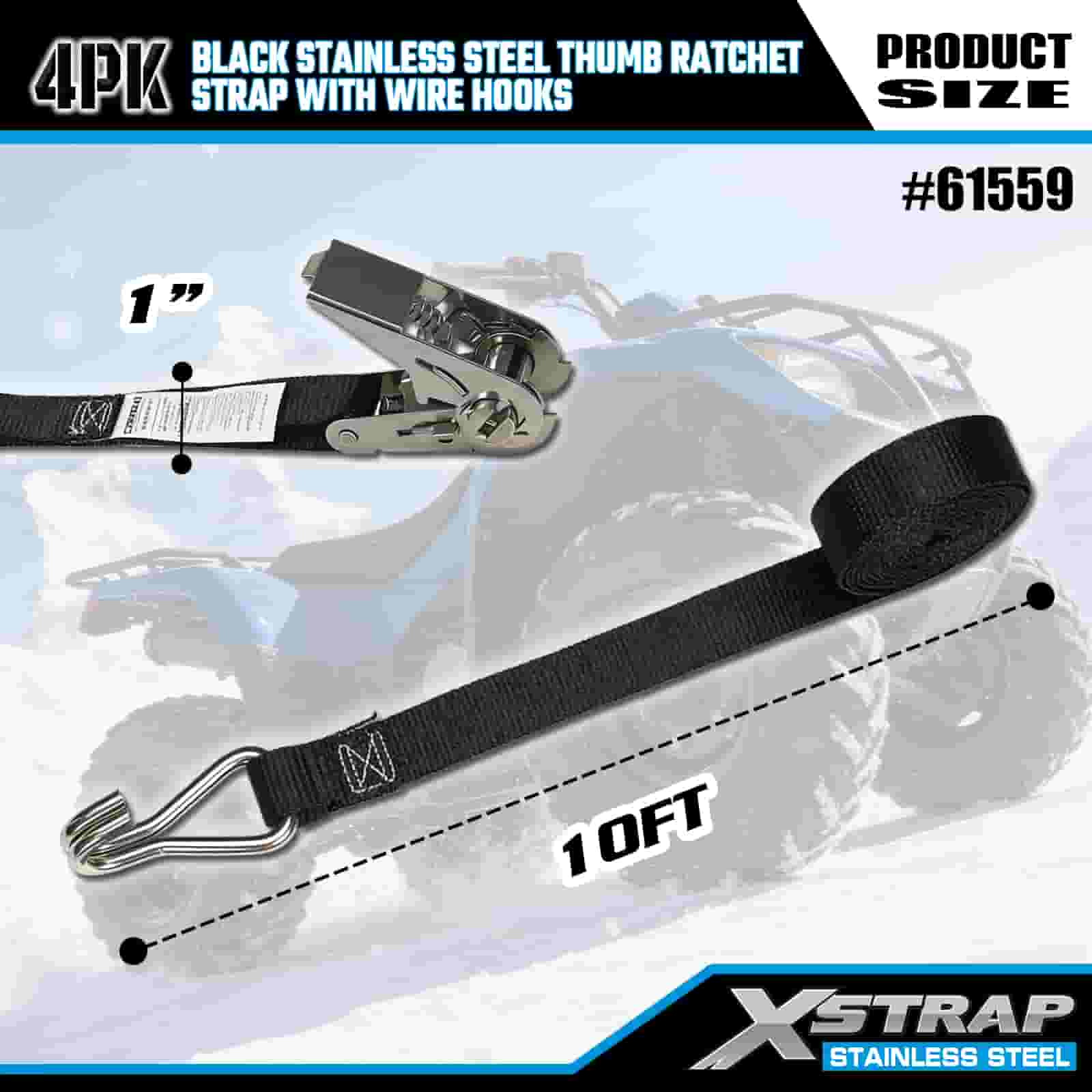 Xstrap 4PK Bánh cóc ngón tay cái bằng thép không gỉ màu đen có móc dây, Dây đeo buộc xuống bằng polyester 1" x 10' Dây đeo Ratchet, Dây đai buộc hàng hóa có sức chứa 500lbs có móc dây cho xe moóc, thuyền trượt tuyết xe moóc giường phẳng, xe nhỏ, thiết bị nặng.