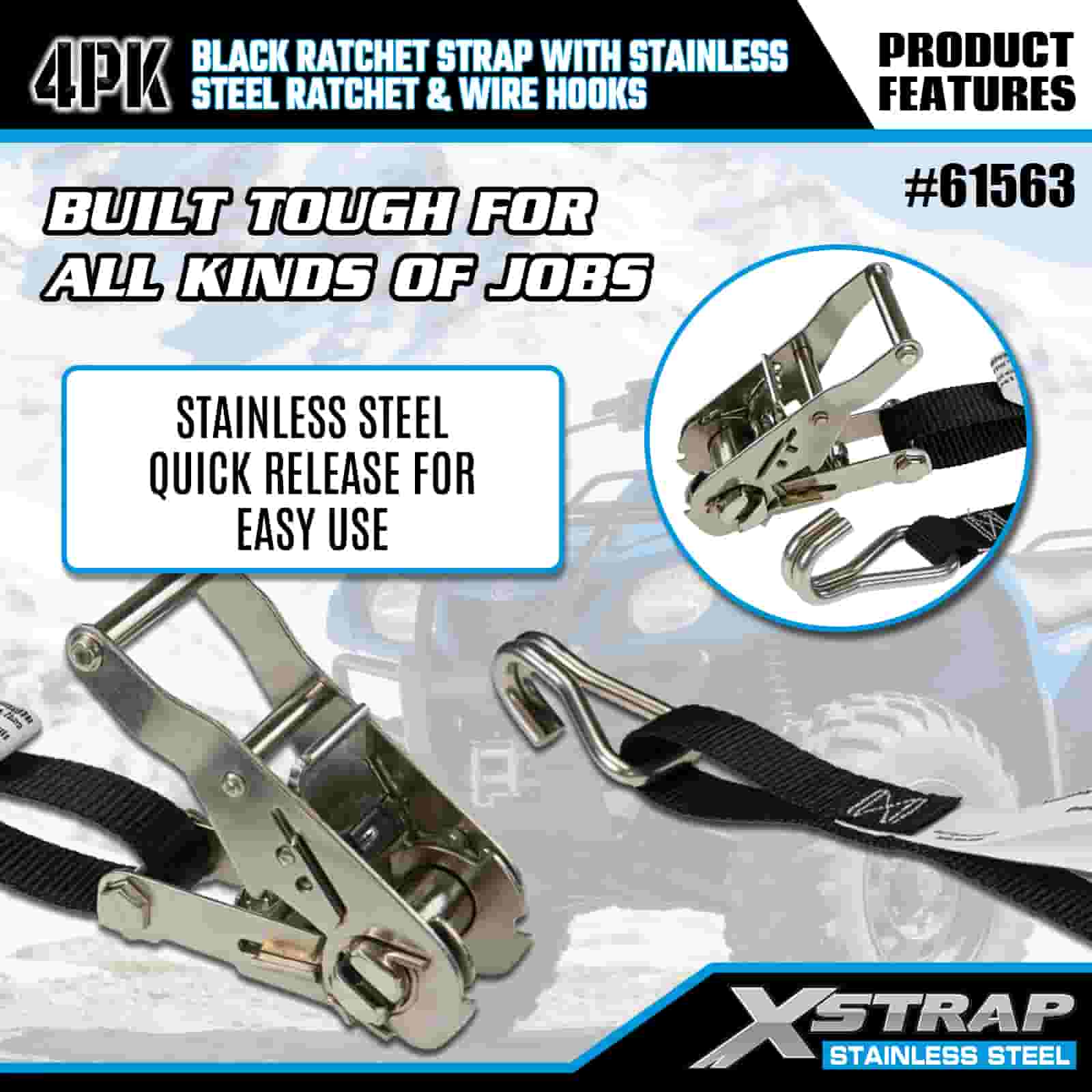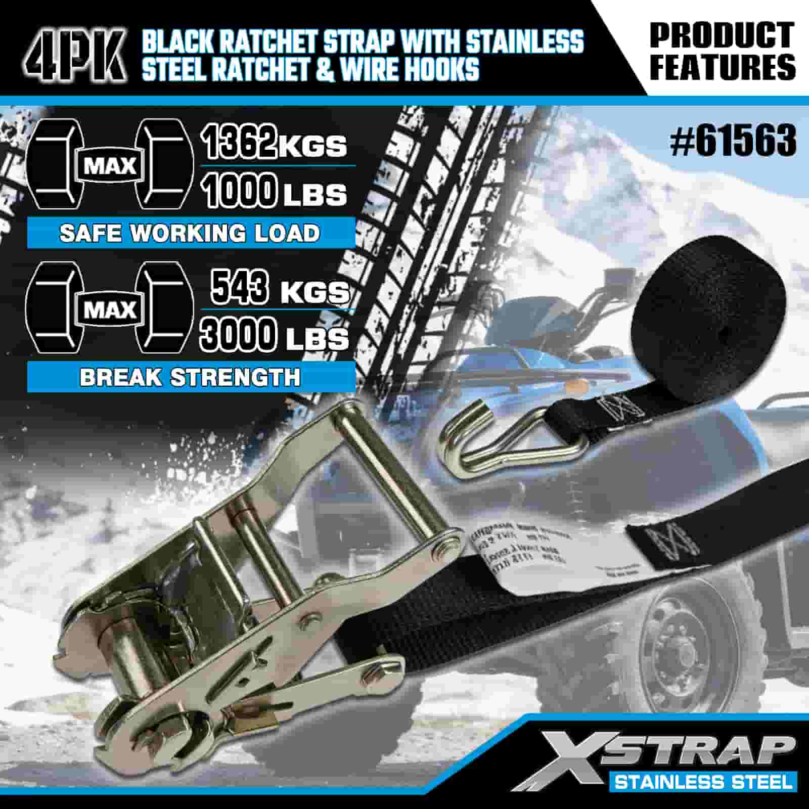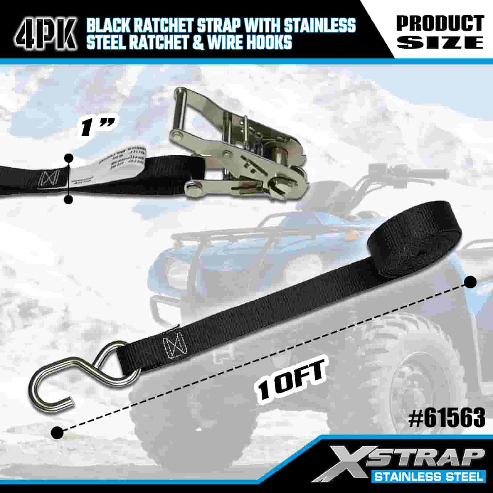 Dây đeo Ratchet màu đen Xstrap 4PK với bánh cóc và móc dây bằng thép không gỉ, Dây đeo buộc xuống bằng polyester 1” x 10 ’ Dây đeo bánh cóc, Dây buộc chắc chắn hàng hóa có công suất 1000lbs có móc dây cho xe moóc, thuyền trượt tuyết rơ moóc giường phẳng, ô tô nhỏ, thiết bị nặng.