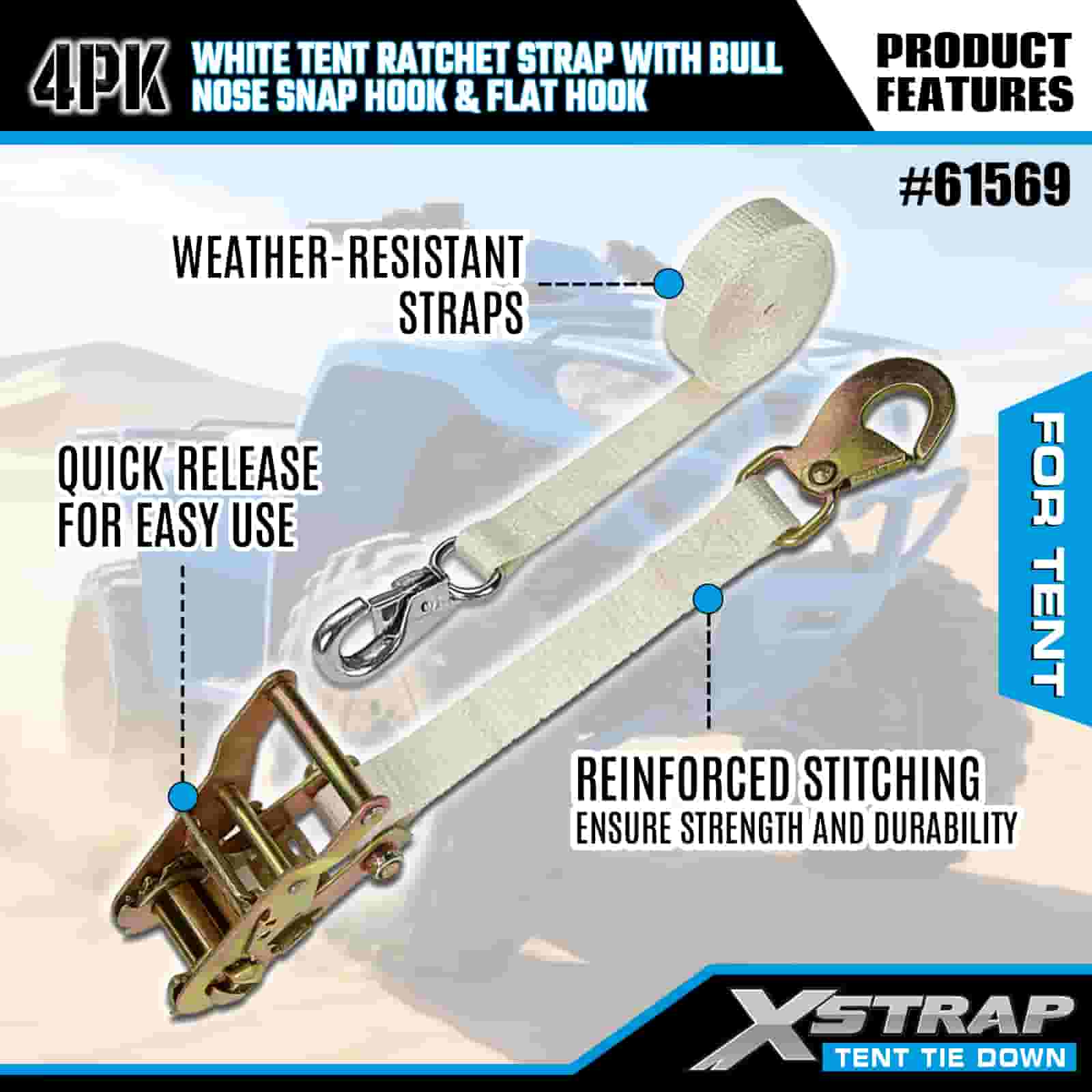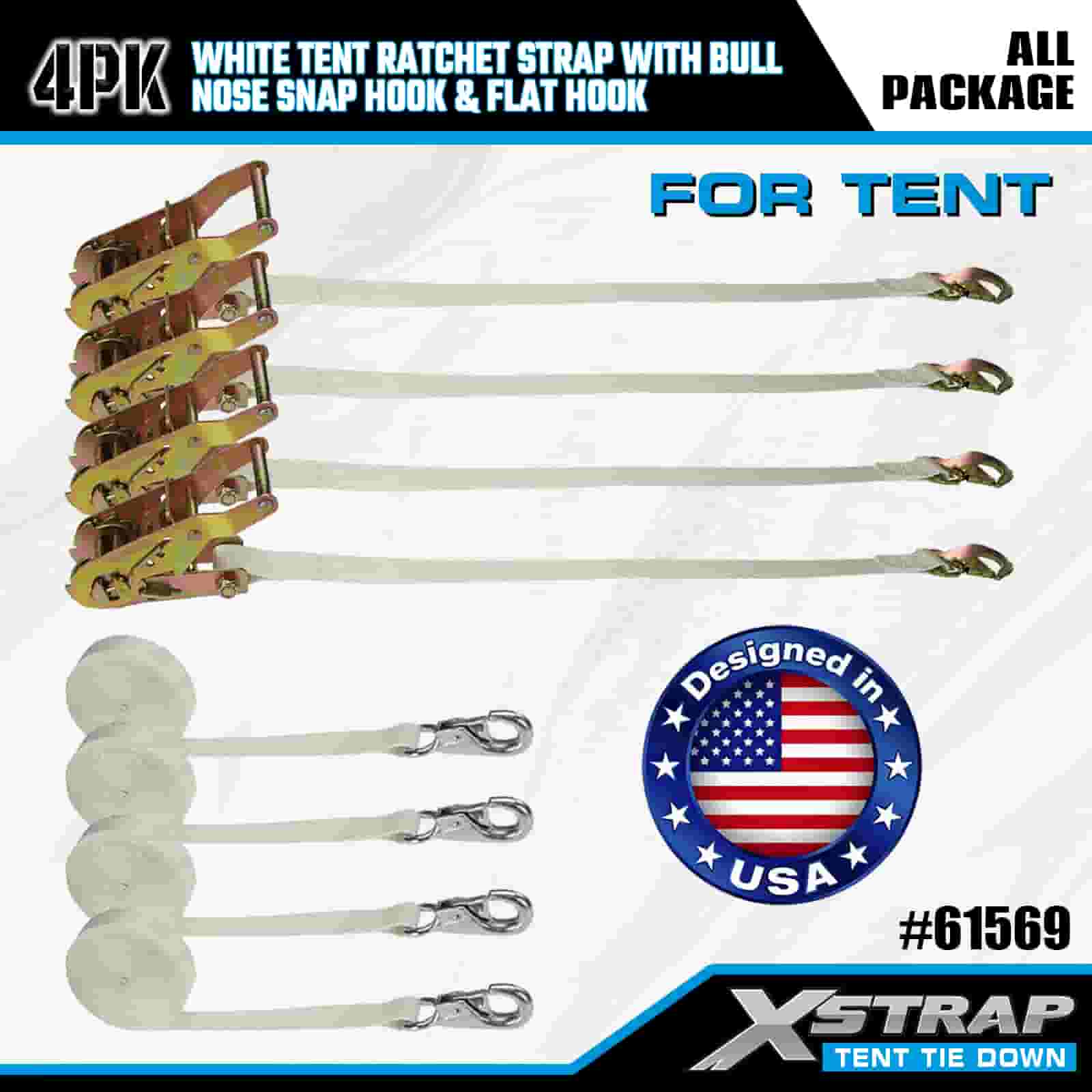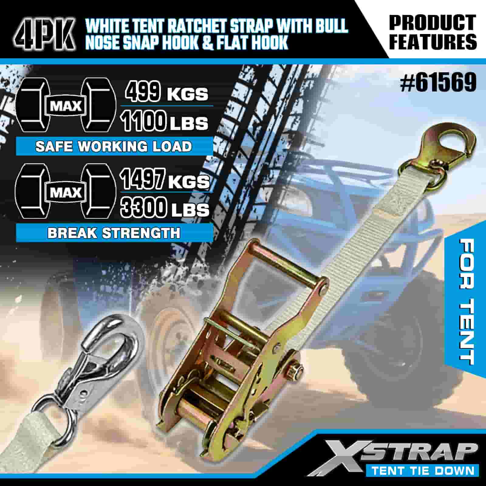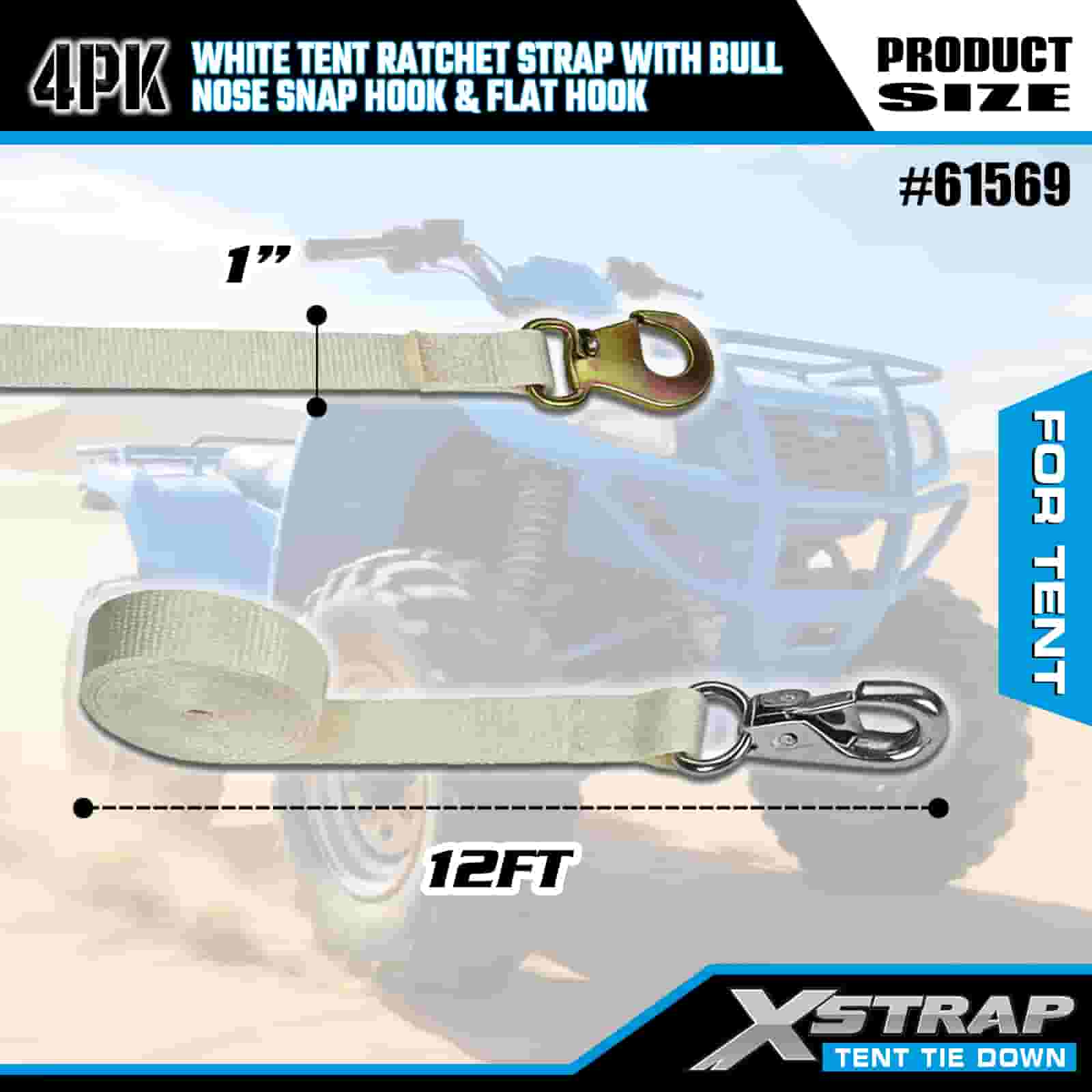 Dây đeo Ratchet Xstrap 4PK màu trắng có móc khóa mũi bò và móc phẳng, dây buộc bằng vải polyester 1” x 12 ’ Dây đeo Ratchet, dây đai buộc hàng hóa có sức chứa 1100lbs với móc khóa mũi và móc phẳng để kiểm soát hàng hóa, cố định lều.