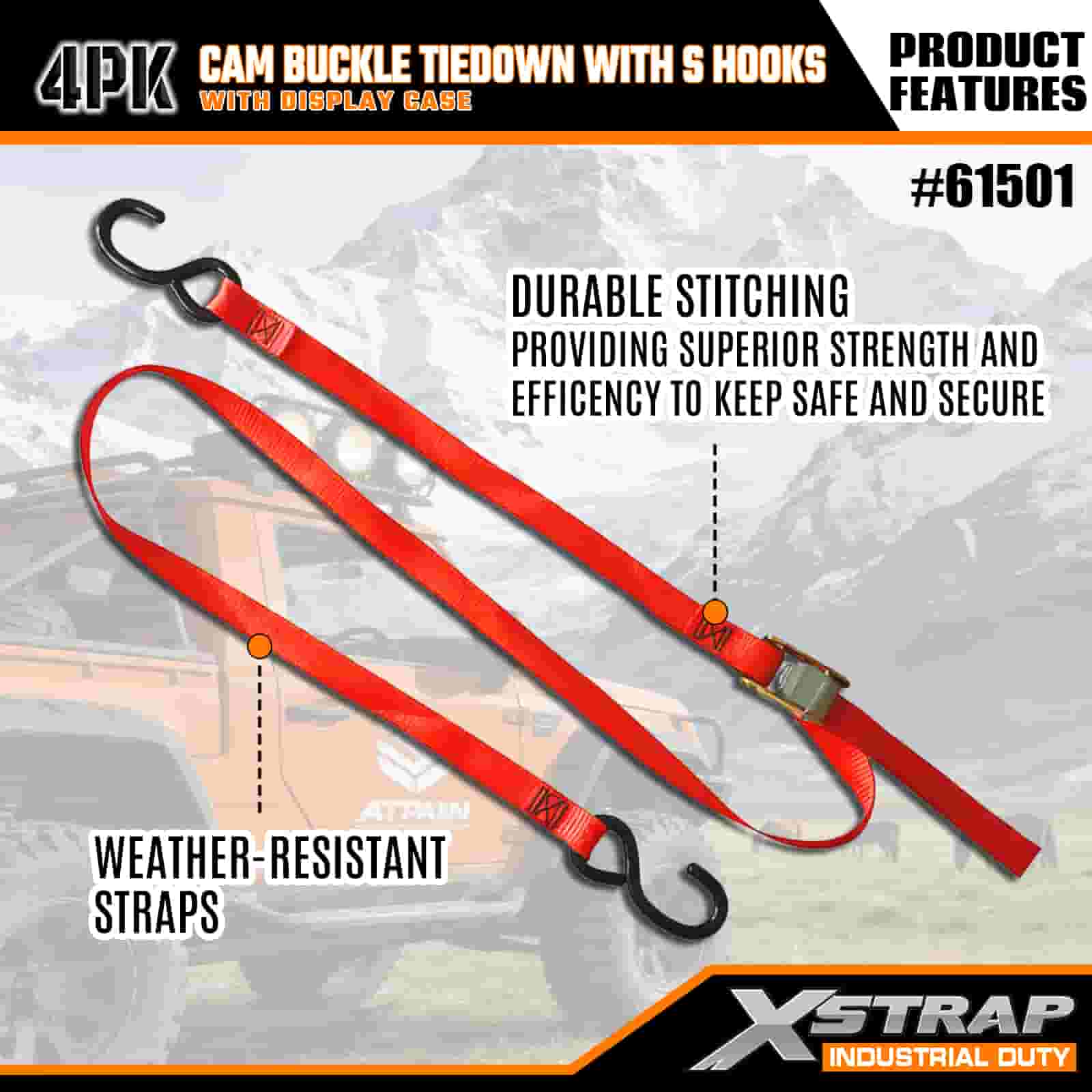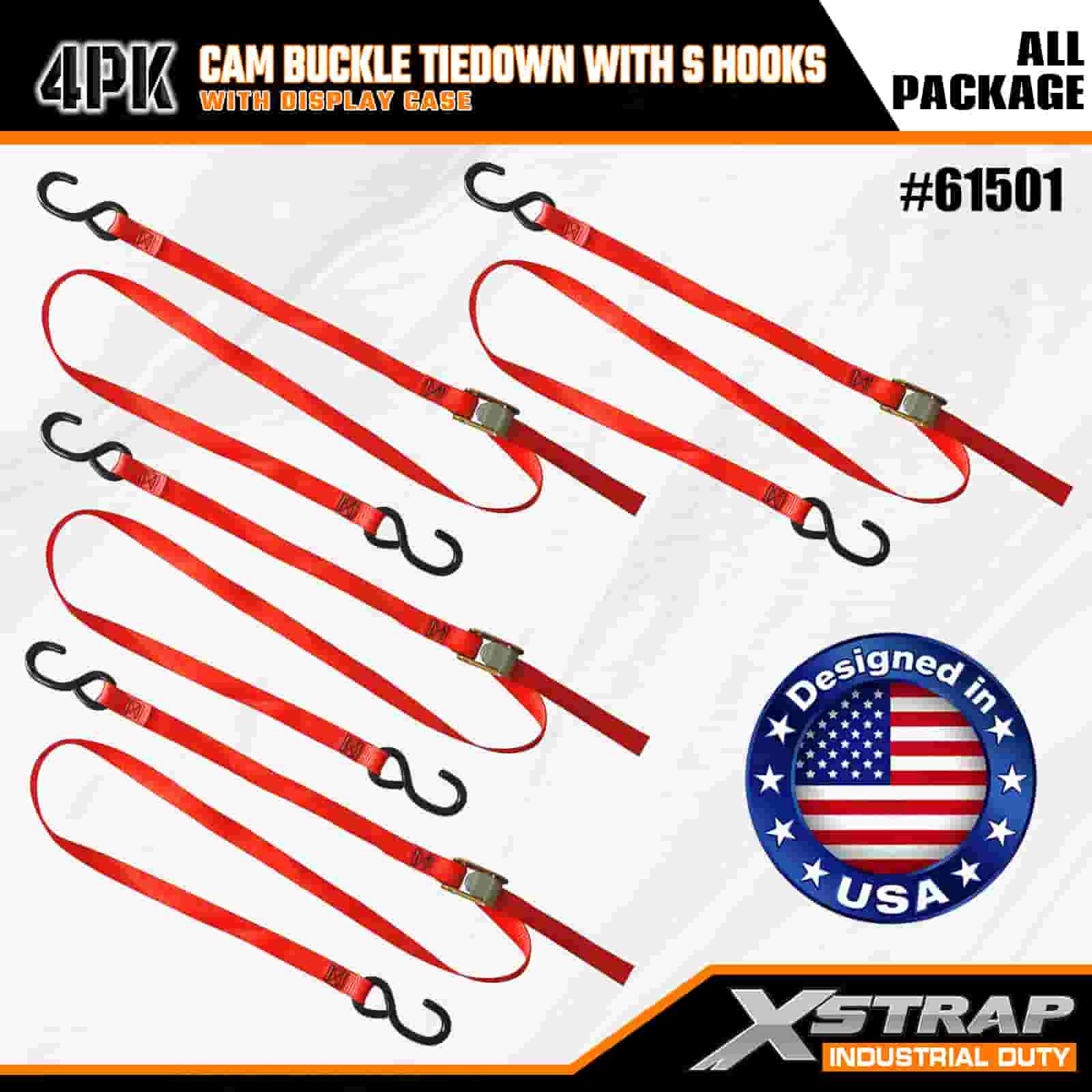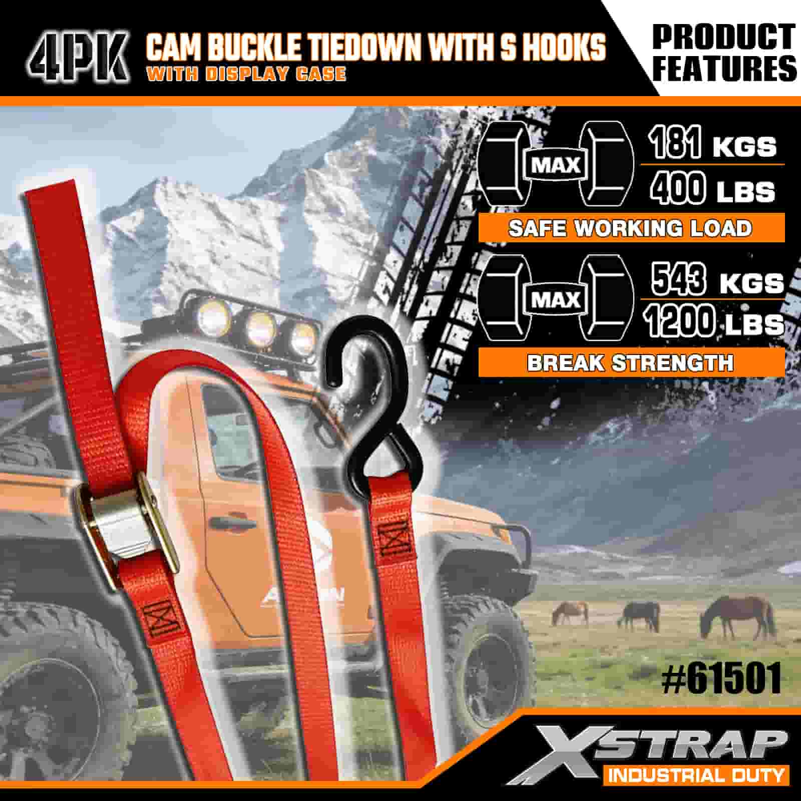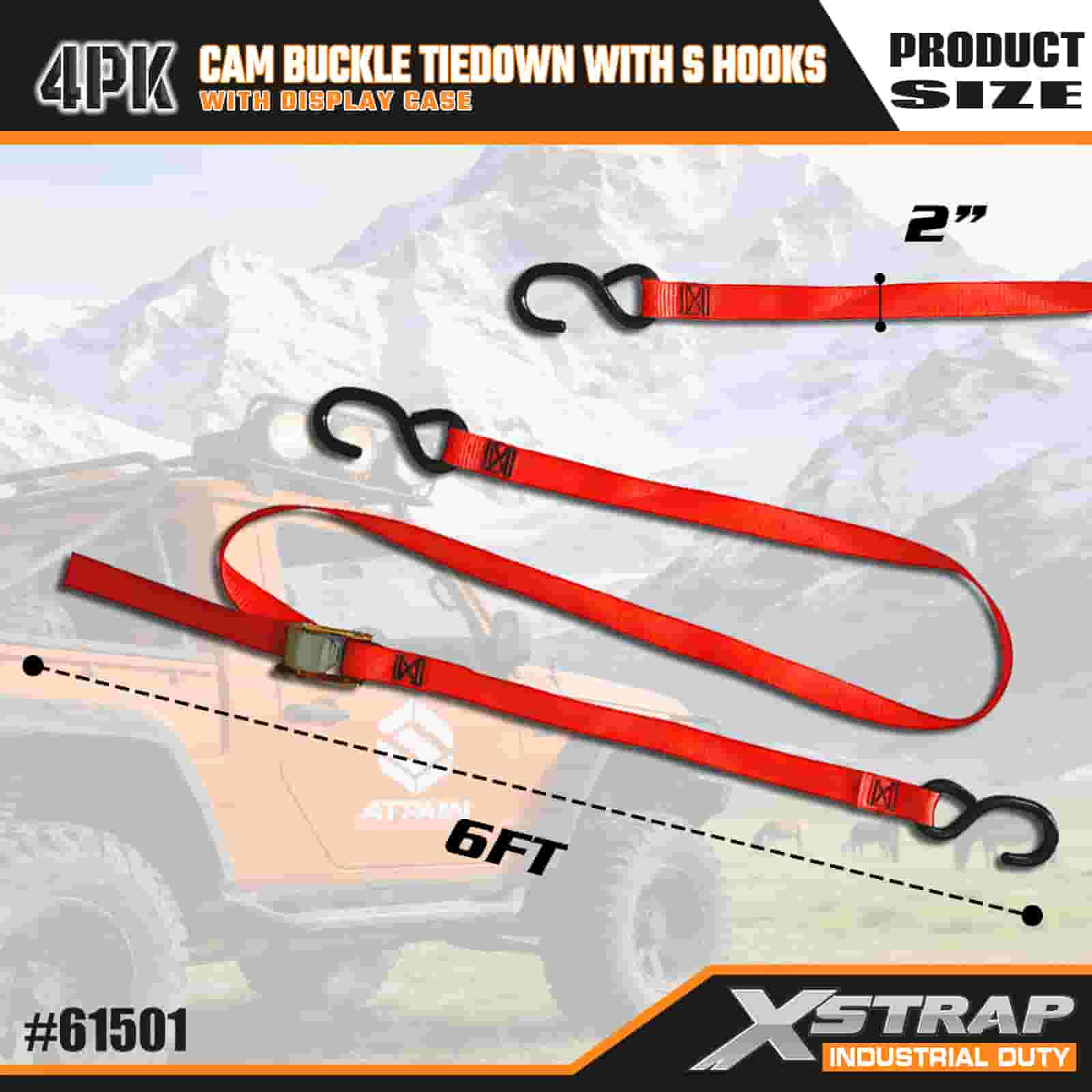 Xstrap 4 gói Cam Buckle Tie Down with S Hooks, 2” x 6’ Polyester Tie Down Strap with Cam Buckle, Dây đai buộc hàng hóa có sức chứa 400 lbs với móc S dành cho chuyên gia nghiêm túc để bảo đảm an toàn cho xe moóc chở hàng, xe moóc giường phẳng, thuyền trượt tuyết, ô tô nhỏ.
