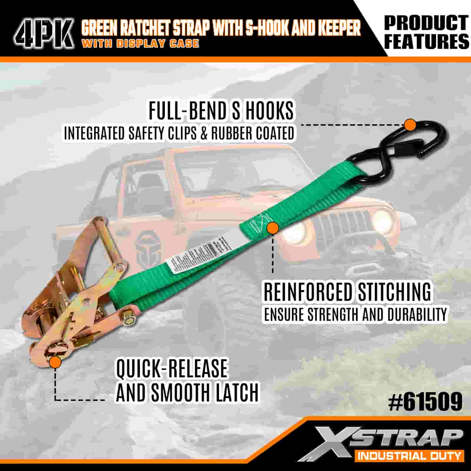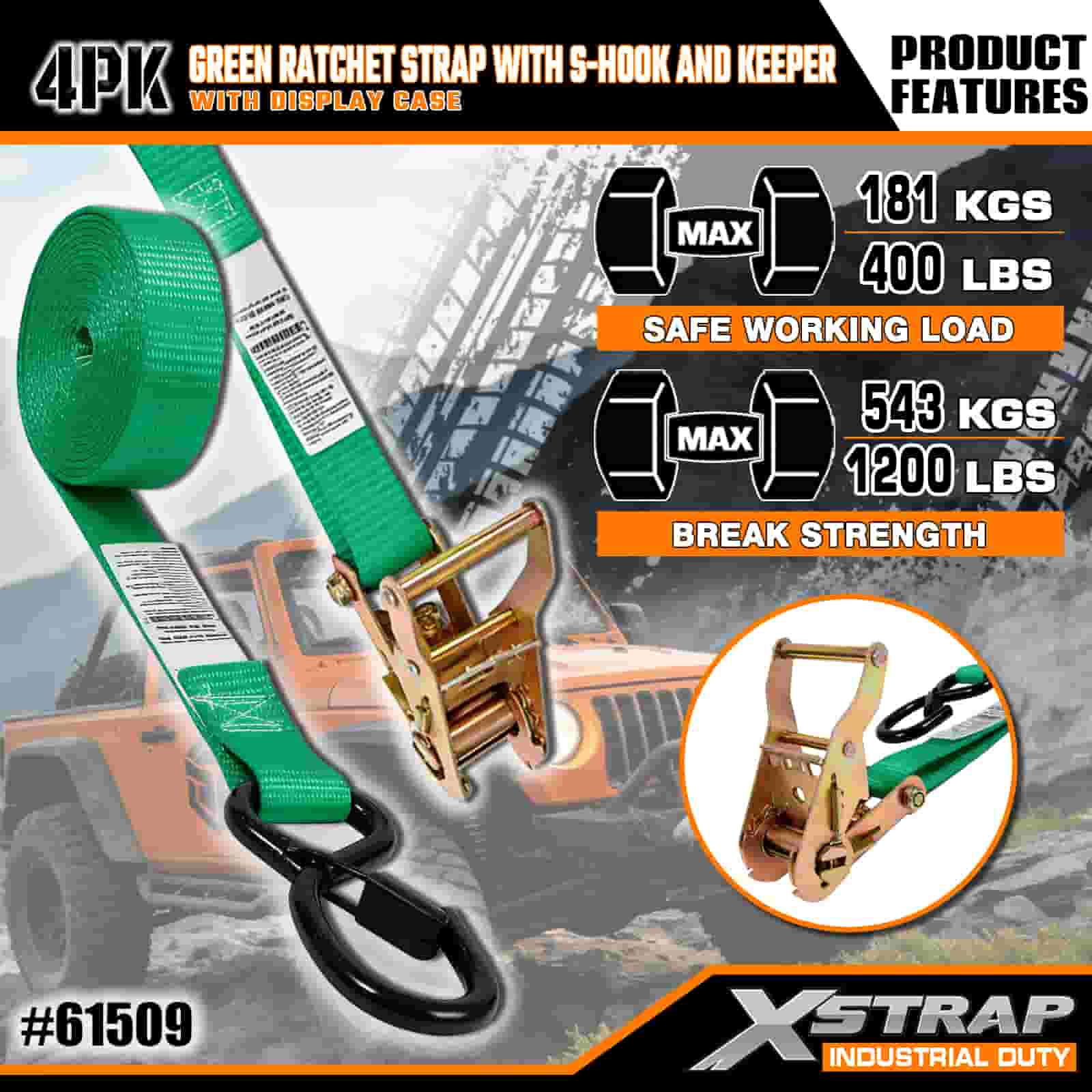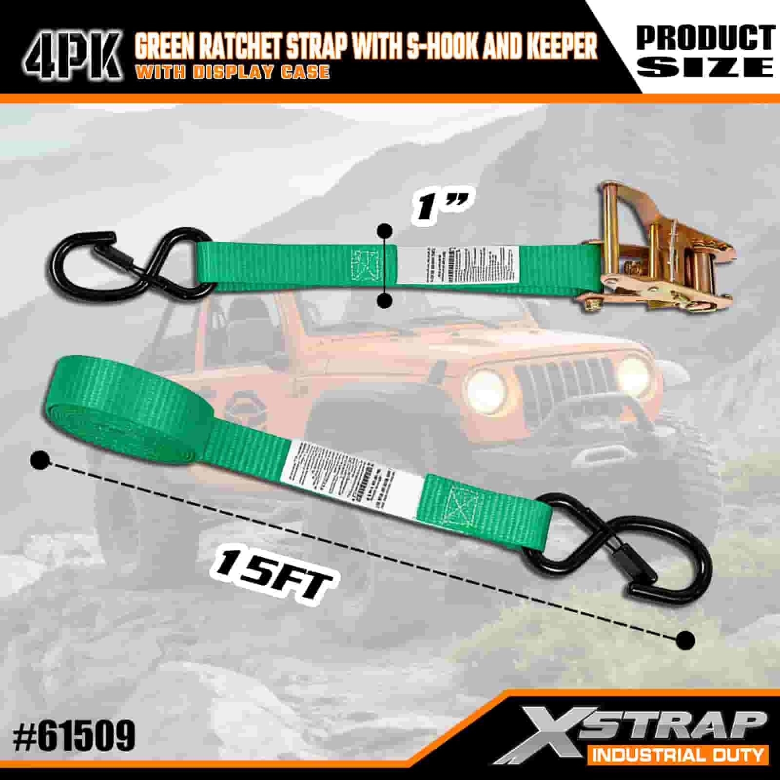Dây đeo Ratchet Xstrap 4 gói có móc chữ S an toàn, Dây đeo buộc xuống bằng polyester 1” x 15’ Dây đeo bánh cóc, Dây đai buộc hàng hóa có sức chứa 400lbs với móc chữ S an toàn dành cho chuyên gia nghiêm túc để bảo đảm xe moóc chở hàng, xe moóc giường phẳng, thuyền trượt tuyết, ô tô nhỏ.