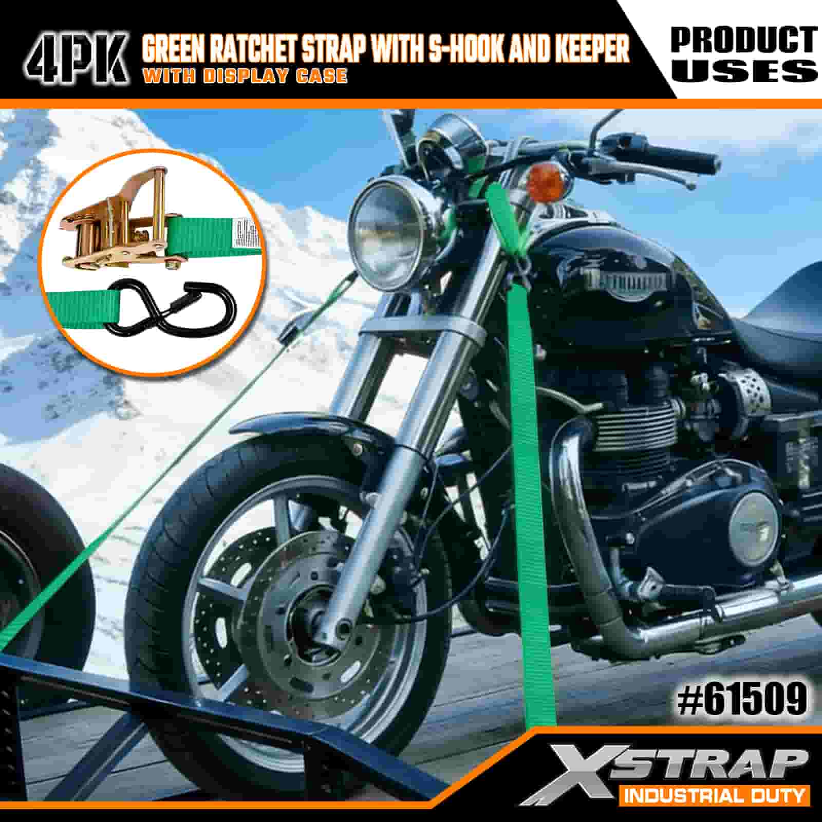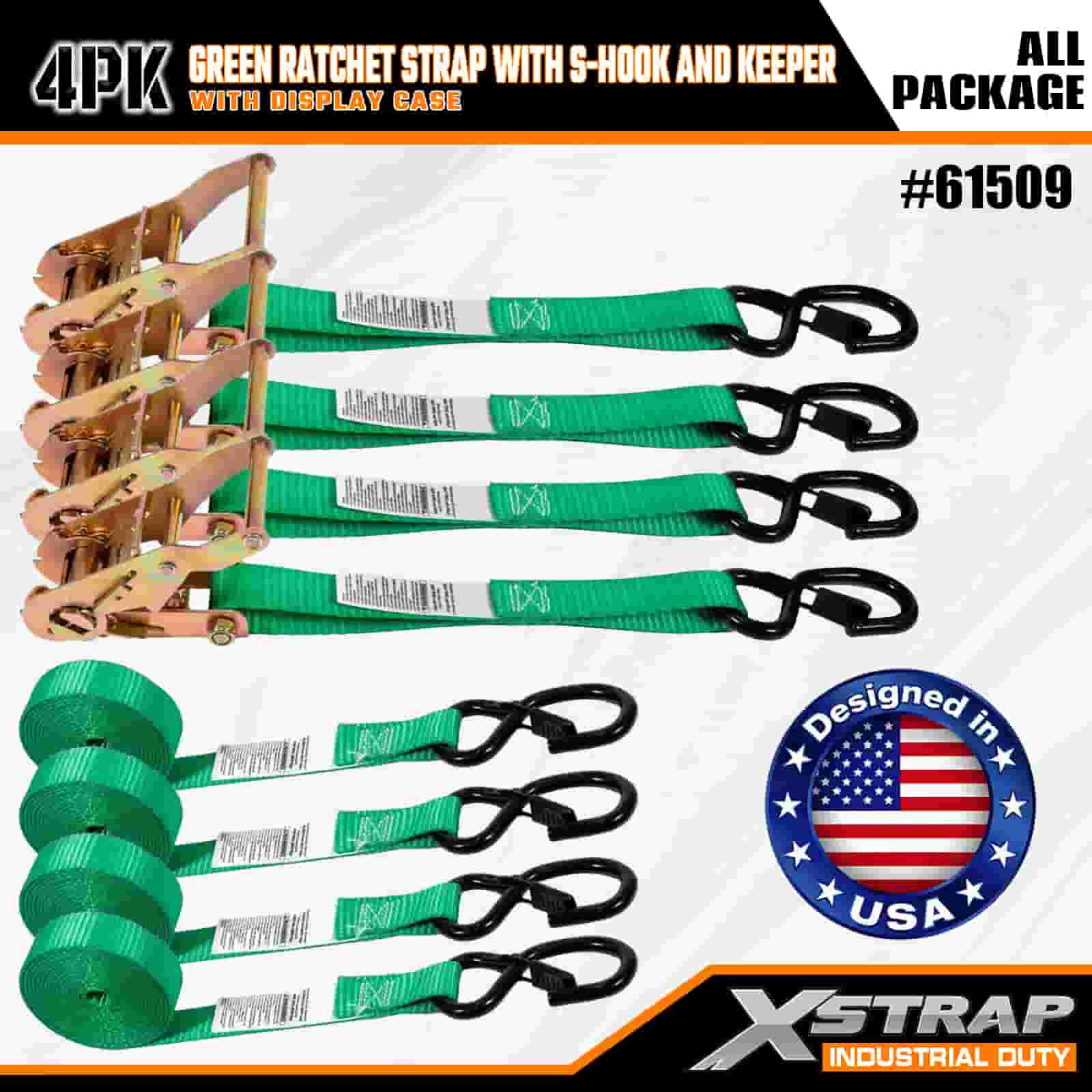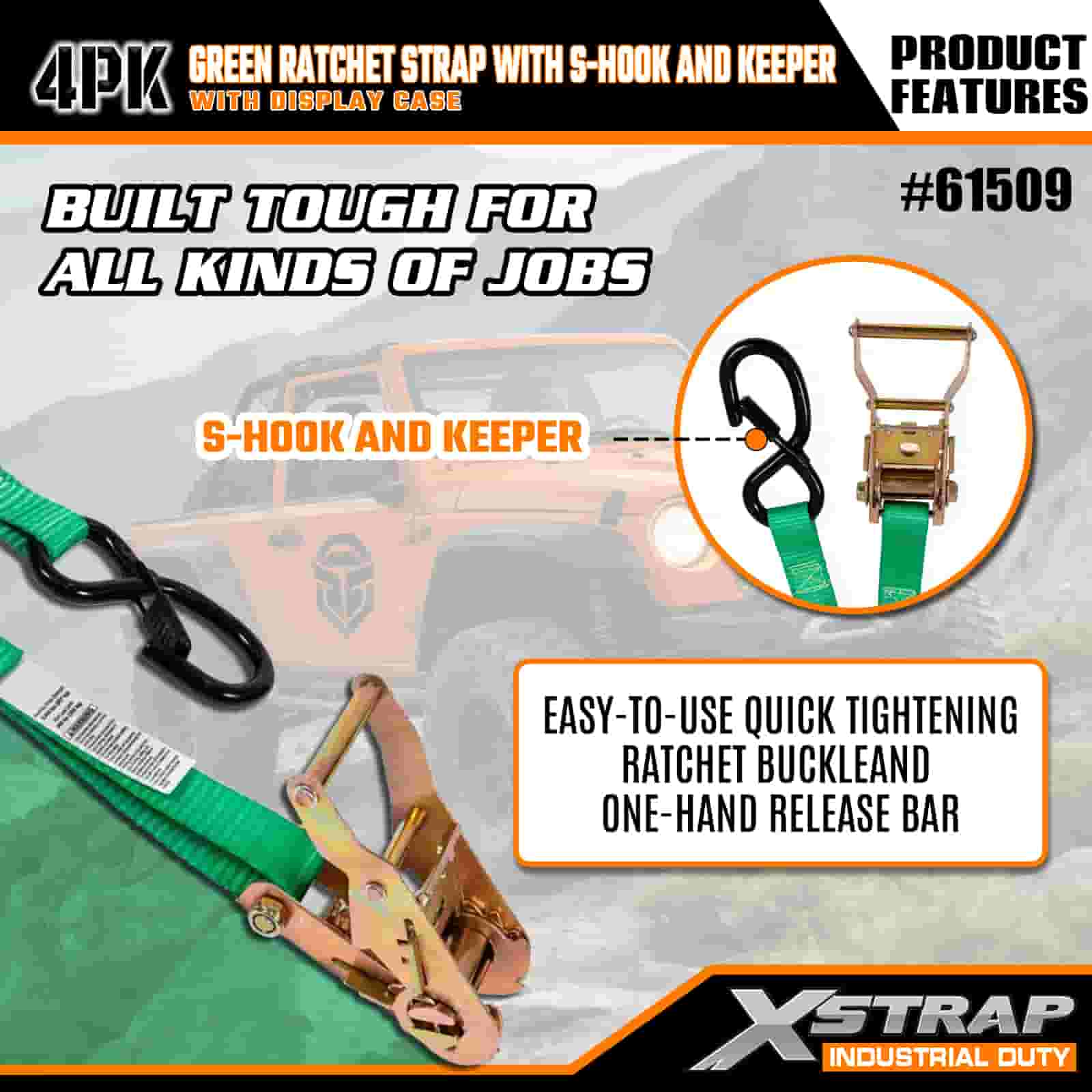 Dây đeo Ratchet Xstrap 4 gói có móc chữ S an toàn, Dây đeo buộc xuống bằng polyester 1” x 15’ Dây đeo bánh cóc, Dây đai buộc hàng hóa có sức chứa 400lbs với móc chữ S an toàn dành cho chuyên gia nghiêm túc để bảo đảm xe moóc chở hàng, xe moóc giường phẳng, thuyền trượt tuyết, ô tô nhỏ.