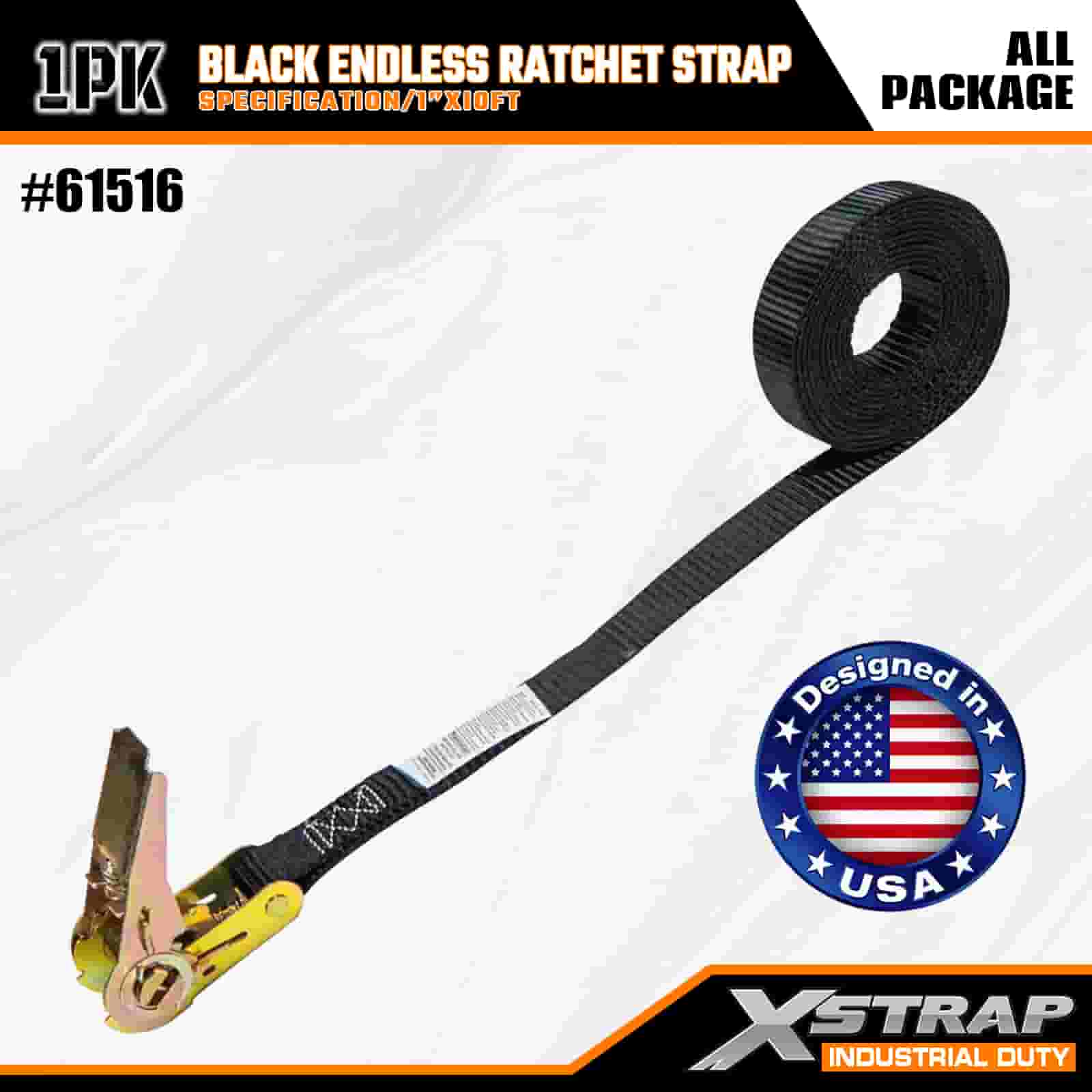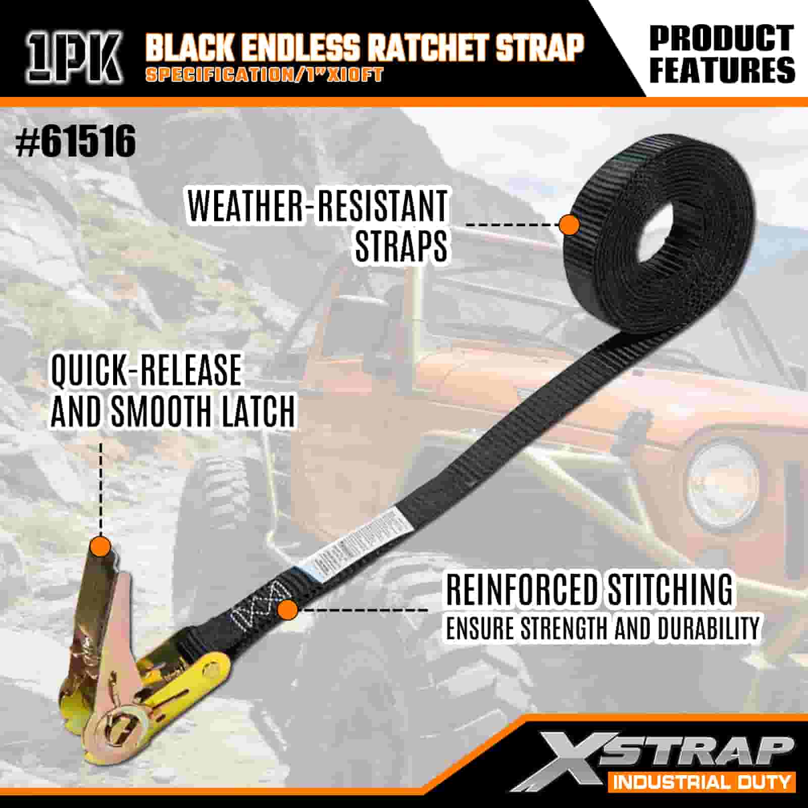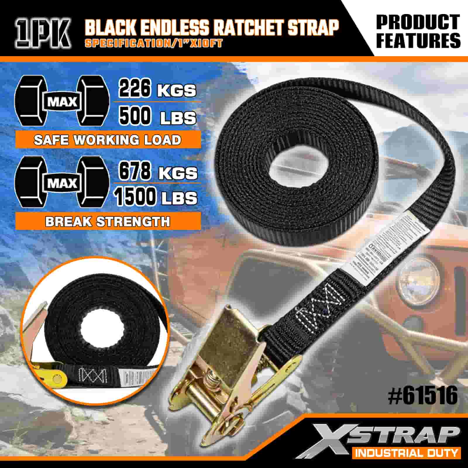 Dây đeo Ratchet vô tận Xstrap màu đen, Dây đeo buộc xuống bằng polyester 1” x 10’ Dây đeo Ratchet kéo, Dây đai buộc hàng hóa có sức chứa 500lbs dành cho chuyên gia nghiêm túc để đảm bảo an toàn cho xe moóc chở hàng, xe kéo giường phẳng, thuyền trượt tuyết, ô tô nhỏ.