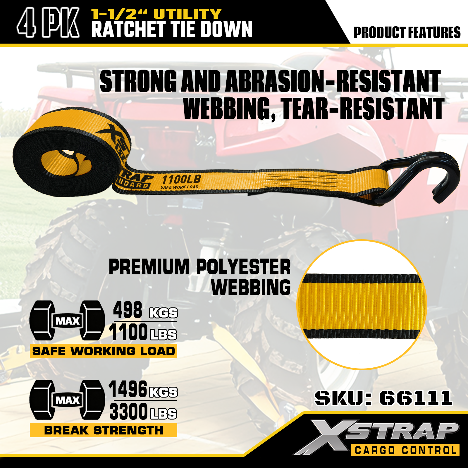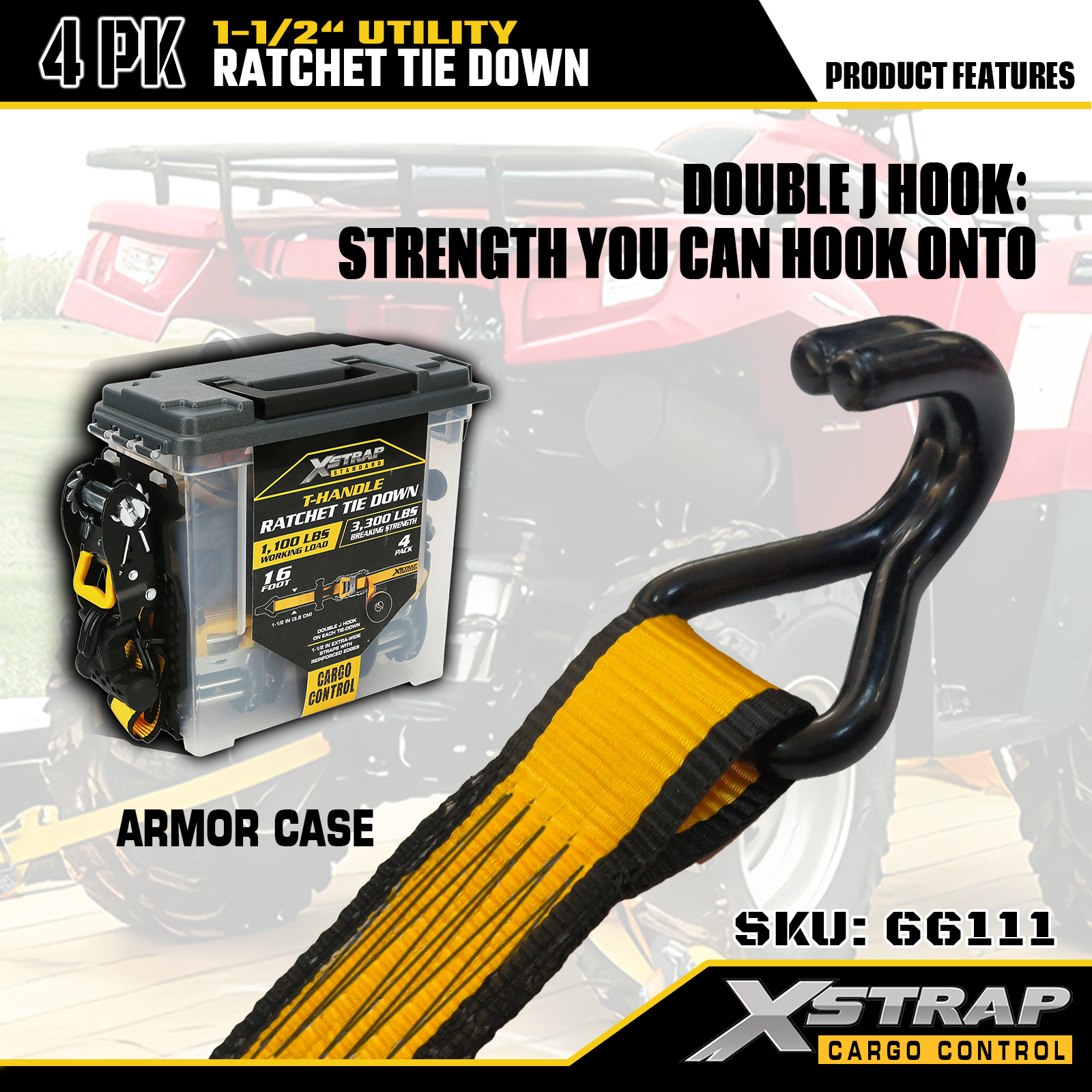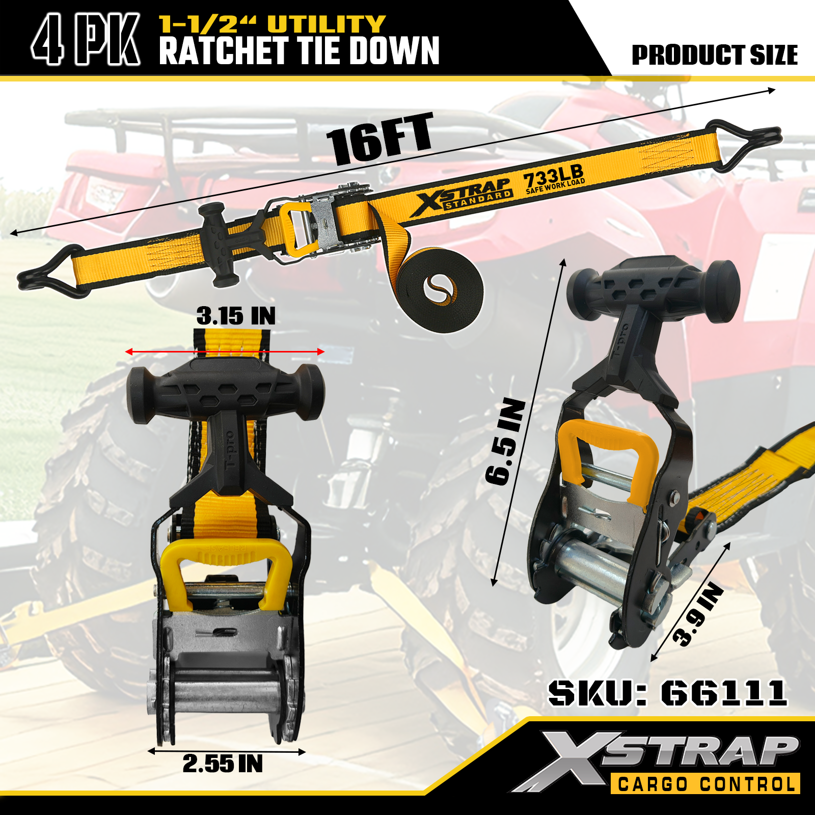 Xstrap T-Handle Ratchet Tie Down có kích thước 1,5 inch x 16ft, tải trọng làm việc an toàn là 1.100 lbs và độ bền đứt là 3.300 lbs.