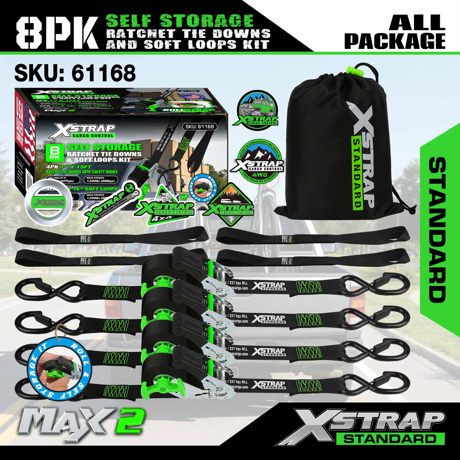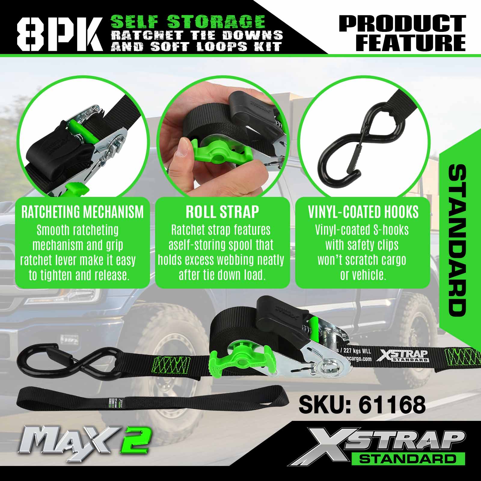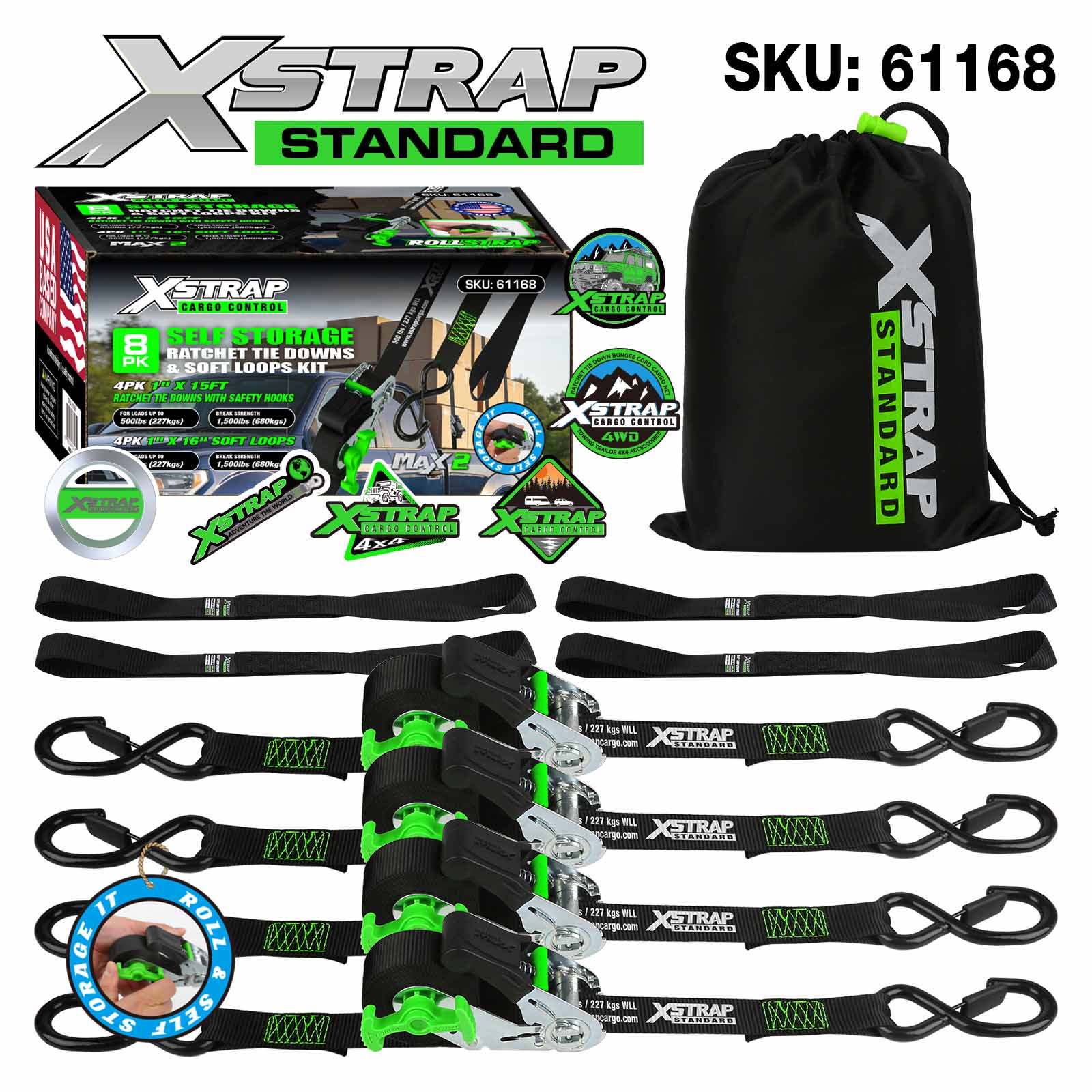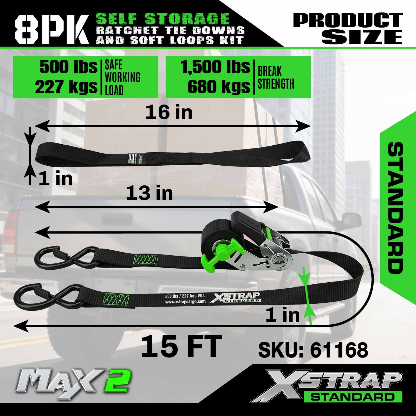 Xstrap 61168 1inch 15ft Tự lưu trữ Ratchet Tie Down 500LB SWL