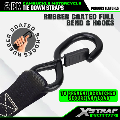 Đây là dây khóa Xstrap 2pk Cam có móc an toàn. Tải trọng làm việc an toàn là 733lb, độ bền đứt là 2200lb. Chúng thường được sử dụng để cố định xe máy, thuyền kayak, v.v.