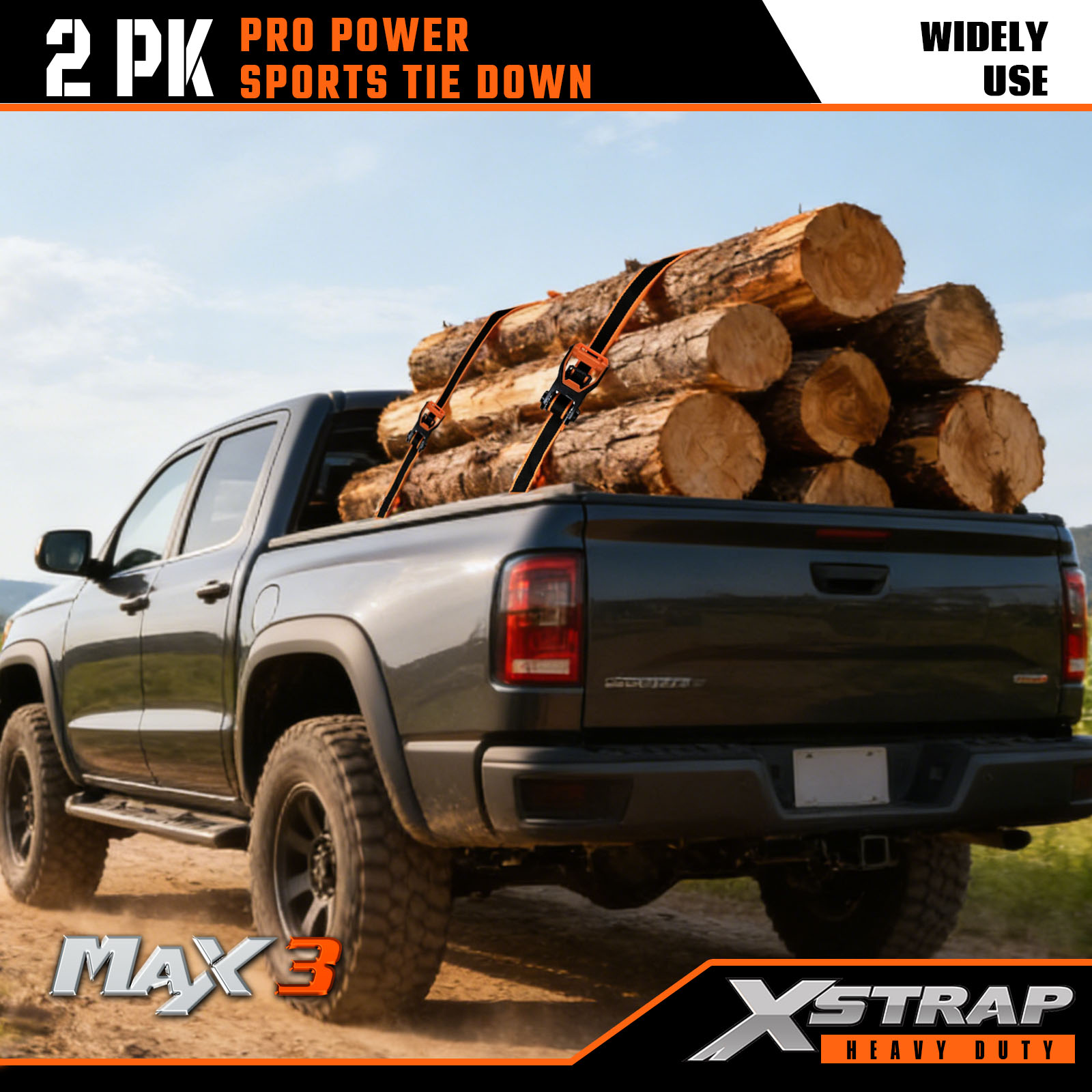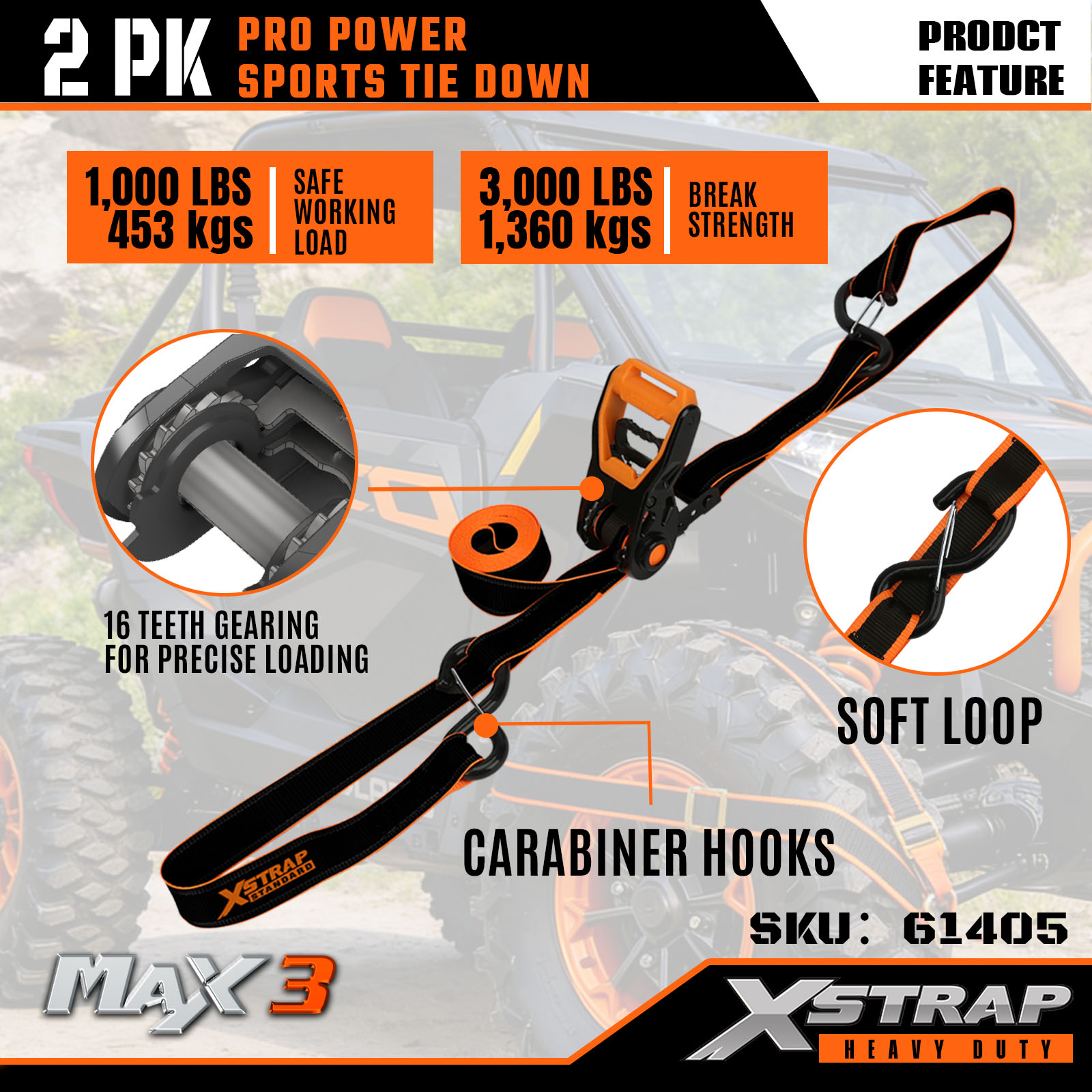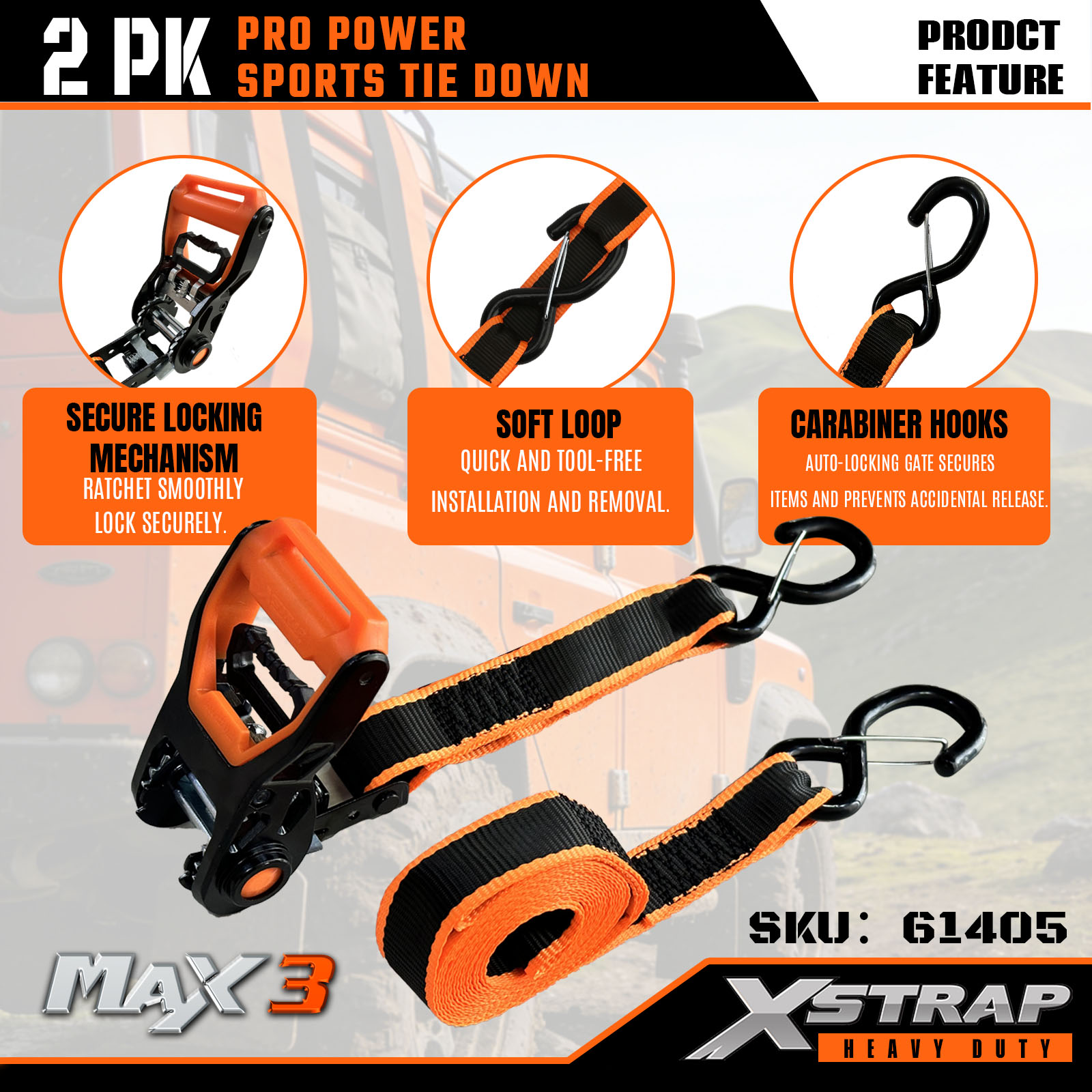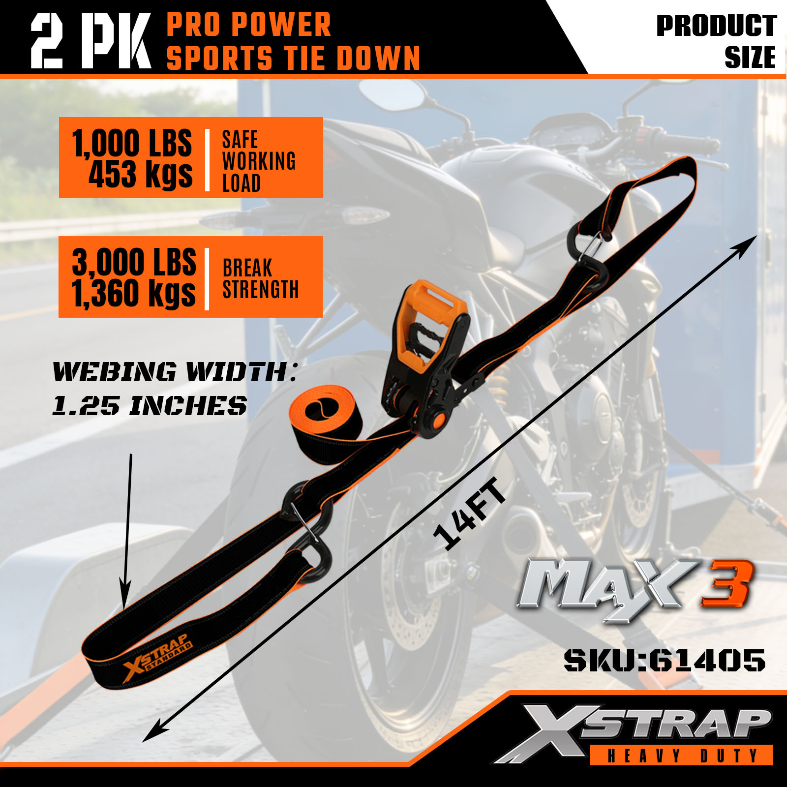 Xstrap 2 Pack Dây buộc thể thao mạnh mẽ PRO, Dây buộc xuống bằng polyester 1-1/4" x 14' Dây đeo bánh cóc kéo, Dây buộc chắc chắn hàng hóa có sức chứa 1000 lbs với Móc carabiner dành cho Xe tải, SUV, Giá nóc xe mô tô.