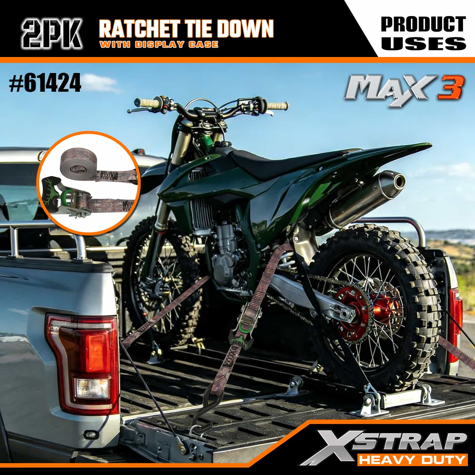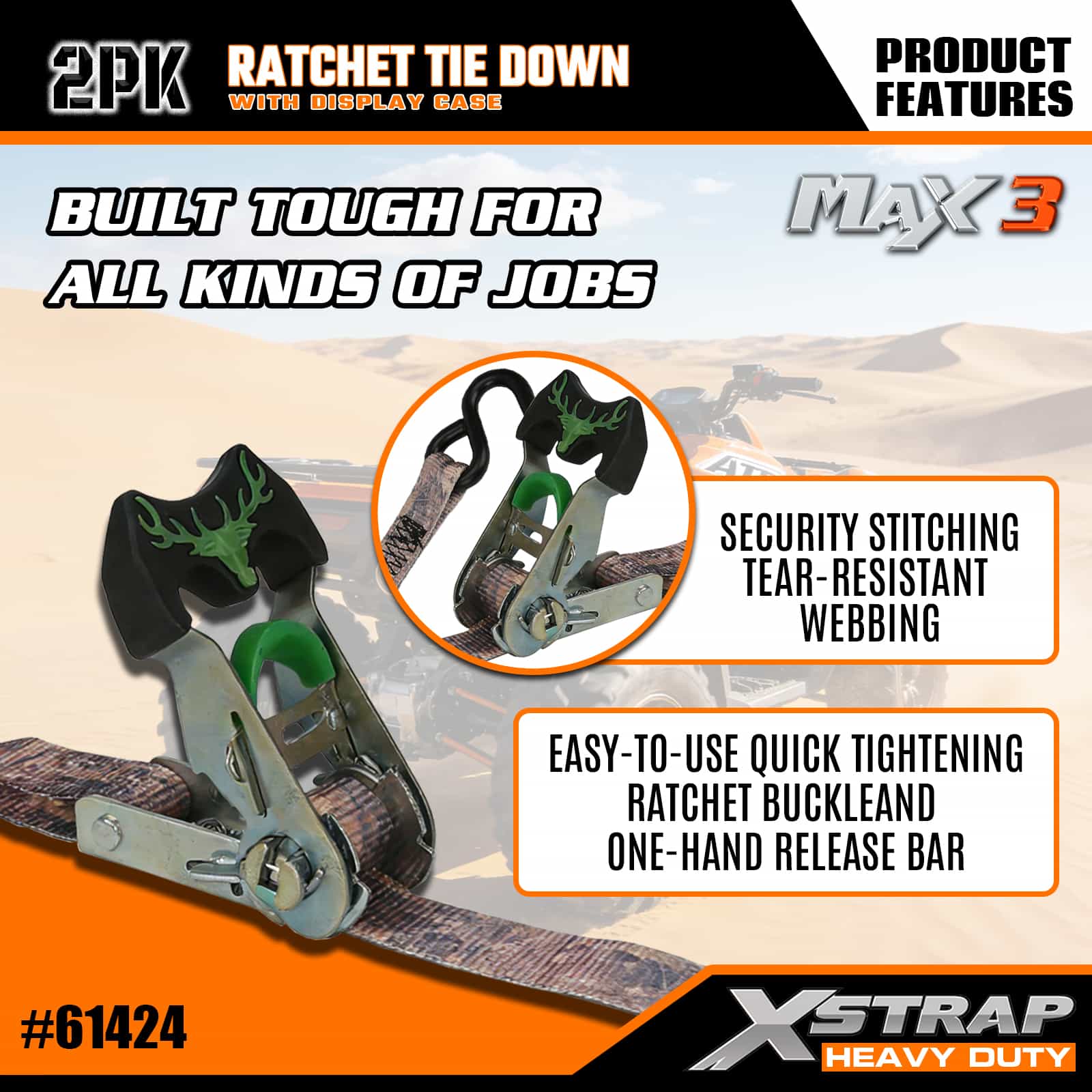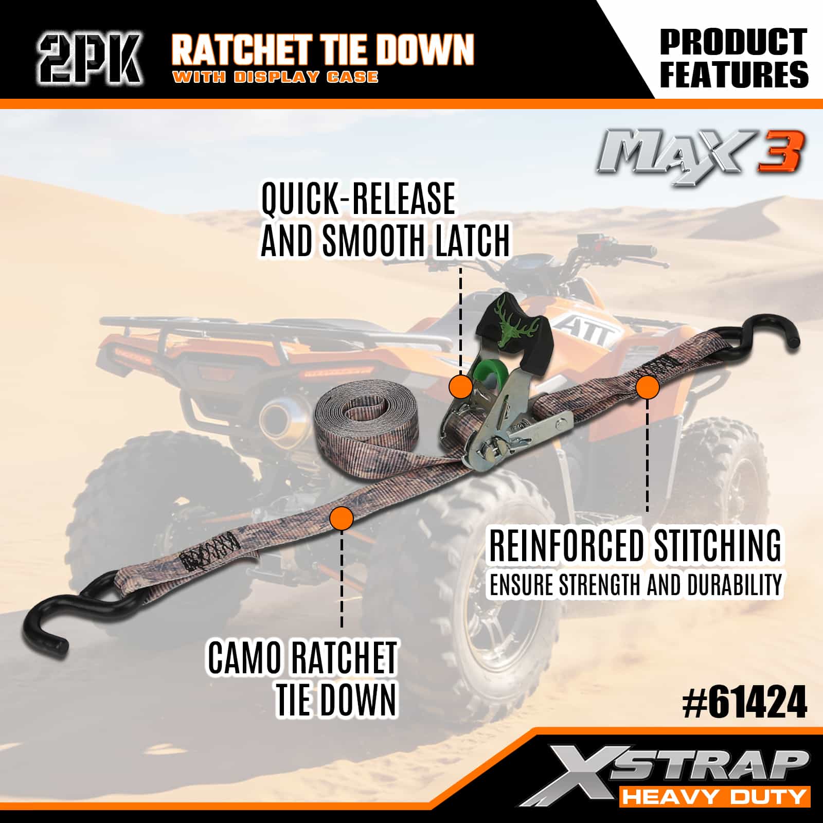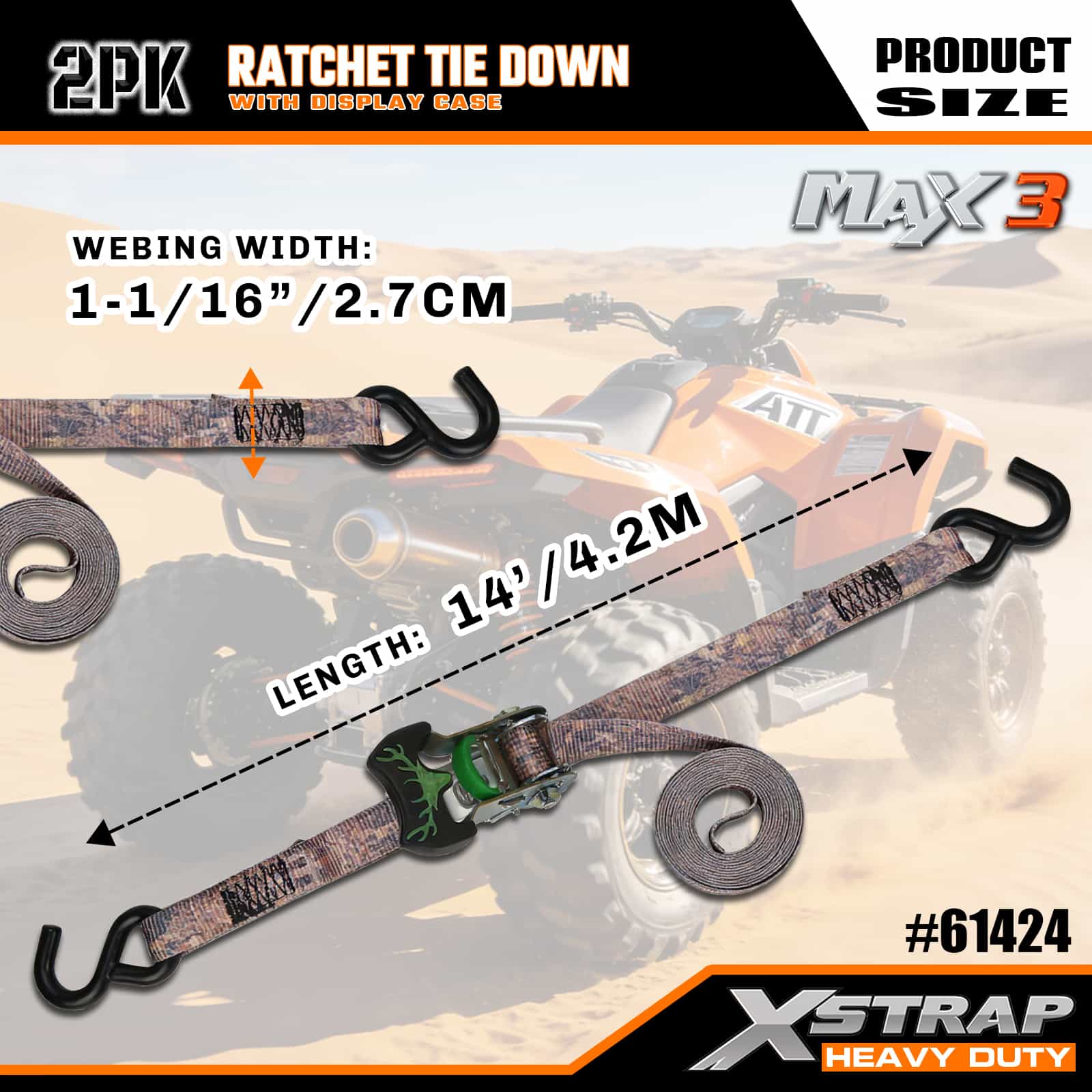 Xstrap 2 Pack Camo Ratchet Tie Down, 1-1/16 ” x 14' Dây đeo bằng vải polyester buộc xuống Dây kéo Ratchet, Dây đai buộc hàng hóa có sức chứa 1000 lbs với Móc chữ S dành cho Xe bán tải, SUV, Xe máy có giá để trên nóc, Thuyền đánh cá hạng nhẹ, Jet Ski, Xe trượt tuyết, Máy kéo cỏ.