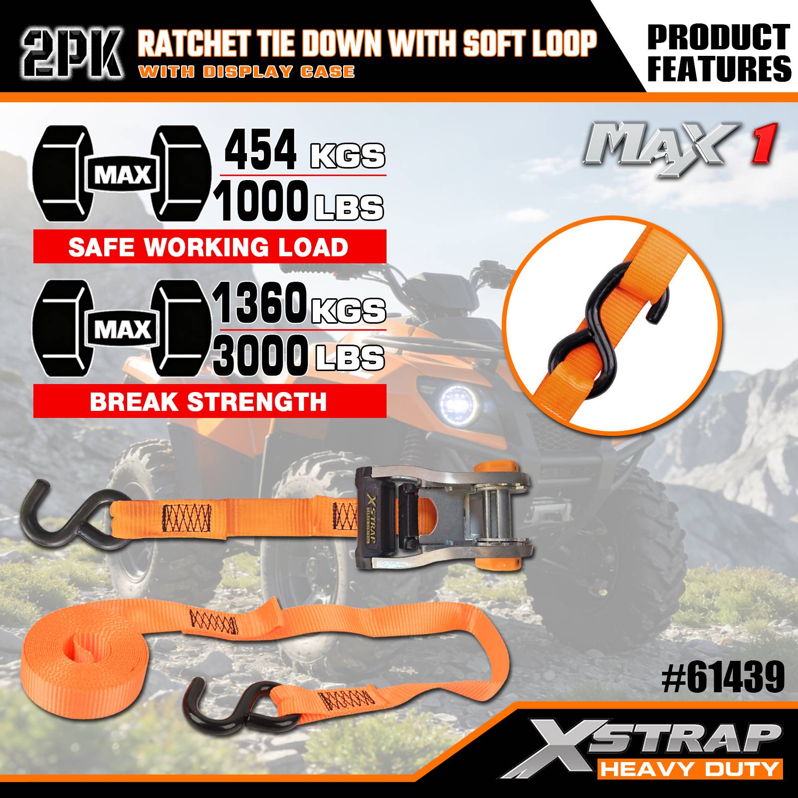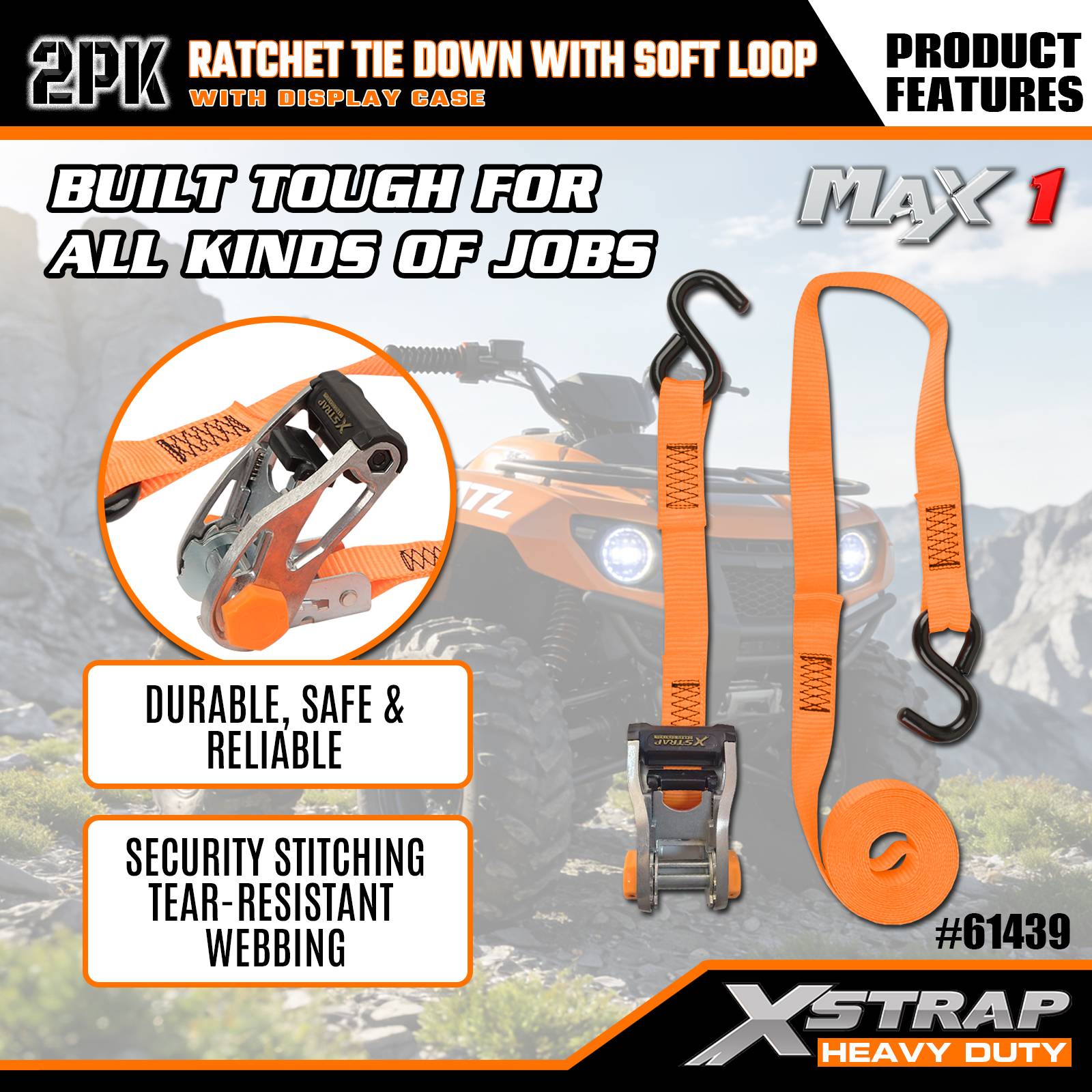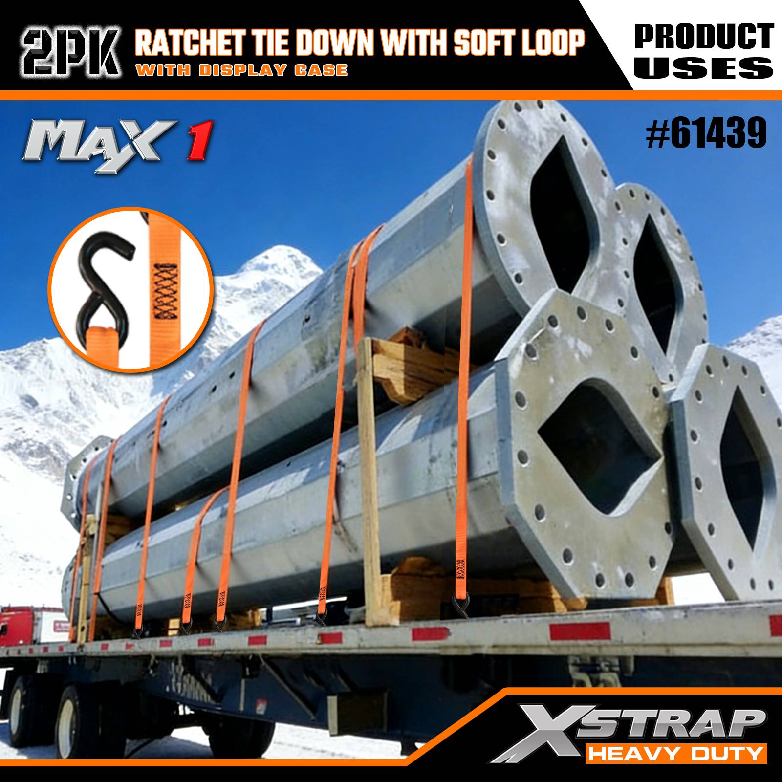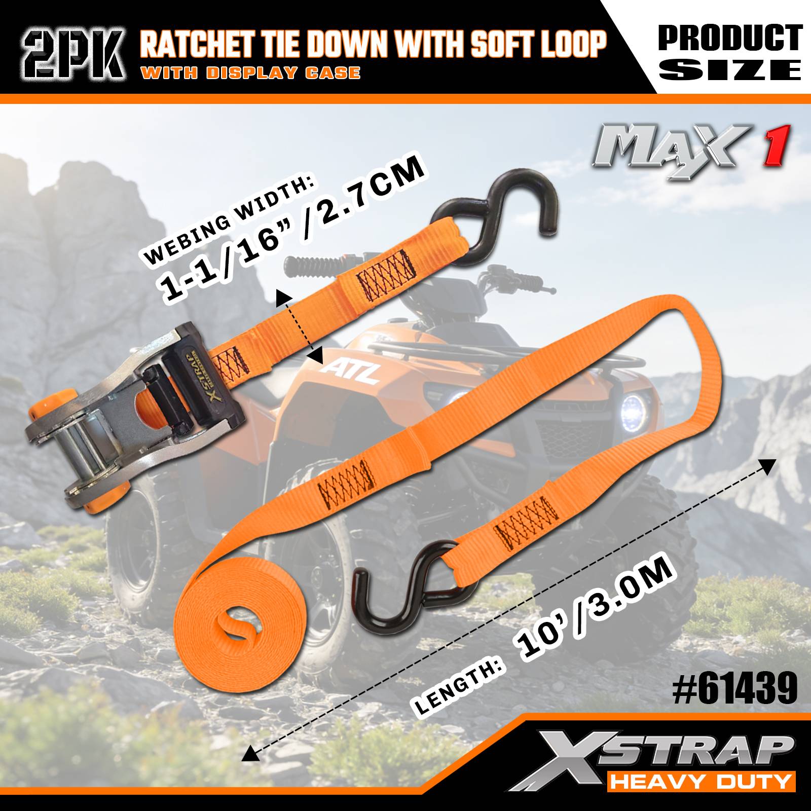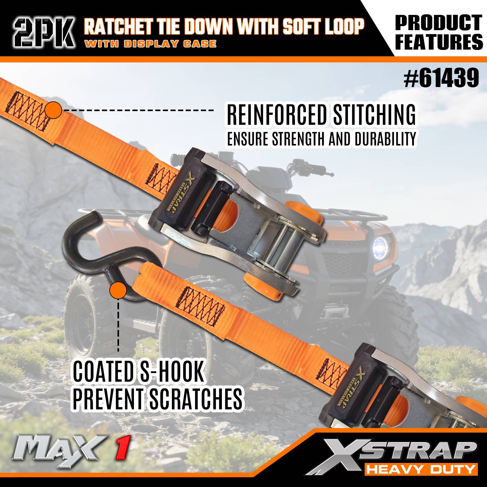 Xstrap 2 Gói Ratchet Buộc xuống có vòng mềm, 1-1/16” x 10' Dây đeo bằng vải polyester buộc xuống Dây kéo Ratchet, Dây buộc chắc chắn hàng hóa có công suất 1000 lbs với Móc chữ S dành cho Xe tải, SUV, Giá nóc xe mô tô.