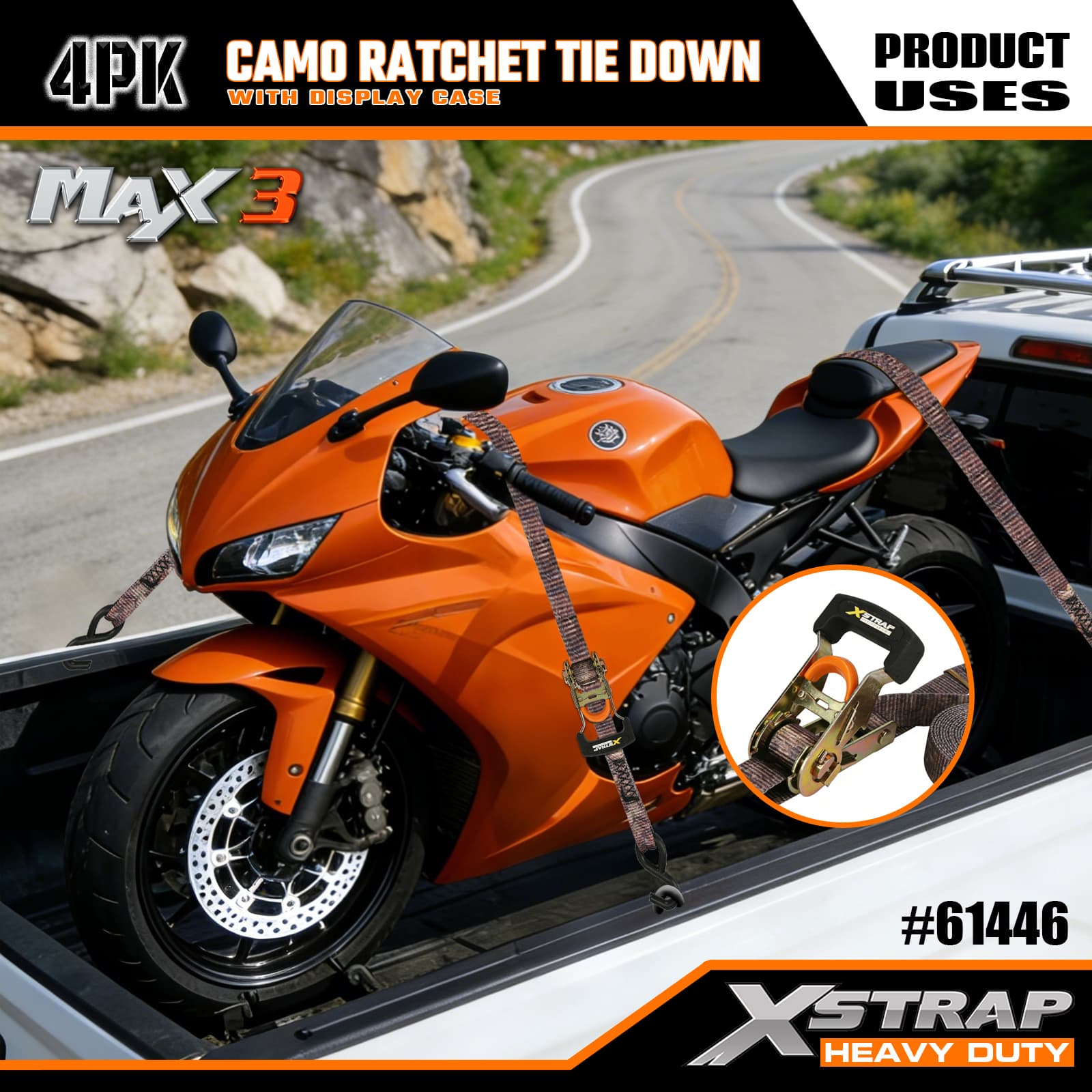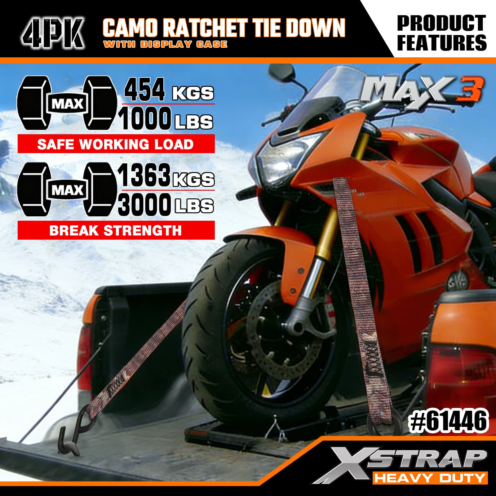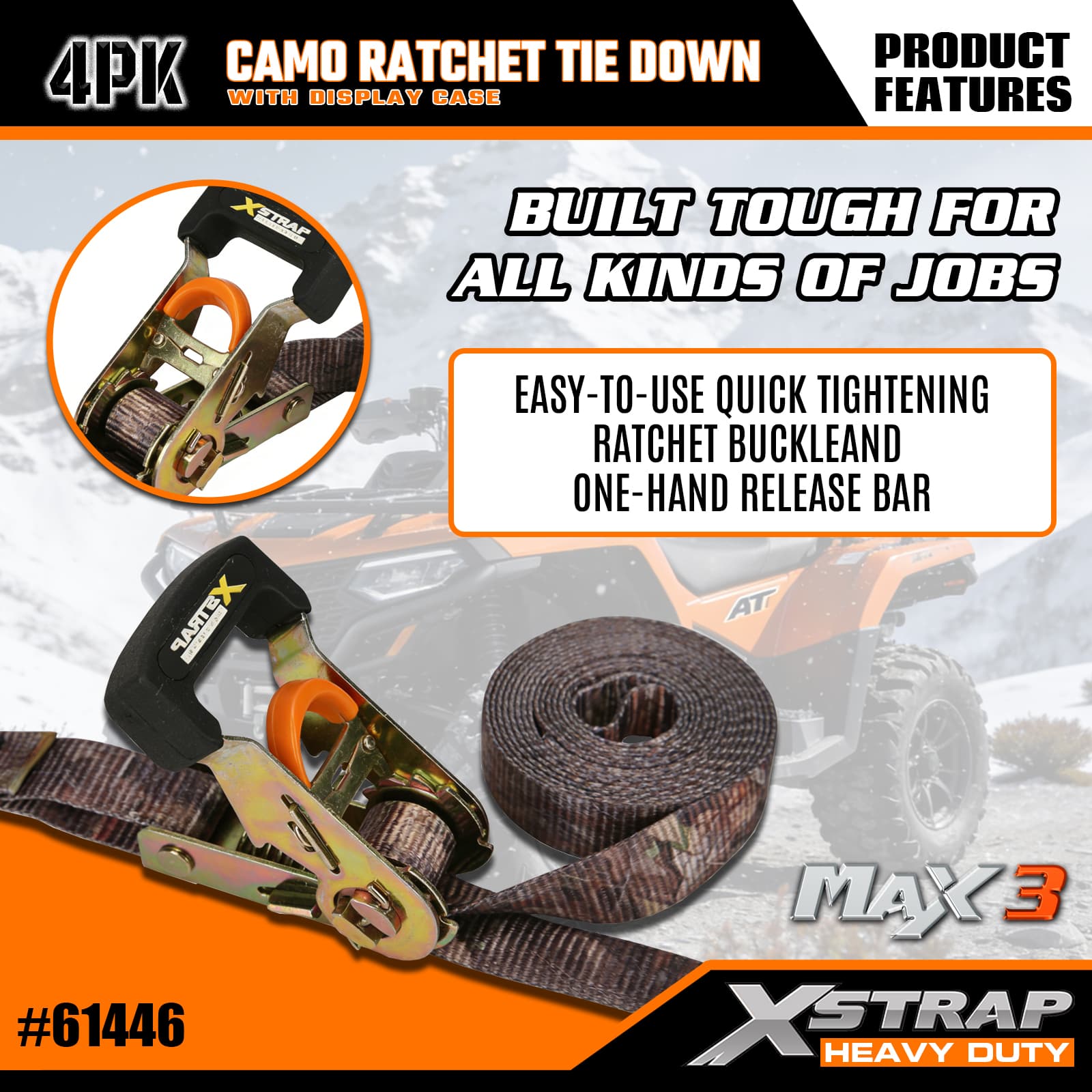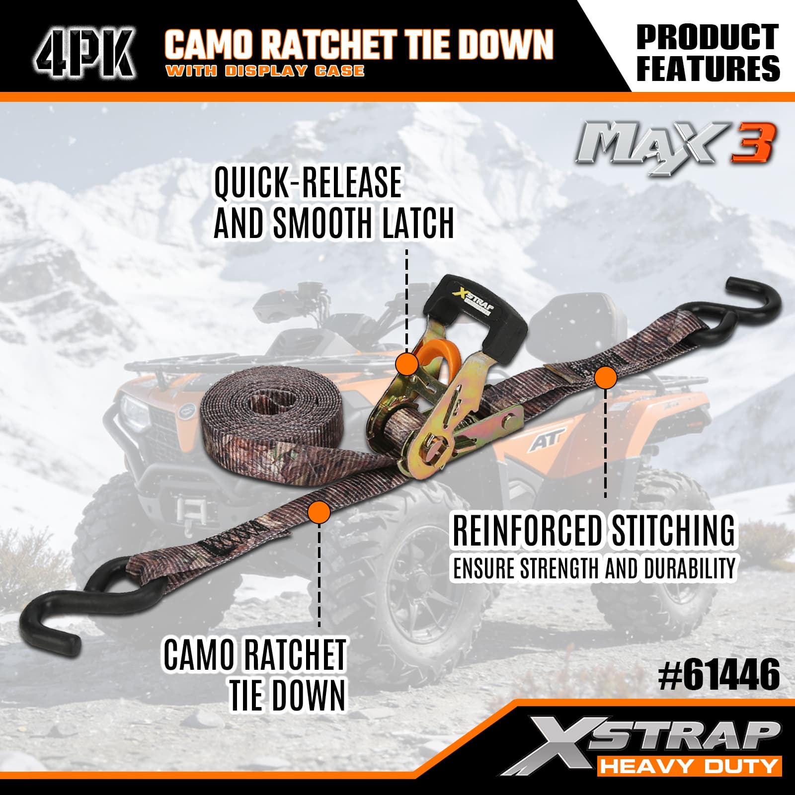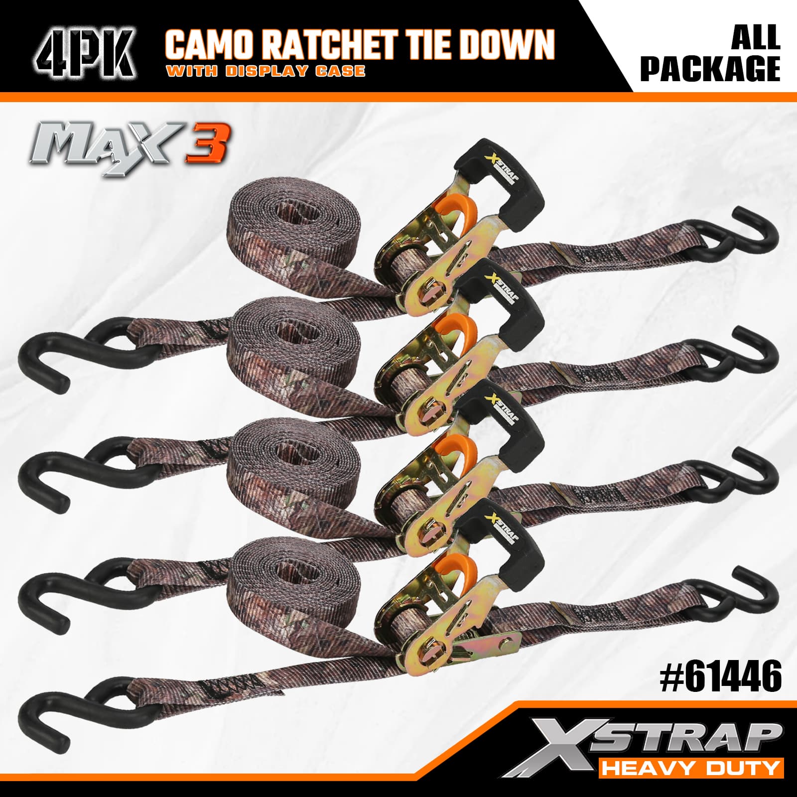 Xstrap 4 gói Camo Ratchet Cắt xuống, 1-1/16 ” x 12' Dây đeo bằng vải polyester buộc xuống Dây kéo bánh cóc, Dây đai buộc hàng hóa có sức chứa 1000lbs với Móc chữ S cho Xe bán tải, SUV, Xe máy có giá để trên nóc, Thuyền đánh cá hạng nhẹ, Jet Ski, Xe trượt tuyết, Máy kéo cỏ.