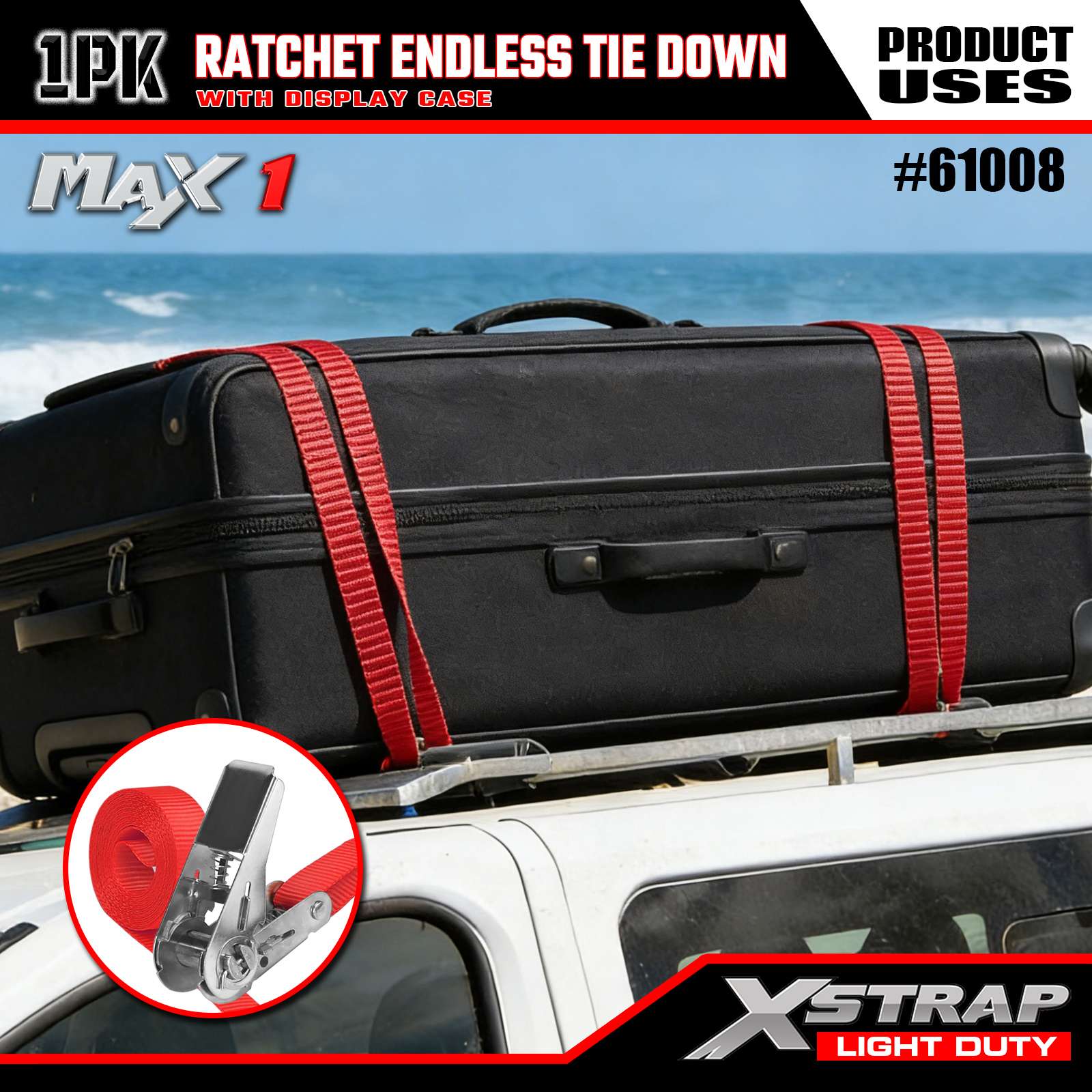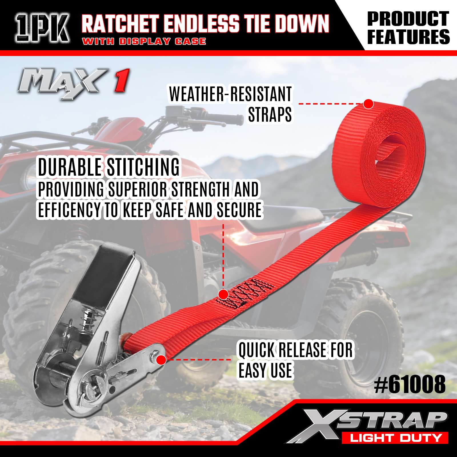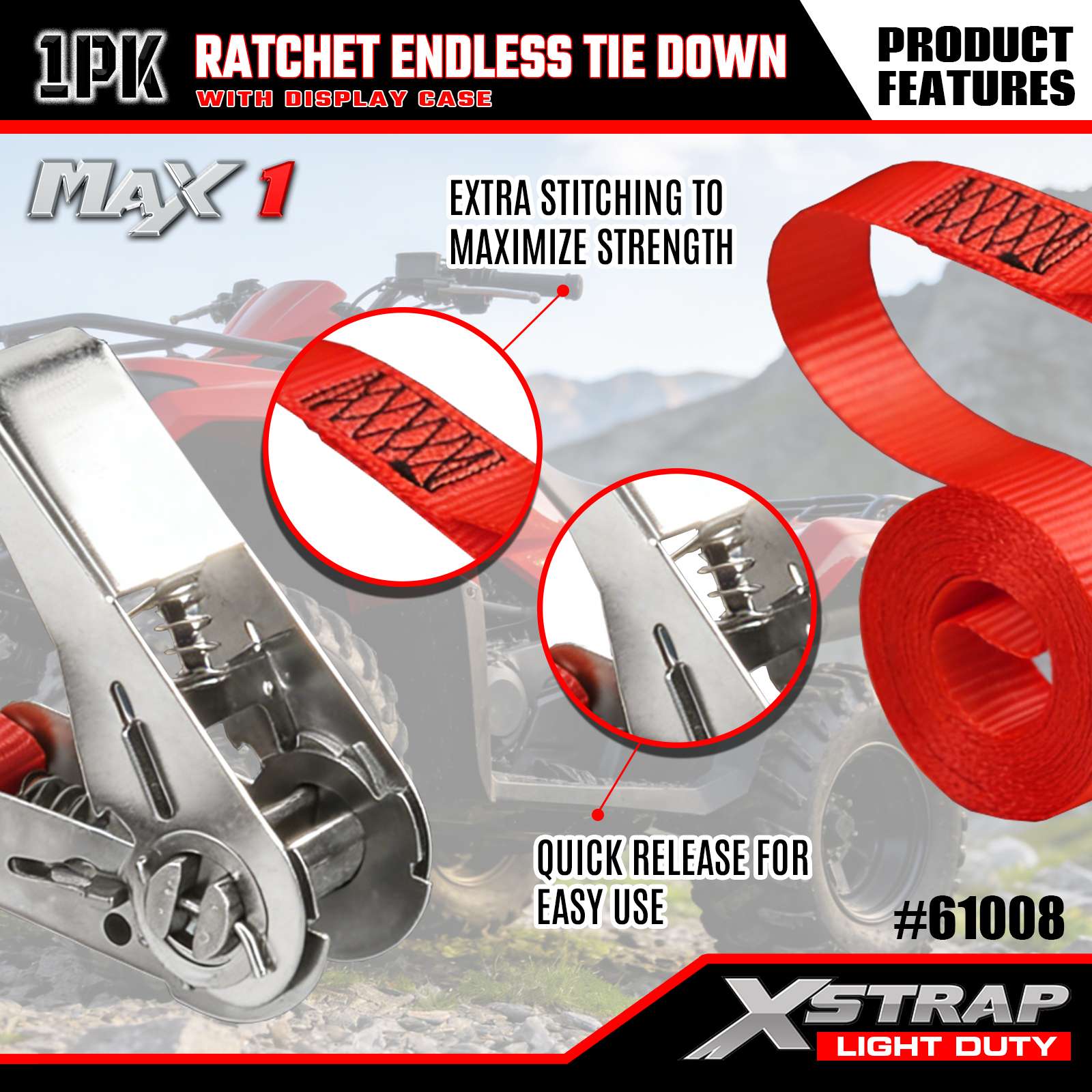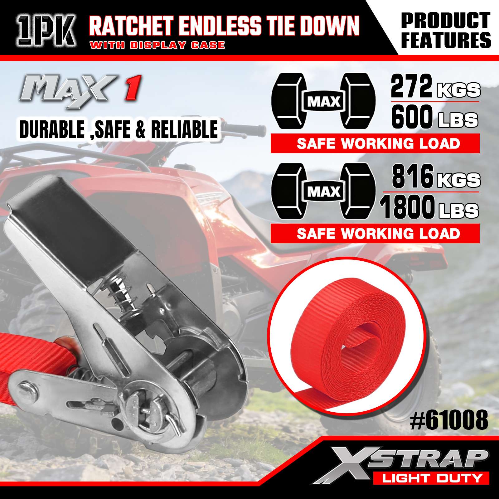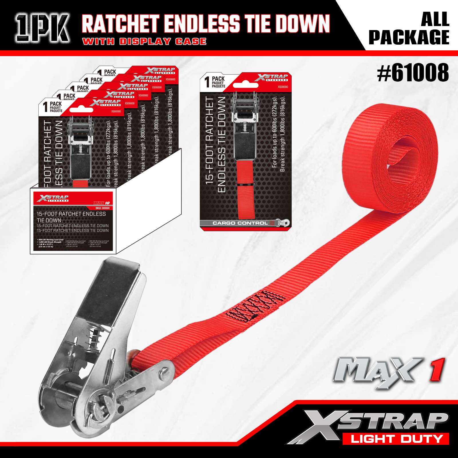 Xstrap 1 Gói Dây buộc vô tận Ratchet, 1"x15' - Nắp tải 600 Lbs- 1800 Lbs Độ bền đứt-Dây chở hàng cho thiết bị di chuyển, thiết bị cắt cỏ, xe máy, ngụy trang