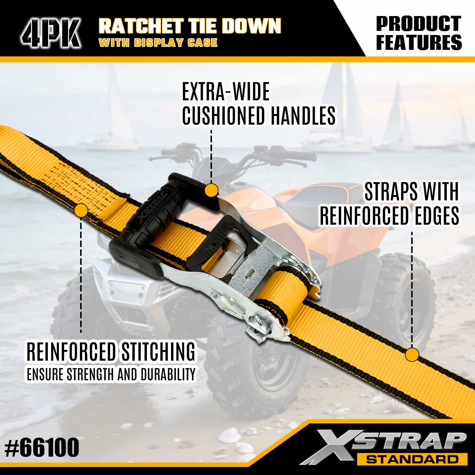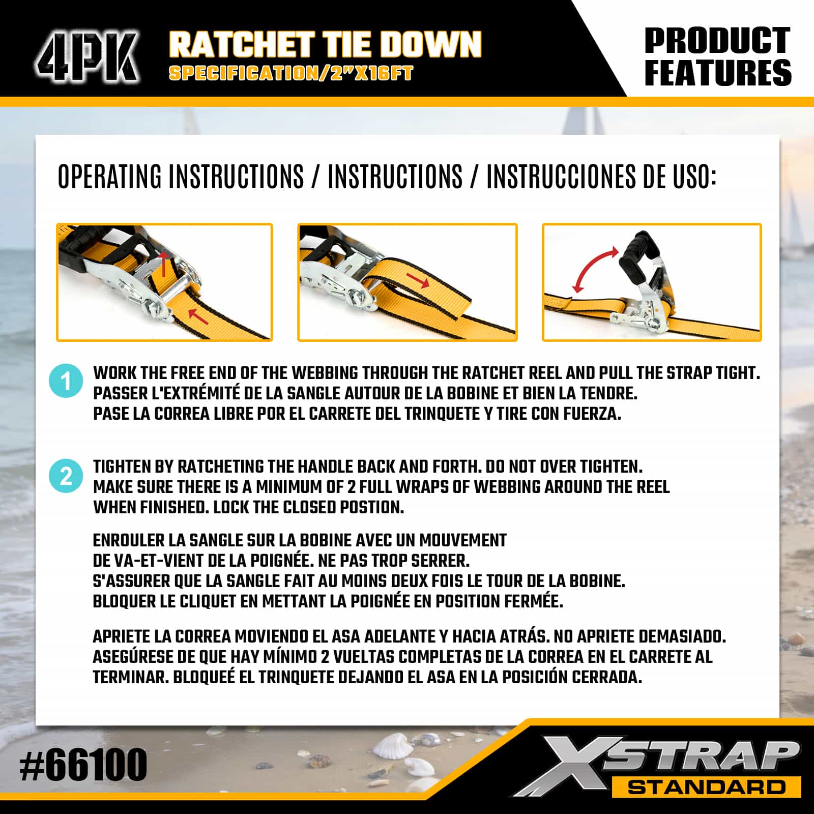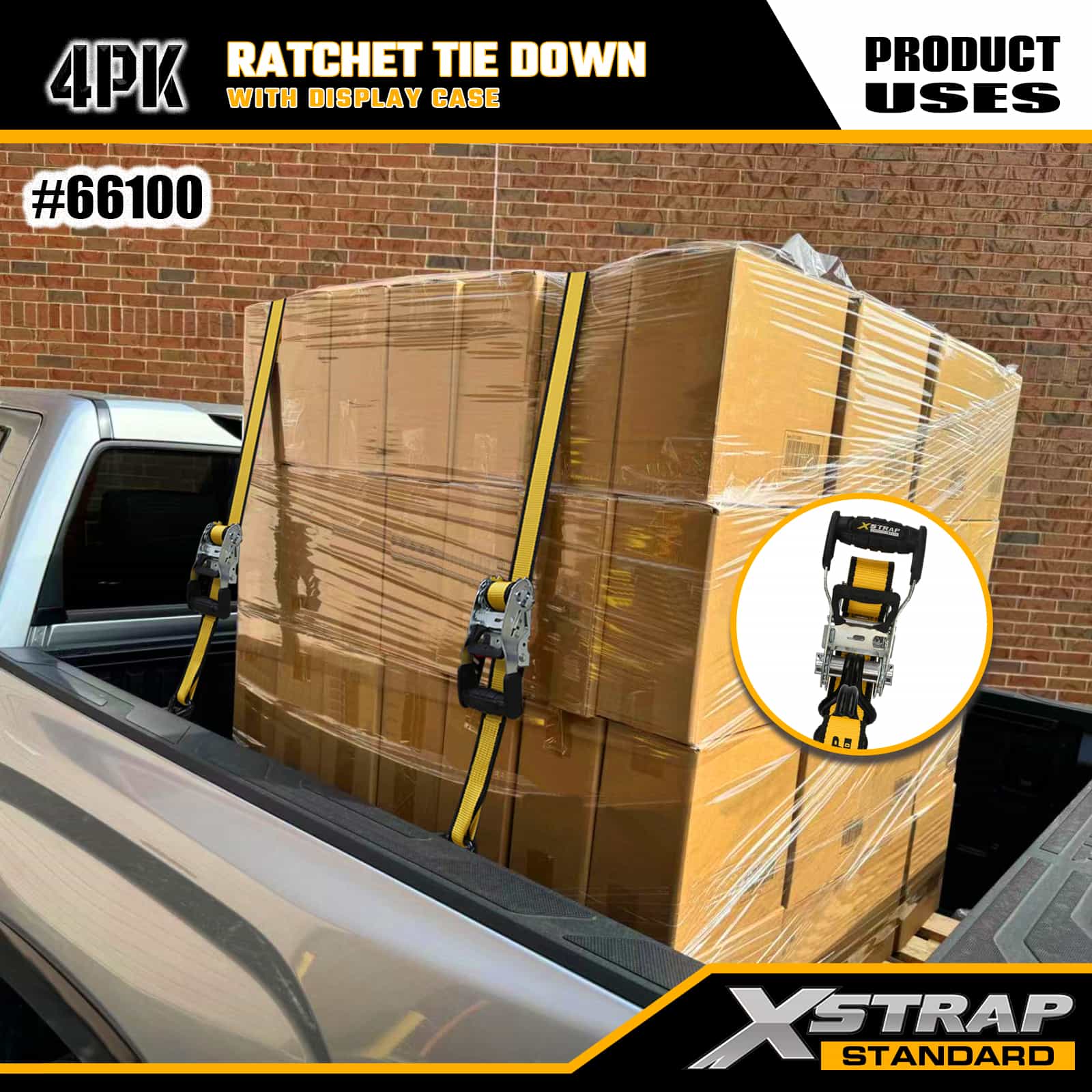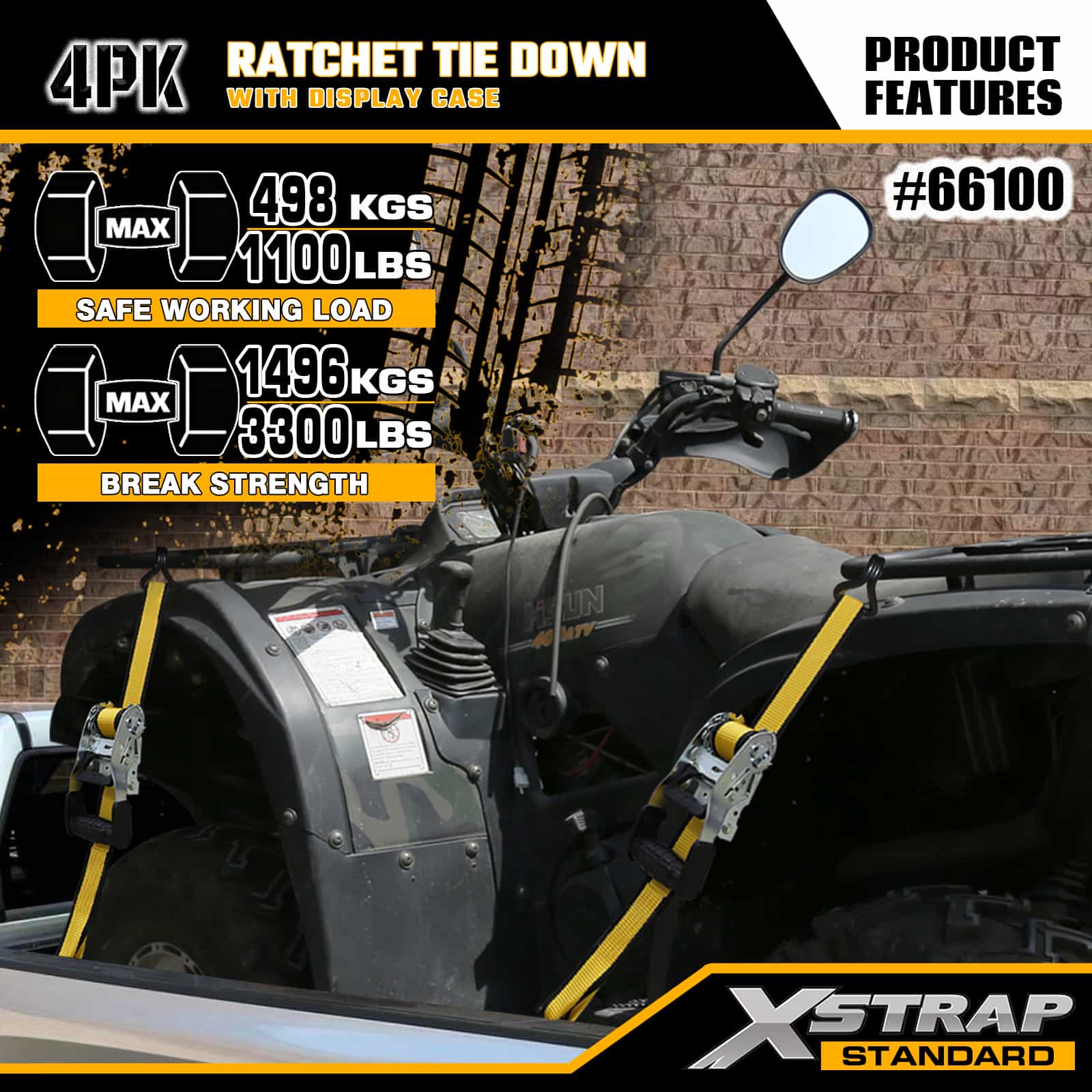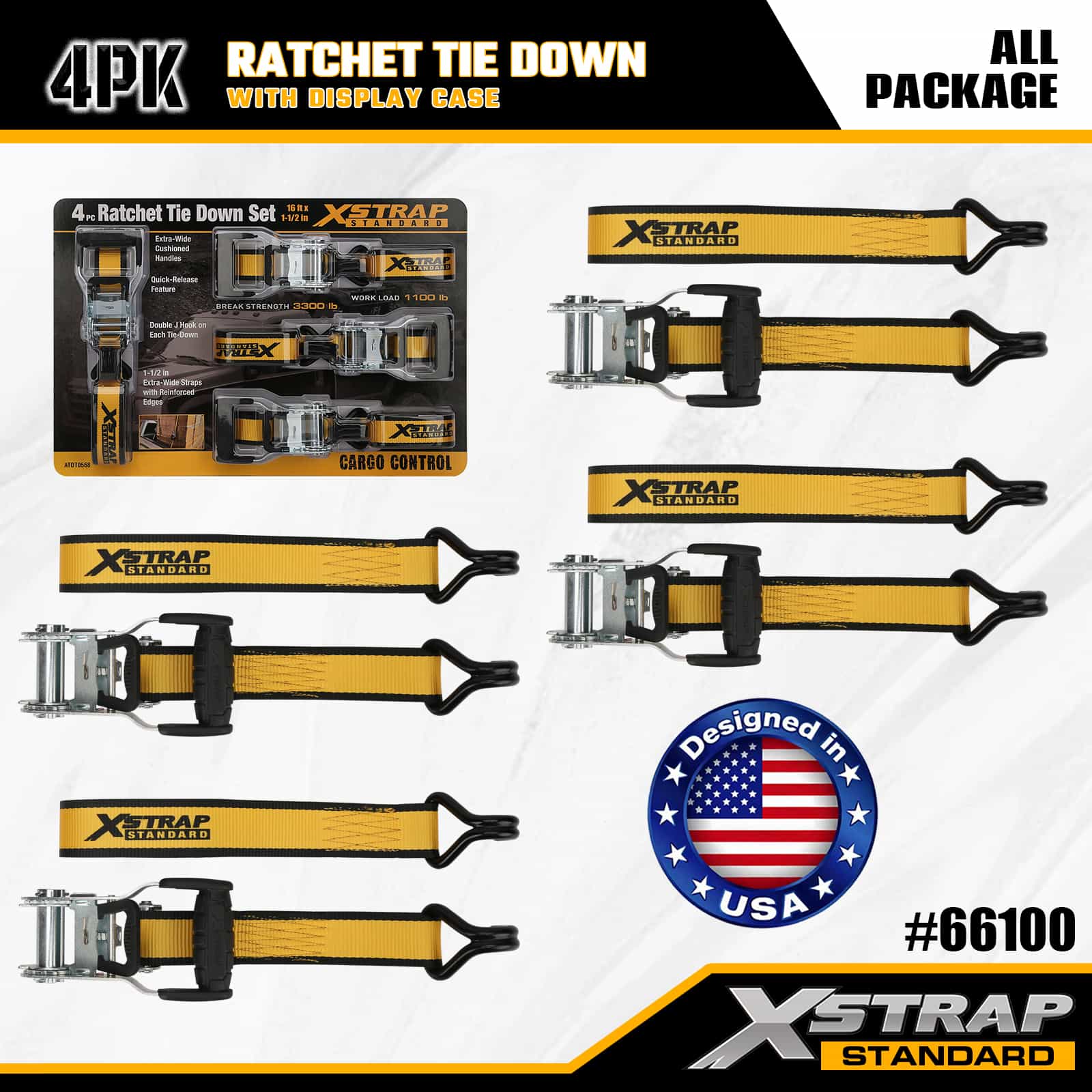 Xstrap 4 Gói Ratchet Tie Down với Double J Hook, 1-1/2” x 16’ Dây đeo buộc xuống bằng polyester, Dây kéo Ratchet, Dây buộc chắc chắn hàng hóa có sức chứa 1100lbs với Móc đôi J cho Xe bán tải, SUV, Xe máy có giá trên nóc, Thuyền đánh cá hạng nhẹ, Jet Ski, Xe trượt tuyết, Máy kéo cỏ.