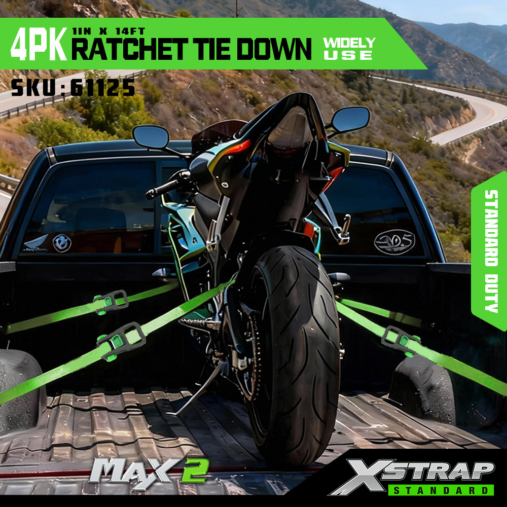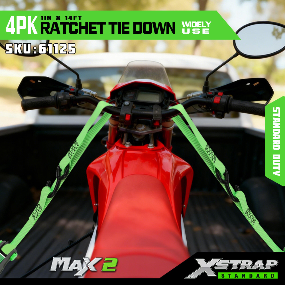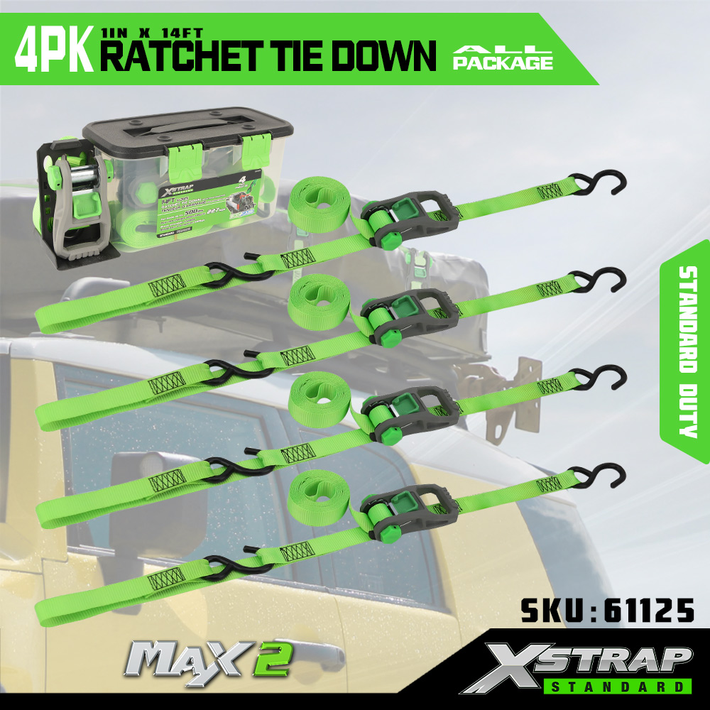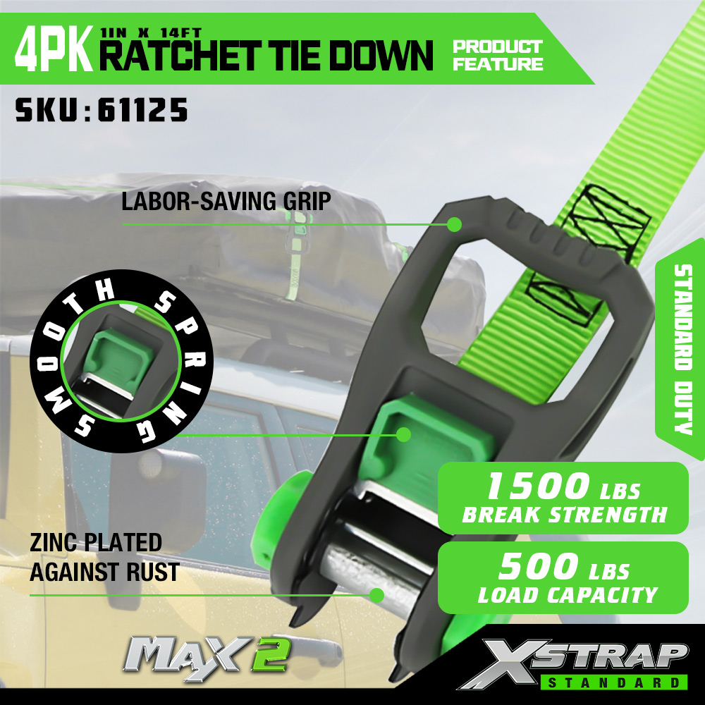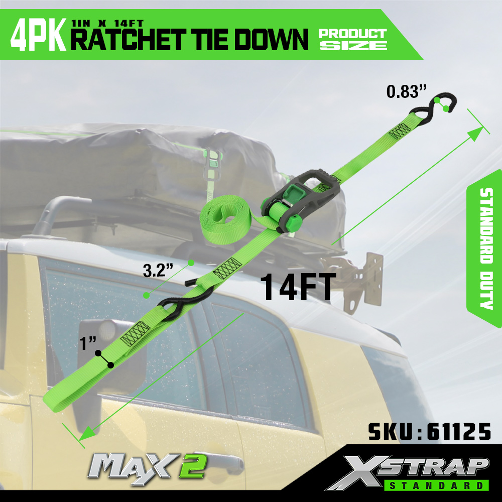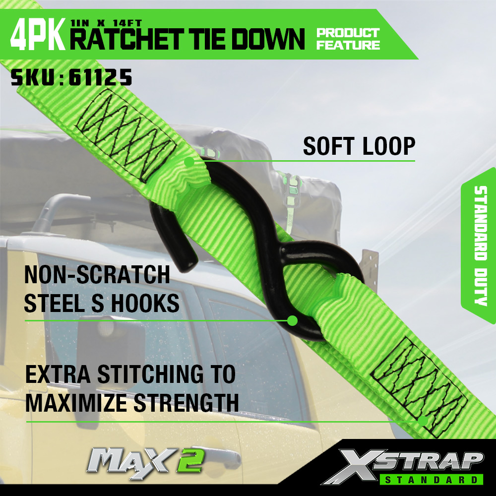 Xstrap 4 Gói Ratchet Tie Down, 1” x 14' Dây đeo bằng vải polyester có vòng lặp mềm Kéo dây đeo Ratchet, Dây buộc chắc chắn hàng hóa có sức chứa 500 lbs với Móc chữ S dành cho Xe bán tải, SUV, Xe máy có giá trên nóc, Thuyền đánh cá hạng nhẹ, Jet Ski, Xe trượt tuyết, Máy kéo cỏ.