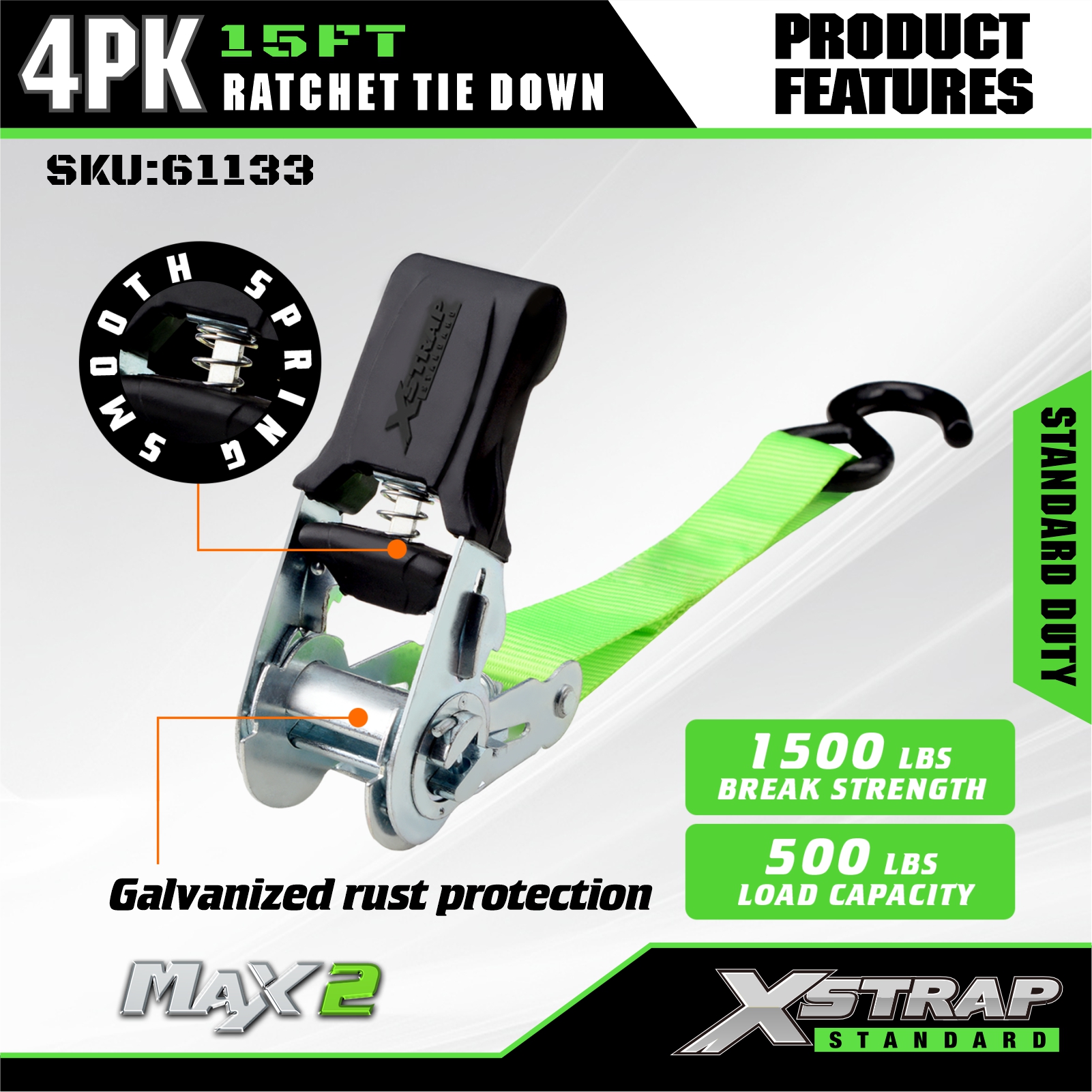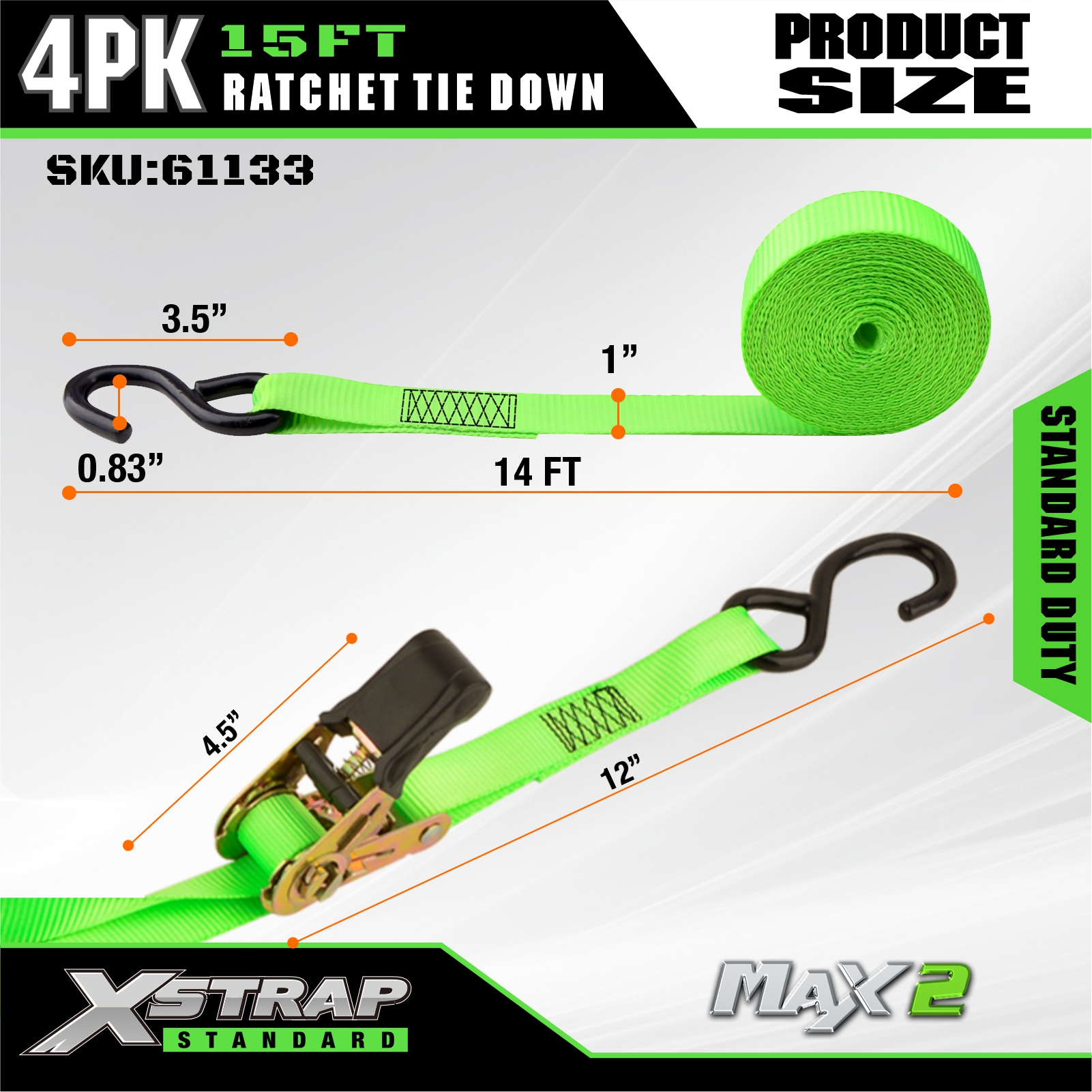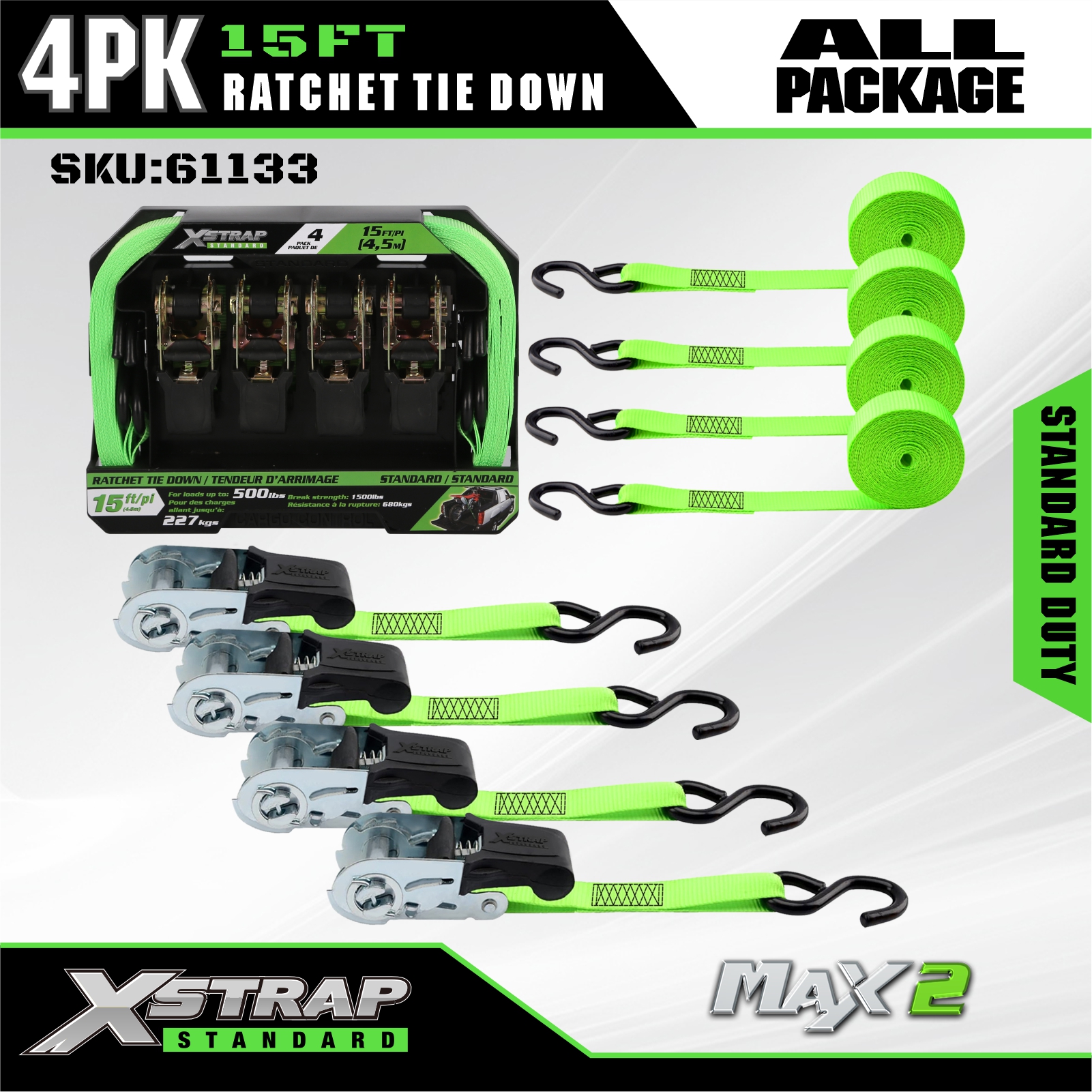 Xstrap 4 Gói Ratchet Tie Down, 1” x 15' Dây đeo bằng vải polyester buộc xuống Dây kéo Ratchet, Dây buộc chắc chắn hàng hóa có sức chứa 500 lbs với Móc chữ S dành cho Xe bán tải, SUV, Xe máy có giá để trên nóc, Thuyền đánh cá hạng nhẹ, Jet Ski, Xe trượt tuyết, Máy kéo cỏ.