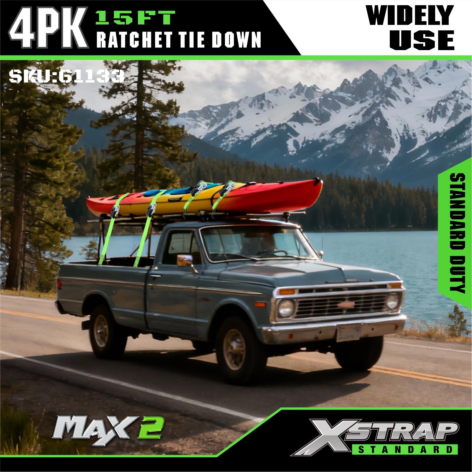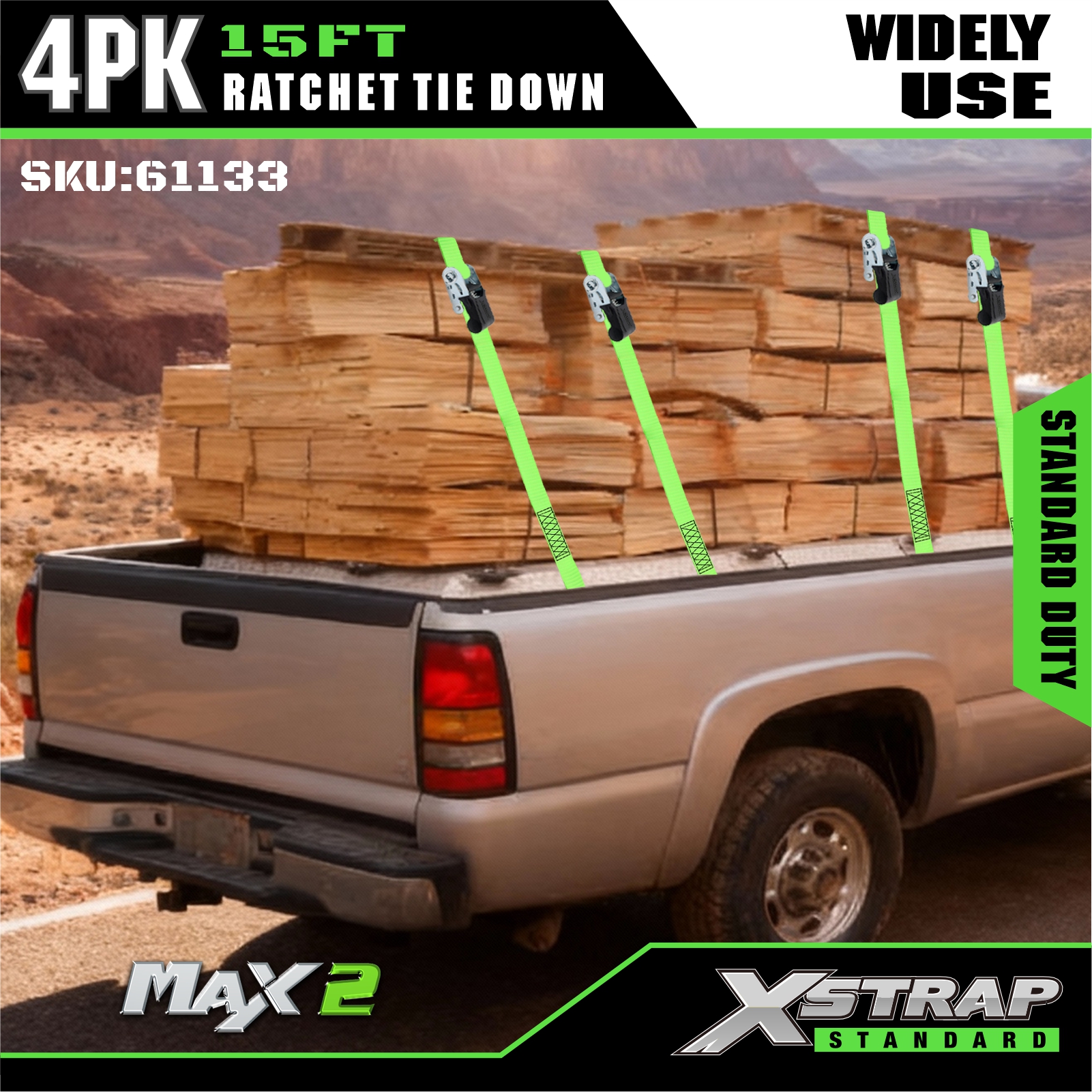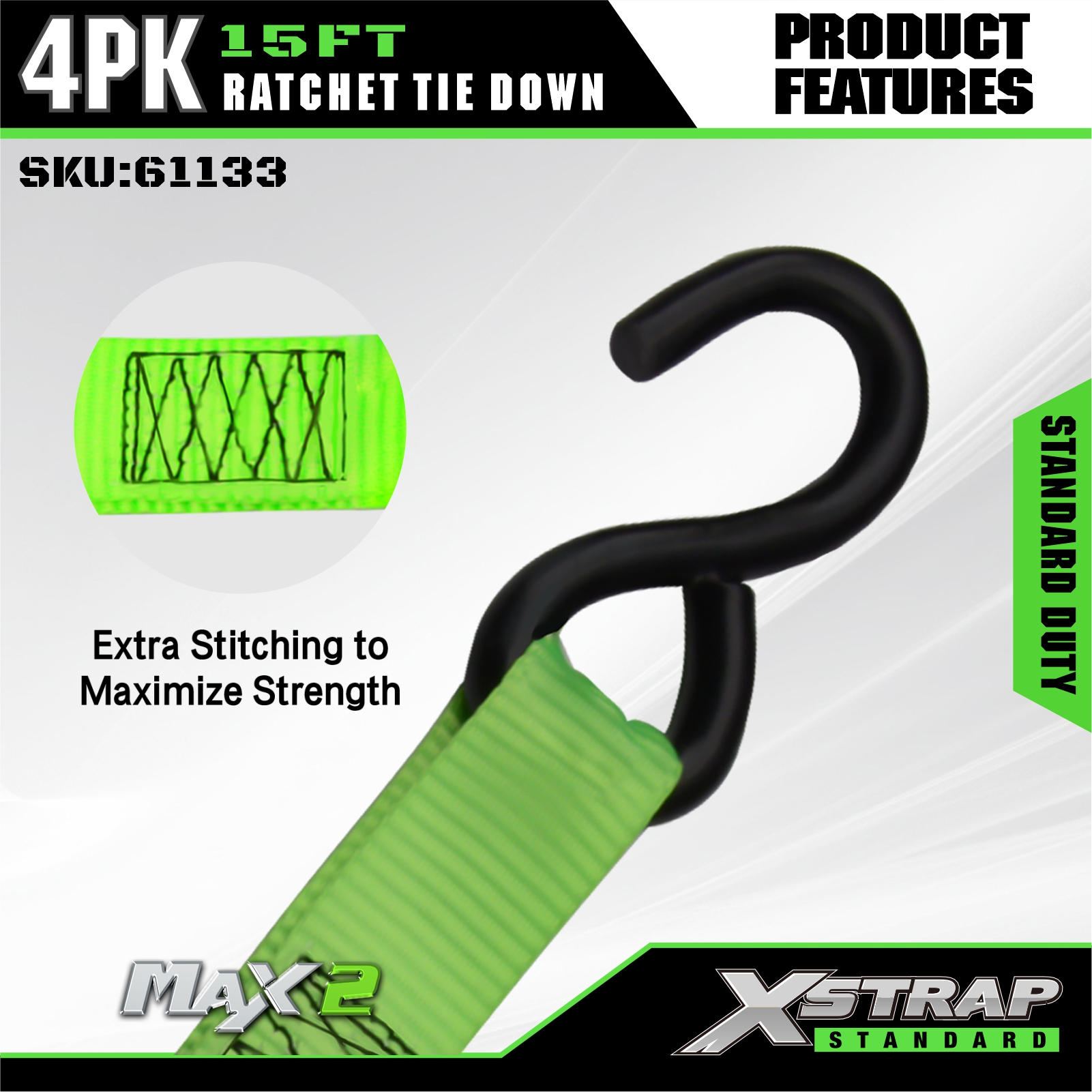 Xstrap 4 Gói Ratchet Tie Down, 1” x 15' Dây đeo bằng vải polyester buộc xuống Dây kéo Ratchet, Dây buộc chắc chắn hàng hóa có sức chứa 500 lbs với Móc chữ S dành cho Xe bán tải, SUV, Xe máy có giá để trên nóc, Thuyền đánh cá hạng nhẹ, Jet Ski, Xe trượt tuyết, Máy kéo cỏ.