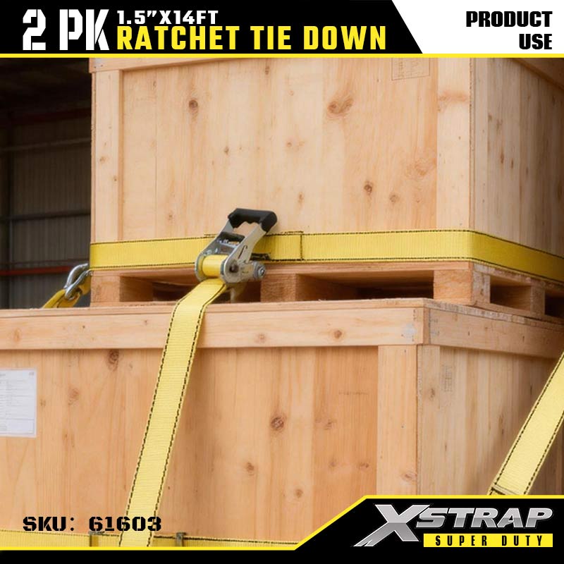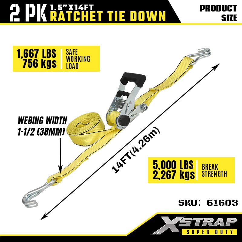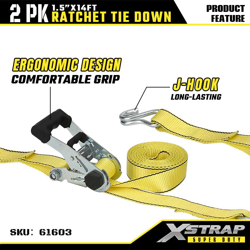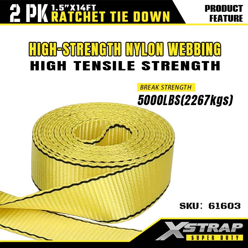 - Vải nylon có độ bền kéo cao (Độ bền đứt 5000LBS): Được chế tạo bằng dây đai nylon màu vàng có độ bền cao (chiều rộng 1,5 ") - mang lại độ bền kéo đặc biệt (tải trọng đứt 5000LBS) và khả năng chống mài mòn, lý tưởng cho các nhiệm vụ vận chuyển hạng nặng hoặc công nghiệp buộc chặt.l