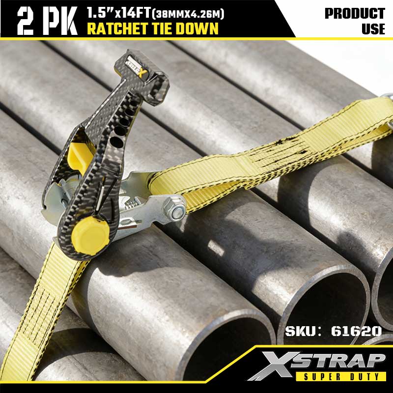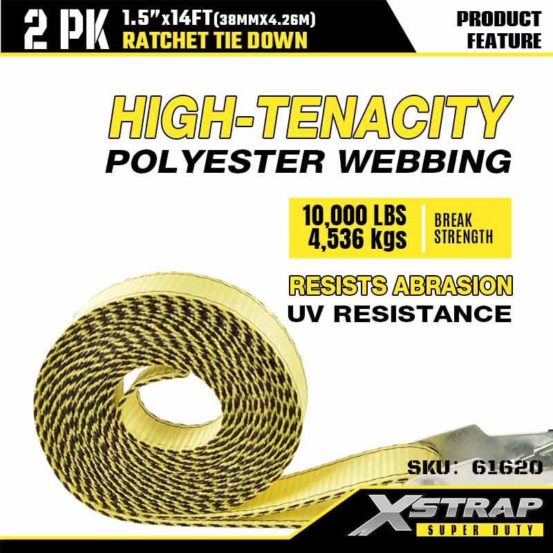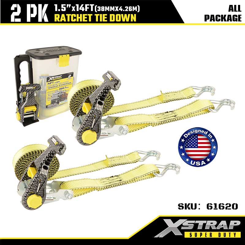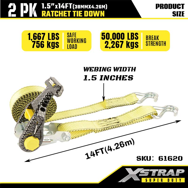 Xstrap 2PK Ratcet Tie Down với móc đôi J, 1-1/2” x 14' Polyester buộc xuống Dây đeo Ratchet, dây đai buộc hàng hóa có sức chứa 1667 lbs với móc J đôi cho xe moóc hạng nặng, thuyền trượt tuyết xe moóc giường phẳng, ô tô nhỏ, thiết bị nặng.